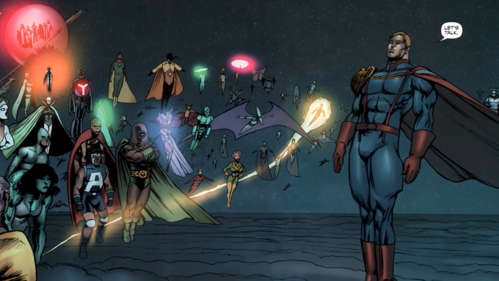 | Настройка | Современные Соединённые Штаты, где обладающие сверхспособностями «Супы» являются корпоративными активами, принадлежащими и управляемыми Vought International, в основном сосредоточенными в Нью-Йорке. |