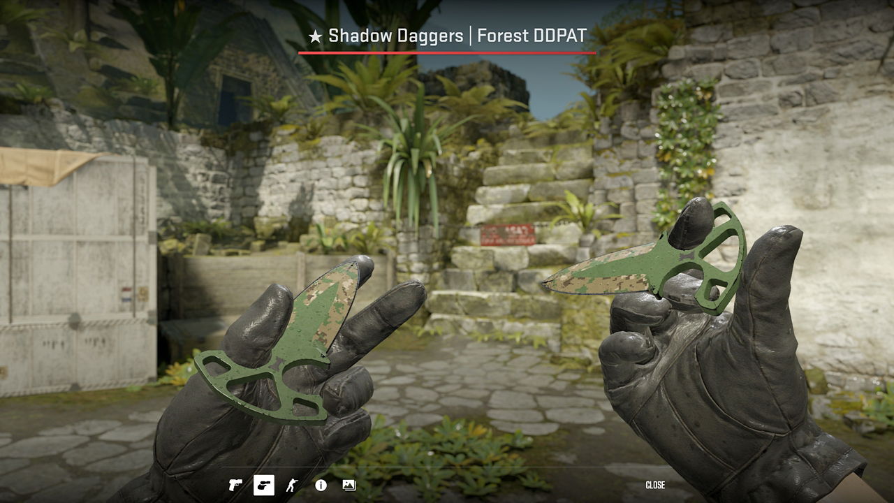 Shadow Daggers выделяются благодаря возможности владения двумя клинками и отличительным анимациям. Их Forest DDPAT покрытие помогает сохранять их относительно доступными по цене, особенно по сравнению с более яркими скинами, такими как Urban Masked или Fade.