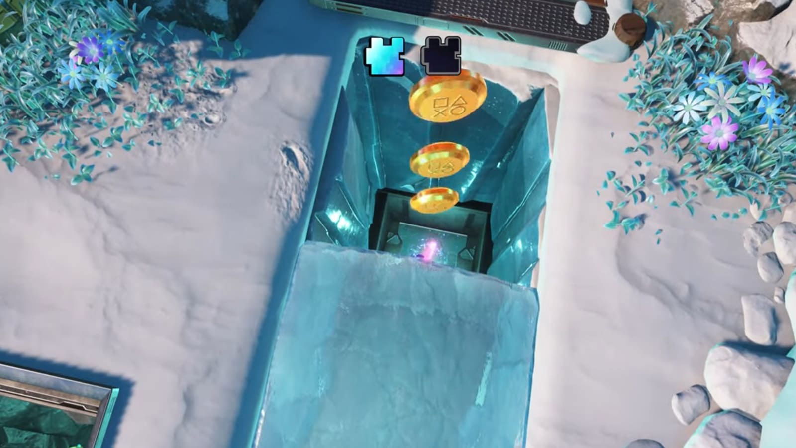 Используя поднятую ранее платформу, потянув за ручку справа, поднимитесь на самый высокий уровень горы. С правой стороны вы увидите синюю цепочку. Потяните за цепь, и под поверхностью появится гигантский снеговик.