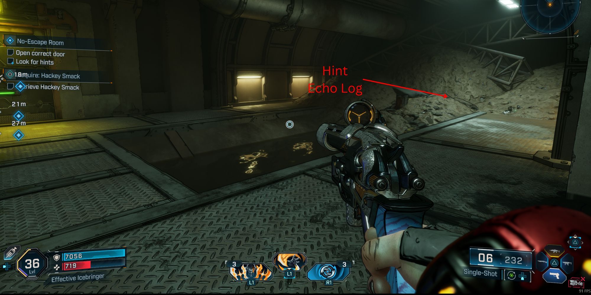 Если вам нужно больше подтверждений того, что это правильная дверь, вы также можете найти подсказку Echo Log в комнате. Вы найдете эту подсказку среди завалов справа от дверей.