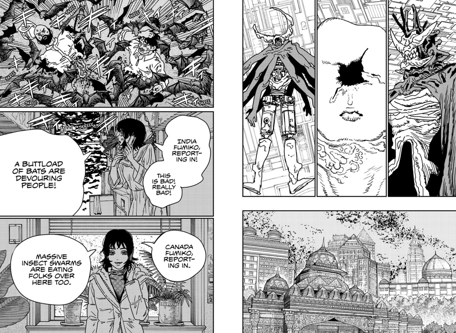 Давайте обсудим ключевой момент в главе 230 Chainsaw Man. Мир истории стремительно погружается в хаос. Глава фокусируется на небольших, кажущихся незначительными деталях – например, на признании Денджи своего одиночества и коротком воспоминании о ком-то, кто заботился о животных. По мере того, как мир все глубже погружается в беспорядок с исчезновением ‘Death’, мы видим повсеместную вспышку Дьяволов. В главе конкретно изображены огромные рои летучих мышей, появляющиеся в Индии, нападающие и пожирающие людей.
