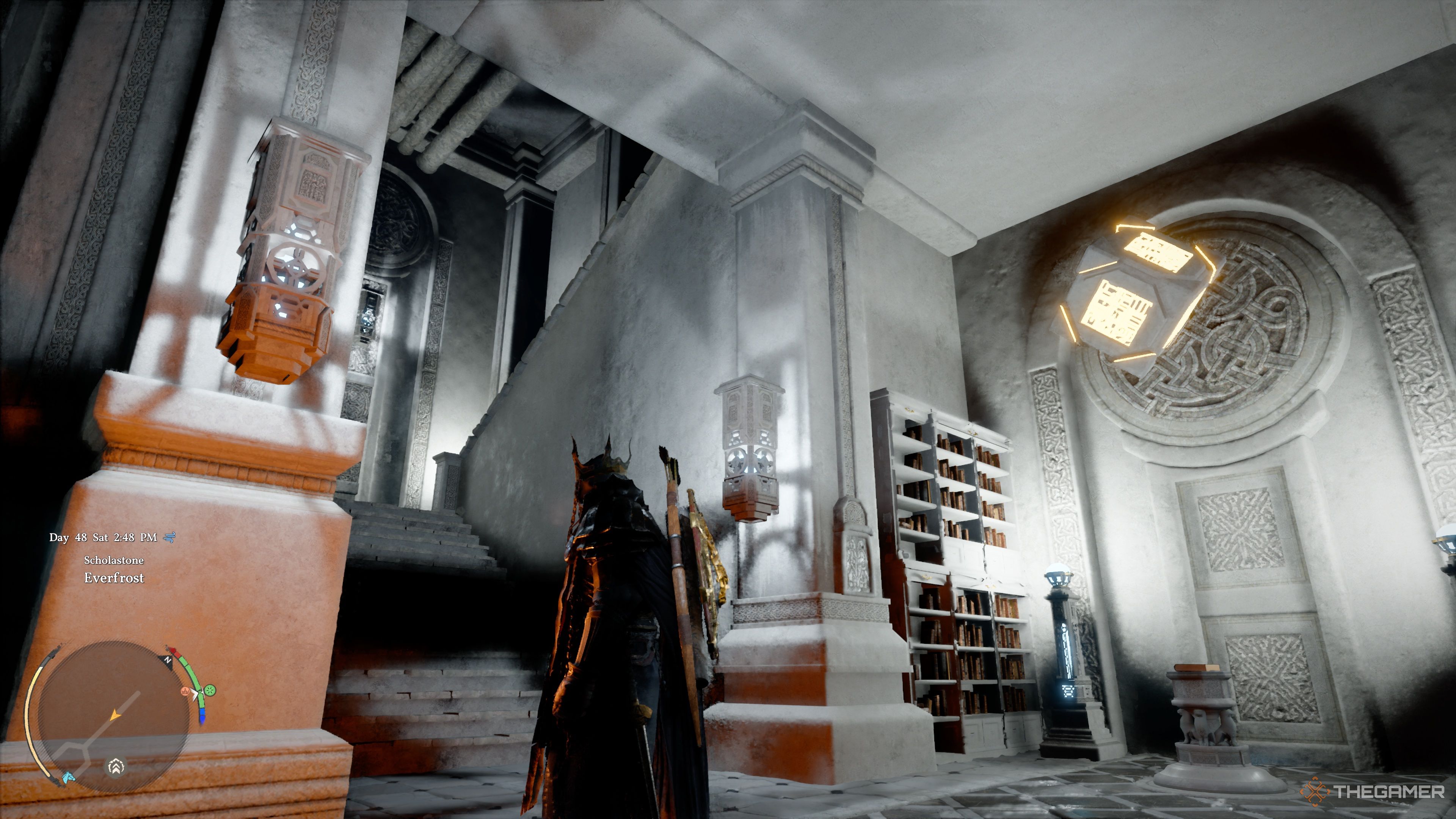 Как только вы доберетесь до второго этажа, направляйтесь направо и продолжайте движение по этому коридору, пока не упретесь в тупик рядом с книжным шкафом.