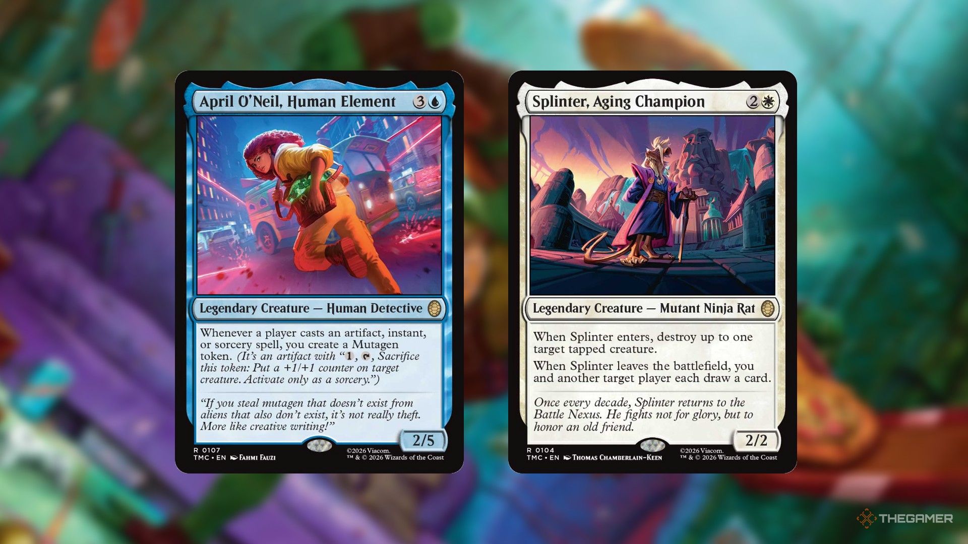 Каждая колода возглавляется одним из Черепашек-ниндзя и также включает в себя могущественное легендарное существо в качестве поддержки. Мы уже знаем, что Белую колоду будет поддерживать Сплинтер, Стареющий Чемпион, а Синюю колоду – Эйприл О’Нил, Человеческий Элемент.
