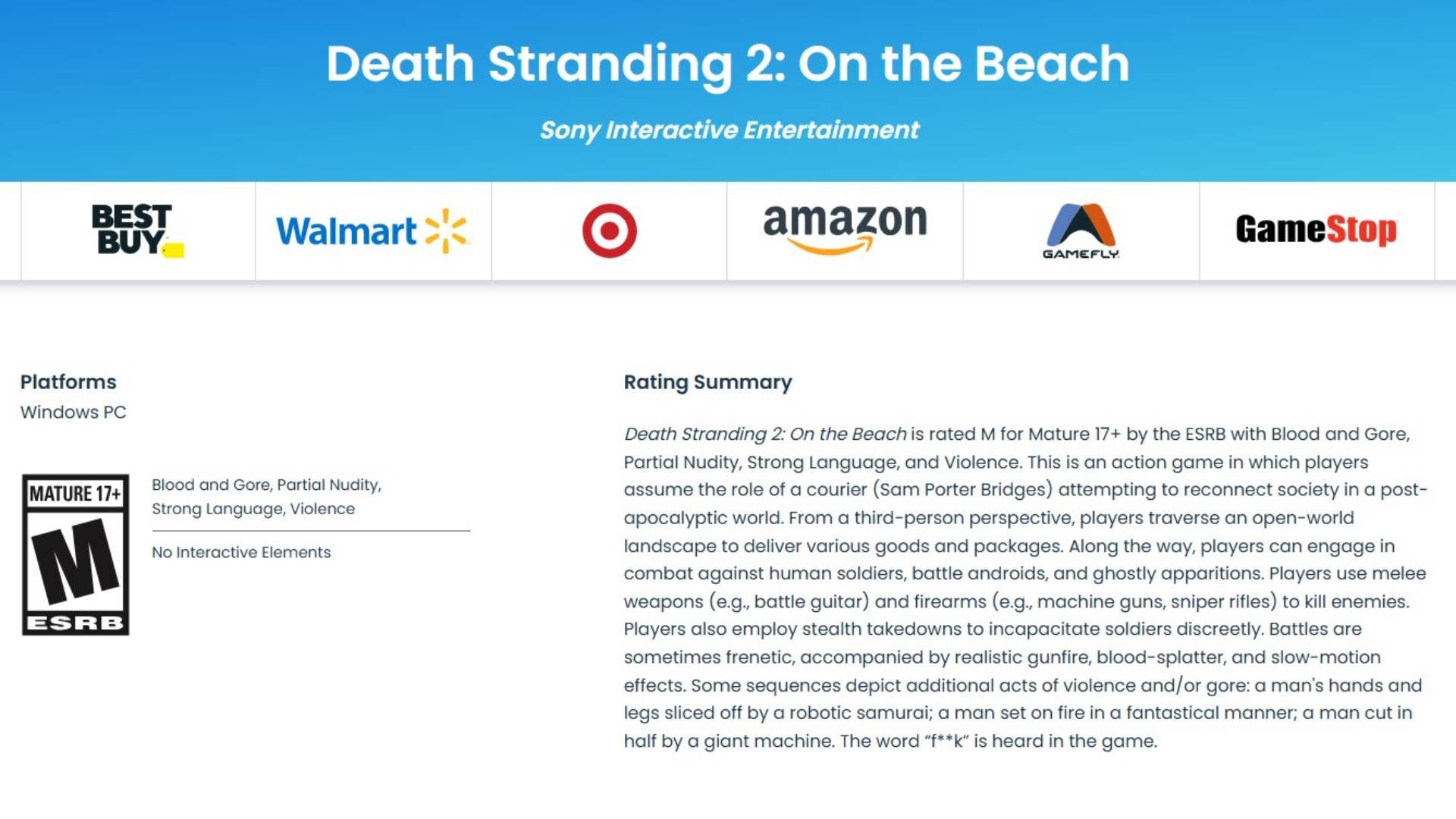 Прочитать отчет 10-KDeath Stranding 2 получила возрастной рейтинг для Windows PC, что говорит о скором релизе. Хотя PC-версия ожидалась, это происходит быстрее, чем многие предполагали – первой игре потребовалось почти два года, чтобы совершить этот переход. Дата выхода пока не объявлена, но разработка, похоже, продвигается быстрыми темпами.