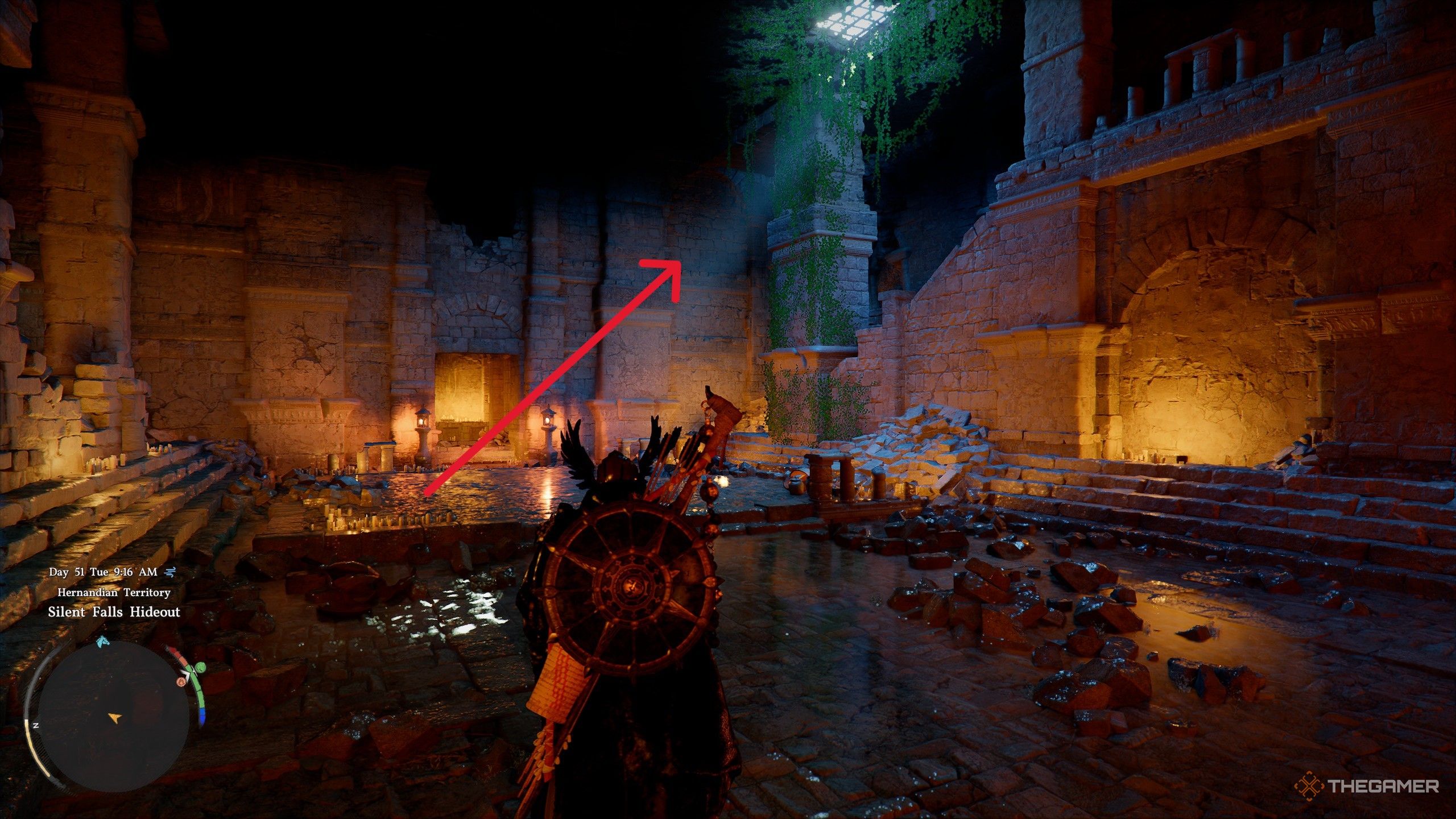 После победы над Grave Walker, направляйтесь в верхний правый угол комнаты (как показано на изображении). Нажмите на левый триггер, чтобы воткнуть нож в стену, затем используйте удар Force Palm против него. Это откроет скрытый проход, ведущий в секретную камеру, где вы найдете Scorchflame Plate Cloak внутри сундука.