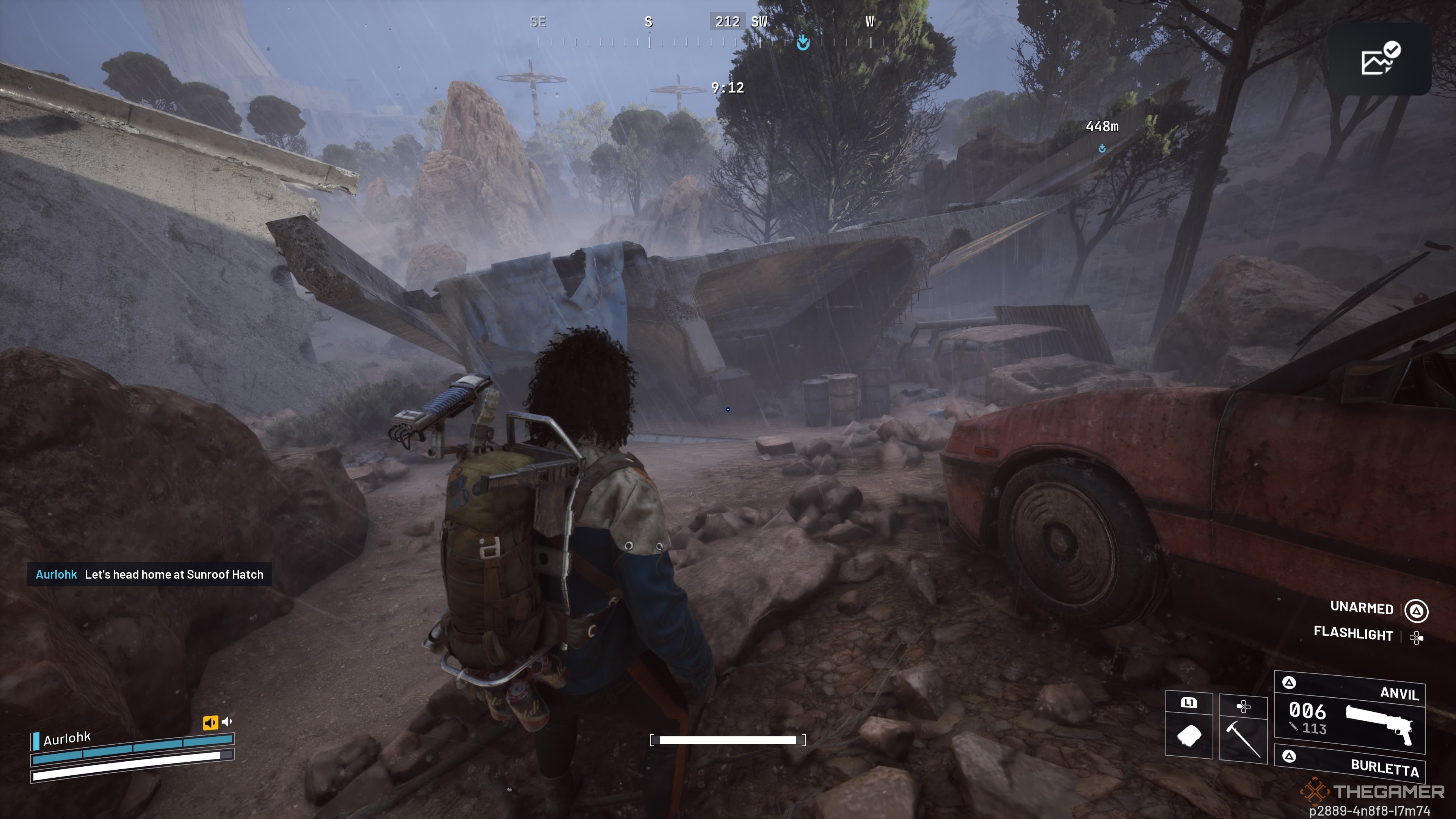 Окей, когда я ищу это место, я всегда направляюсь к скоплению разбитых машин и большим кускам шоссе в первую очередь. Затем я просматриваю эти обломки в поисках тех, вокруг которых много ржавых бочек и синий брезент, натянутый в качестве небольшого импровизированного шатра. Обычно там оно и находится!