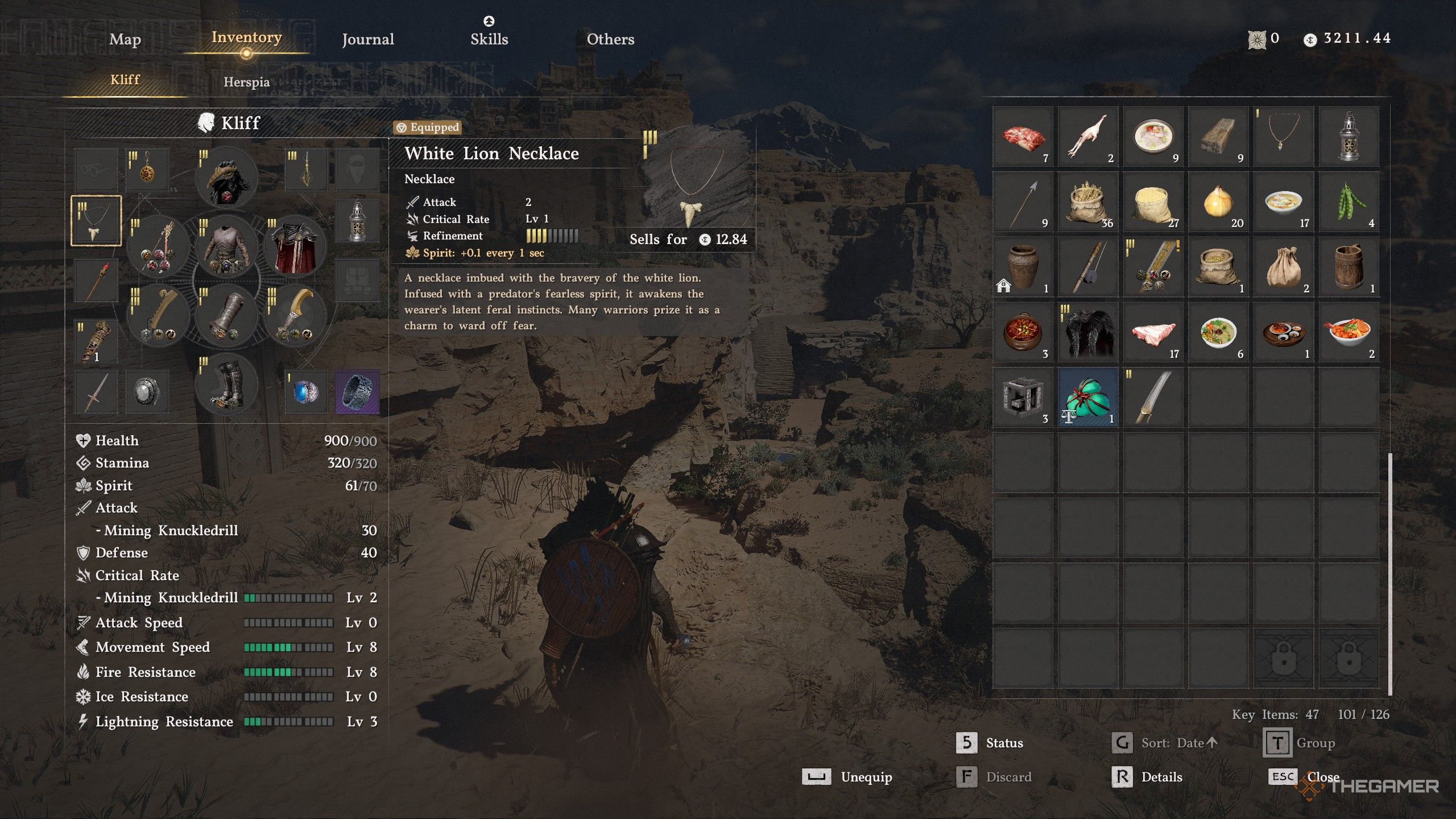 После того, как вы победите Белого Льва, обязательно снимите с него шкуру. Вы получите Ожерелье Белого Льва, которое сможете надеть в любое время. Находясь на плато, также поищите залежь Алмазов – этот редкий материал необходим для улучшения вашего снаряжения!