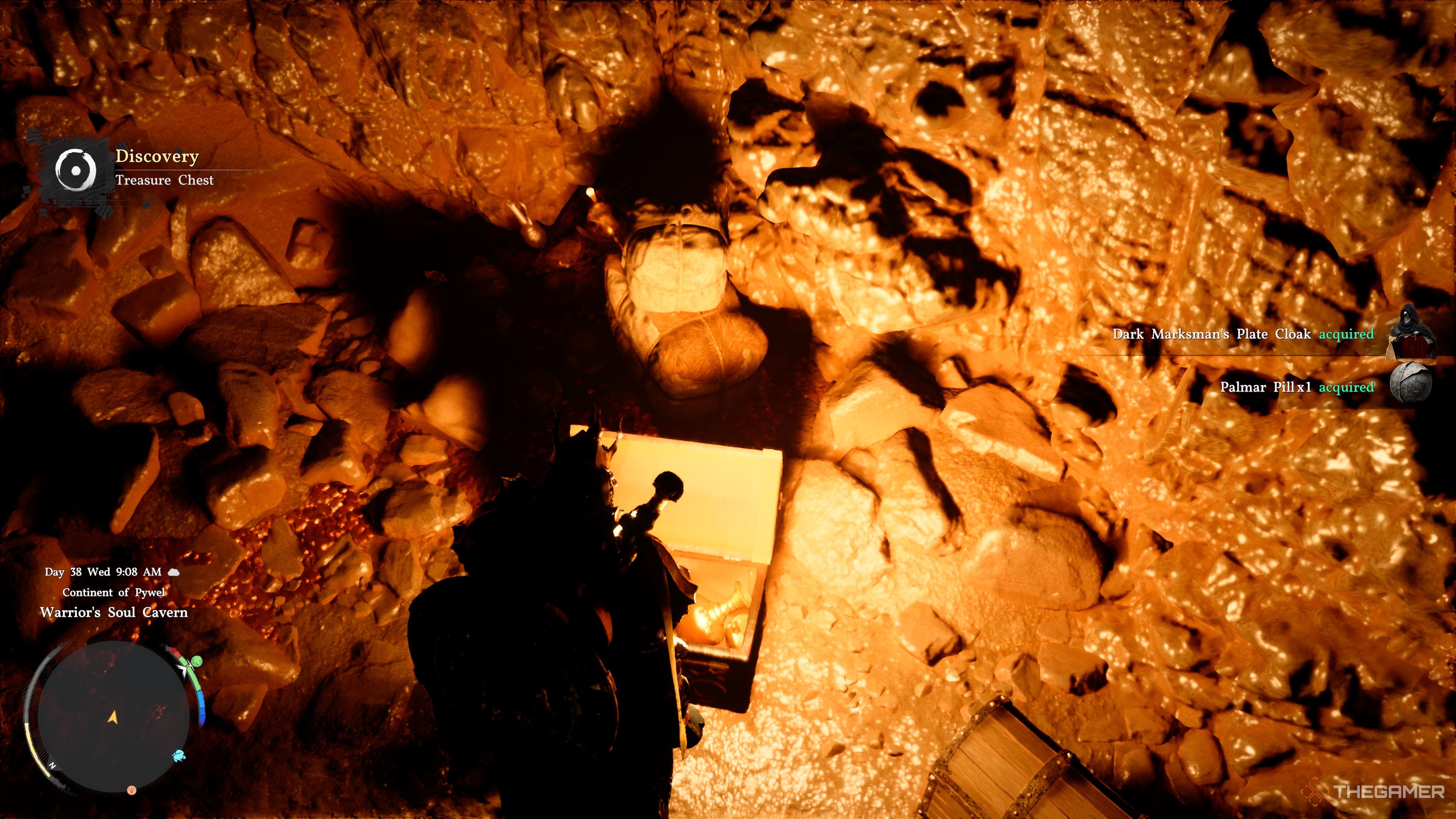Продолжайте по проходу до конца пещеры. Там вы обнаружите сундук с сокровищами, содержащий Плащ темного стрелка и Пальмерскую пилюлю.