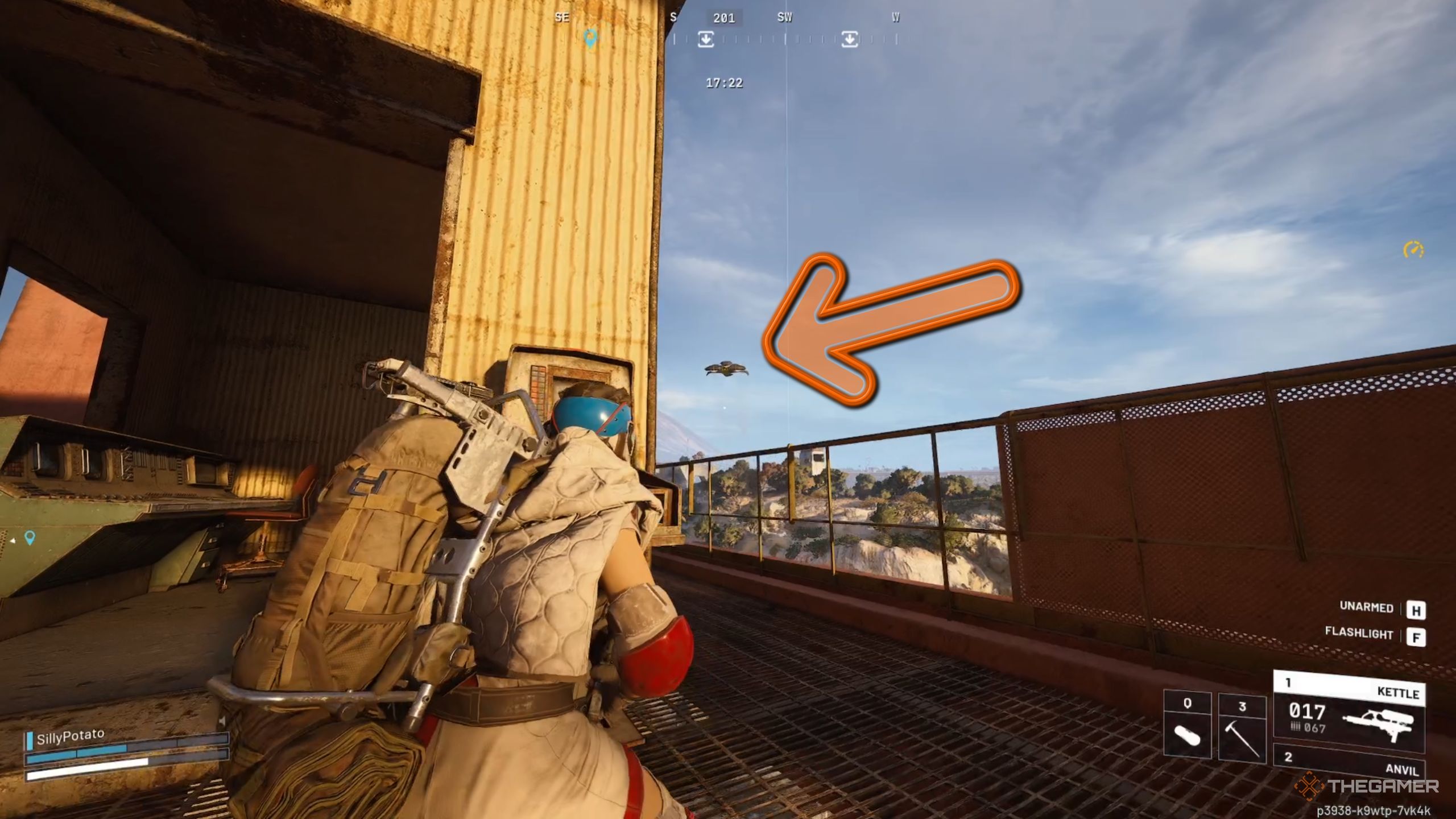 Когда вы будете облетать краны, вы увидите небольшие конструкции, сбалансированные на тонких проводах – именно их вам нужно найти. Когда вы приблизитесь к одной из опорных стоек этих конструкций, вы сможете использовать свой Arc Alloy для её починки.