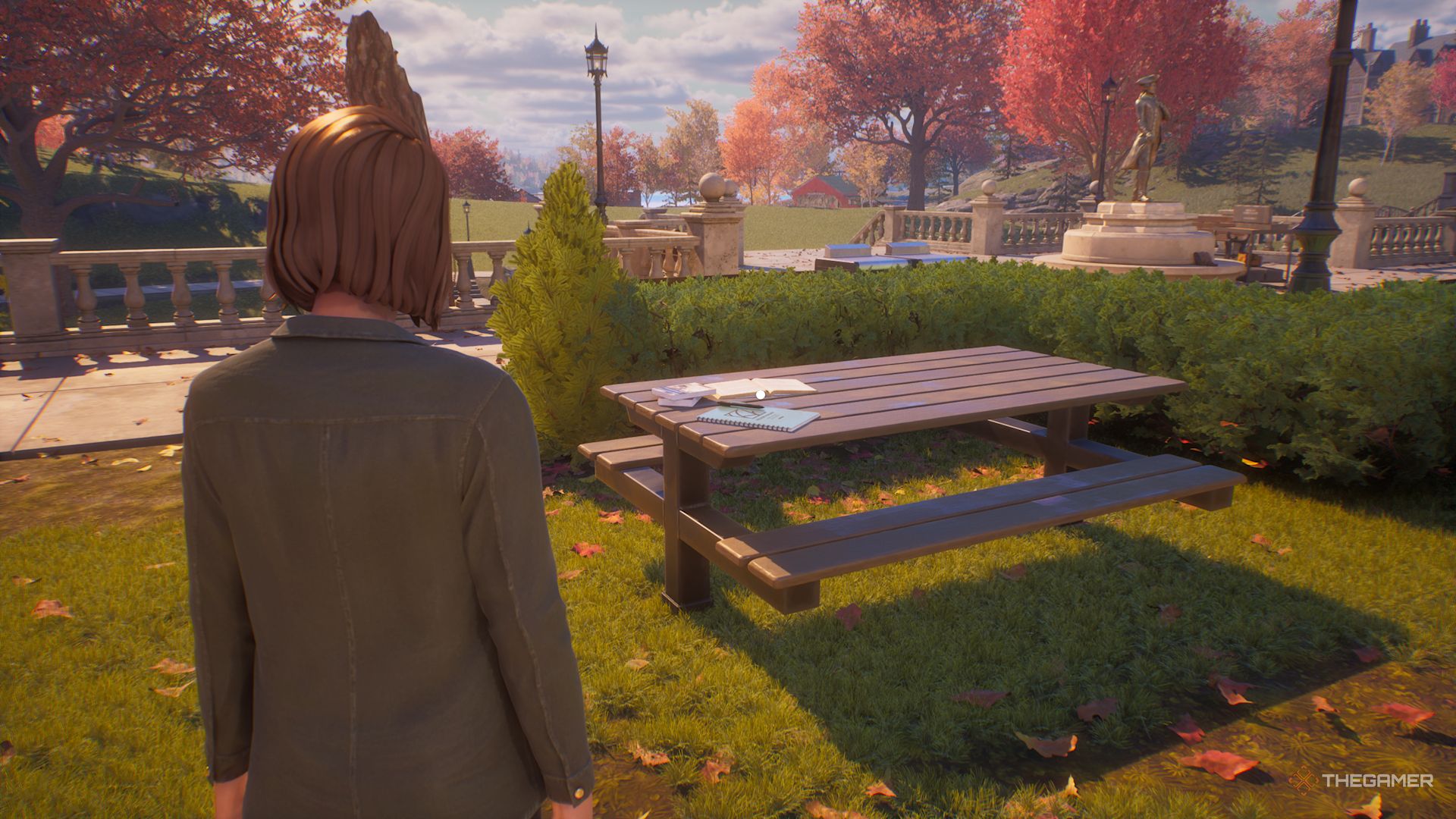 Пока он делает фотографию, вы можете посмотреть его заметки, которые лежат на столике для пикника поблизости. Игра проведёт вас к ним.