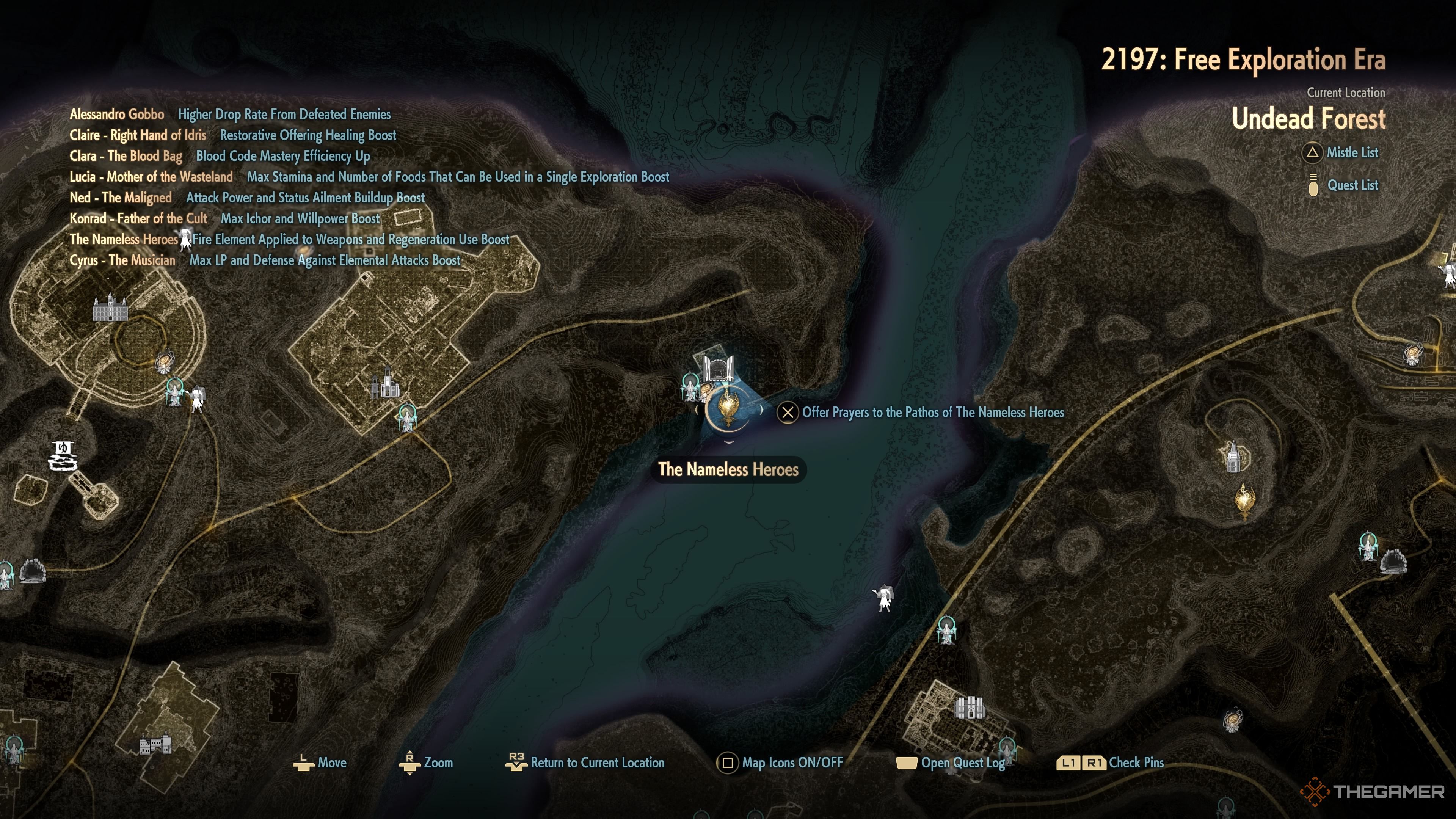 Вы можете найти Безымянных Героев в руинах Церкви на Берегу, расположенных вдоль берега в северо-восточной части области. Они могут добавить огненный урон вашему оружию и дать вам дополнительное использование вашей способности к регенерации.