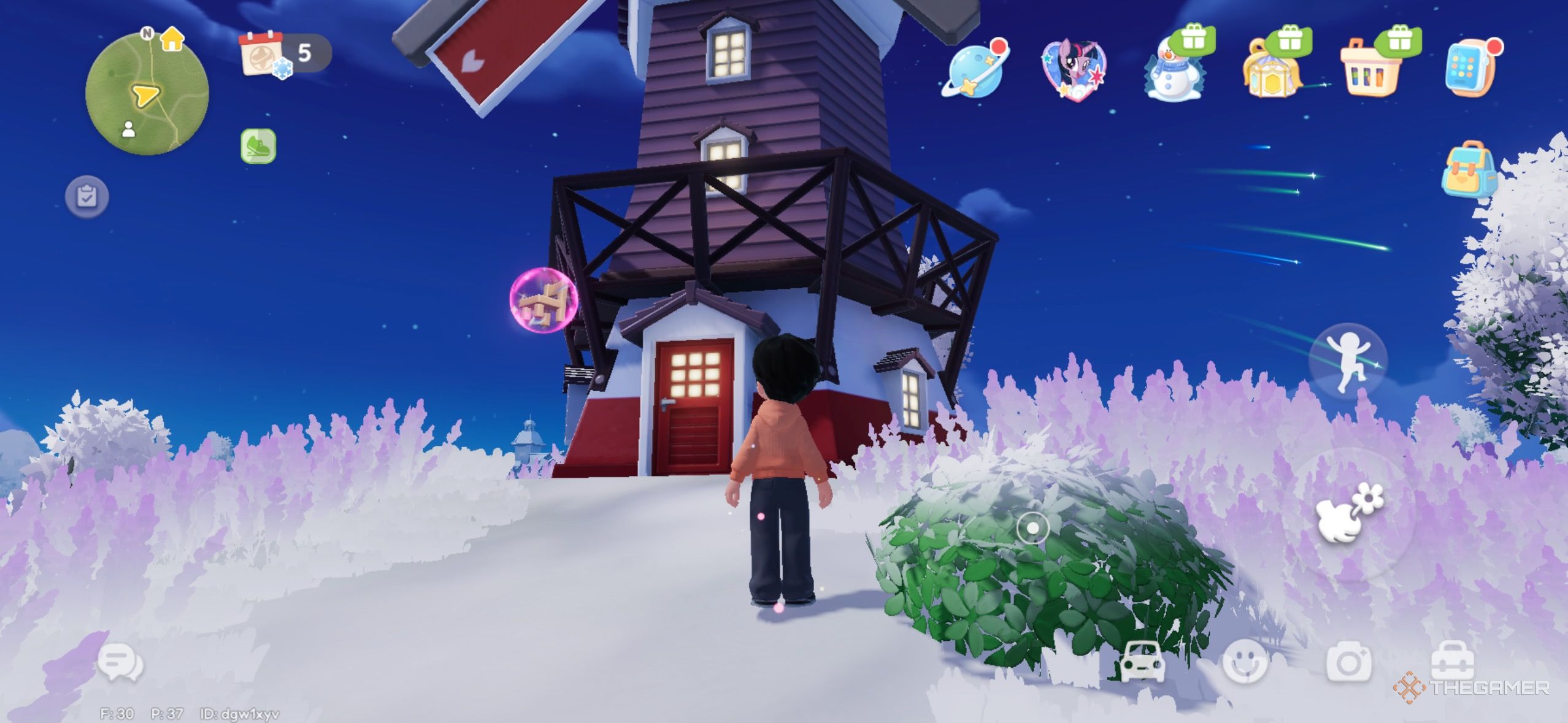 На Поле Ветряных Цветков есть несколько Ветряных мельниц. Та, что ближе всего к участкам Один и Два, окружена розовым пузырем. |