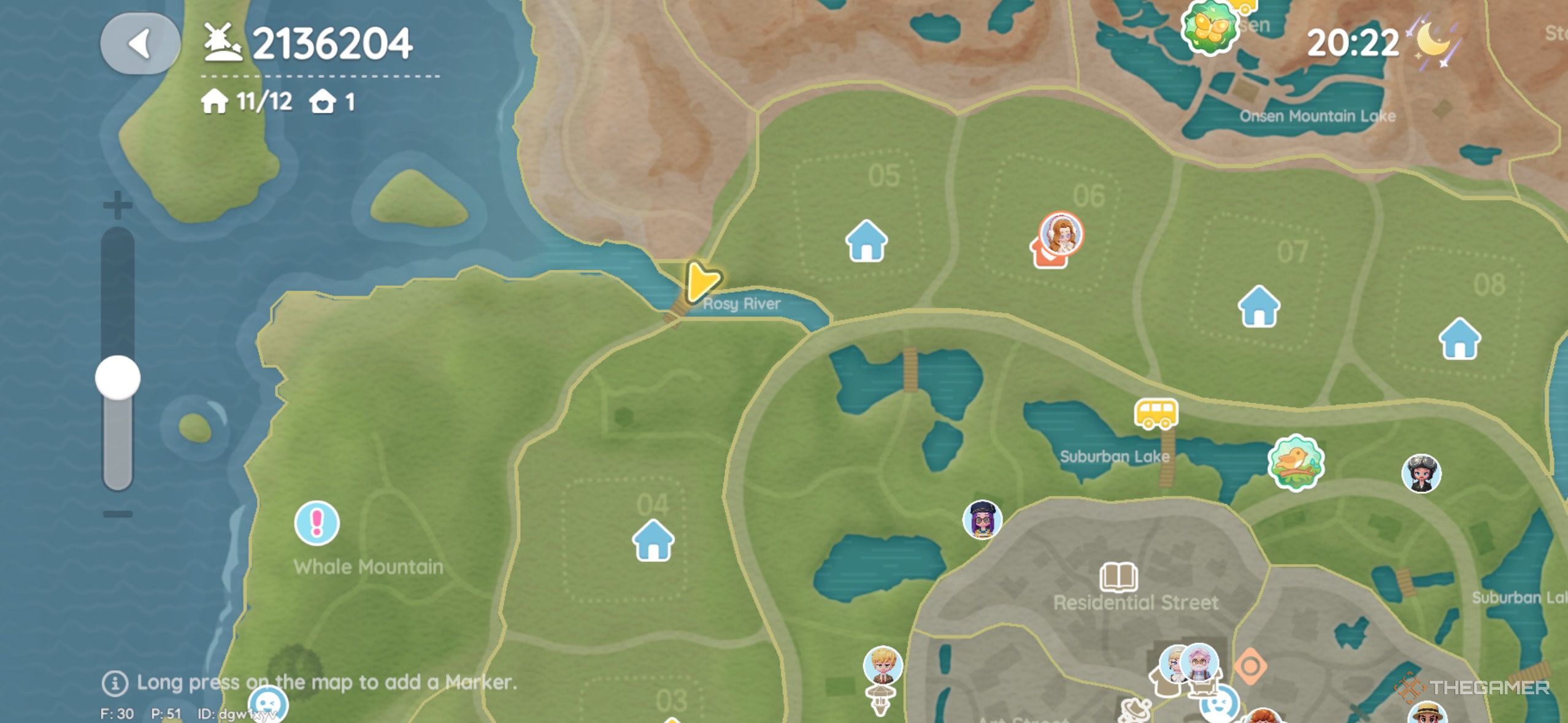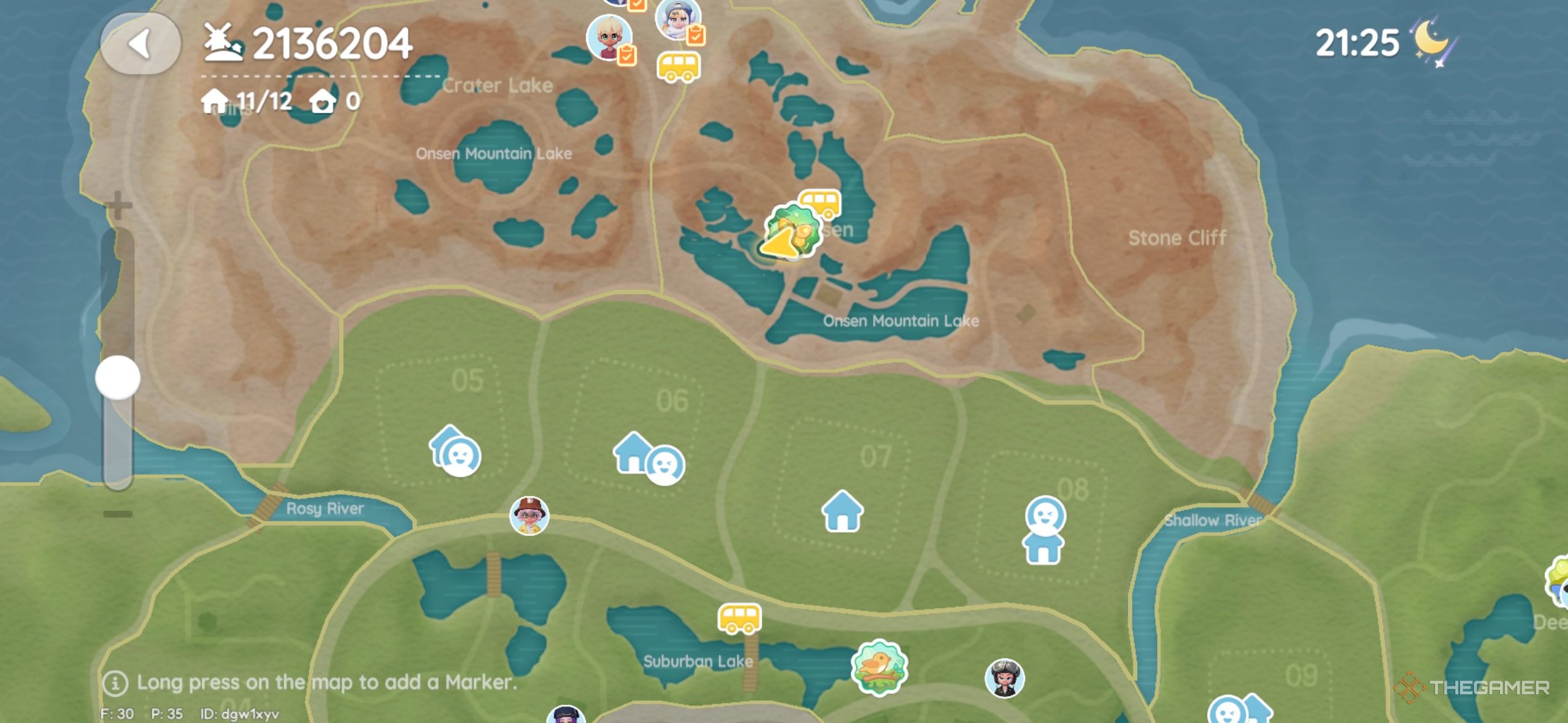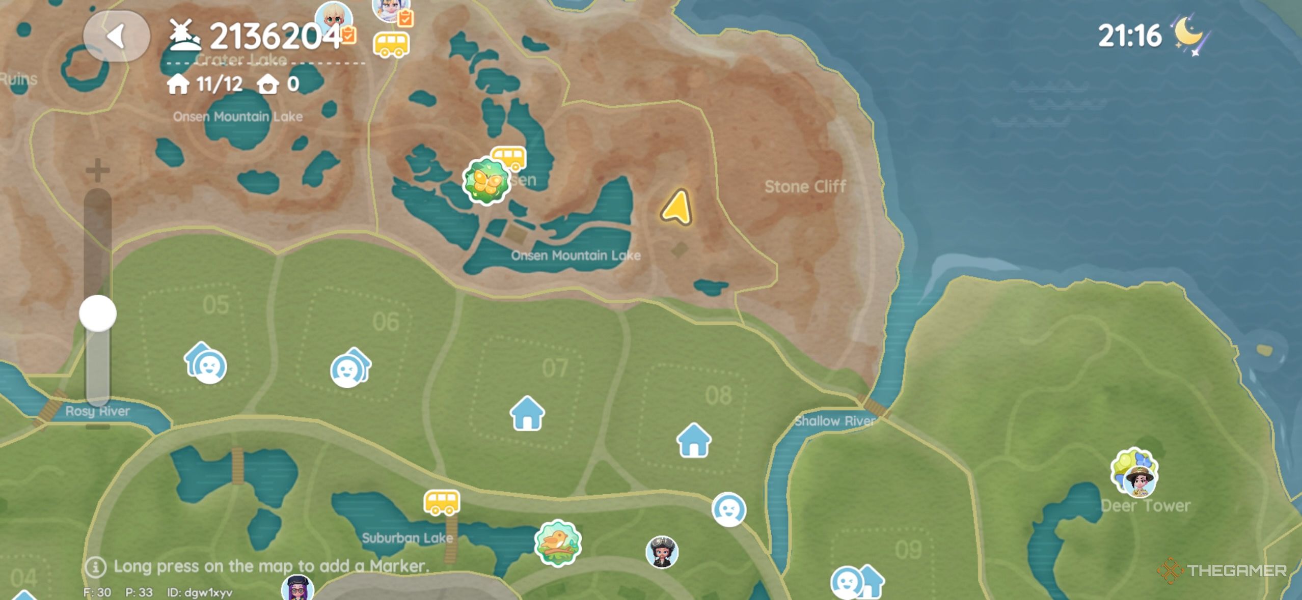 Ещё один розовый пузырь находится в горной местности в верхней части карты. Вы можете найти его над водоёмом, который находится рядом с автобусной остановкой Onsen Mountain. |