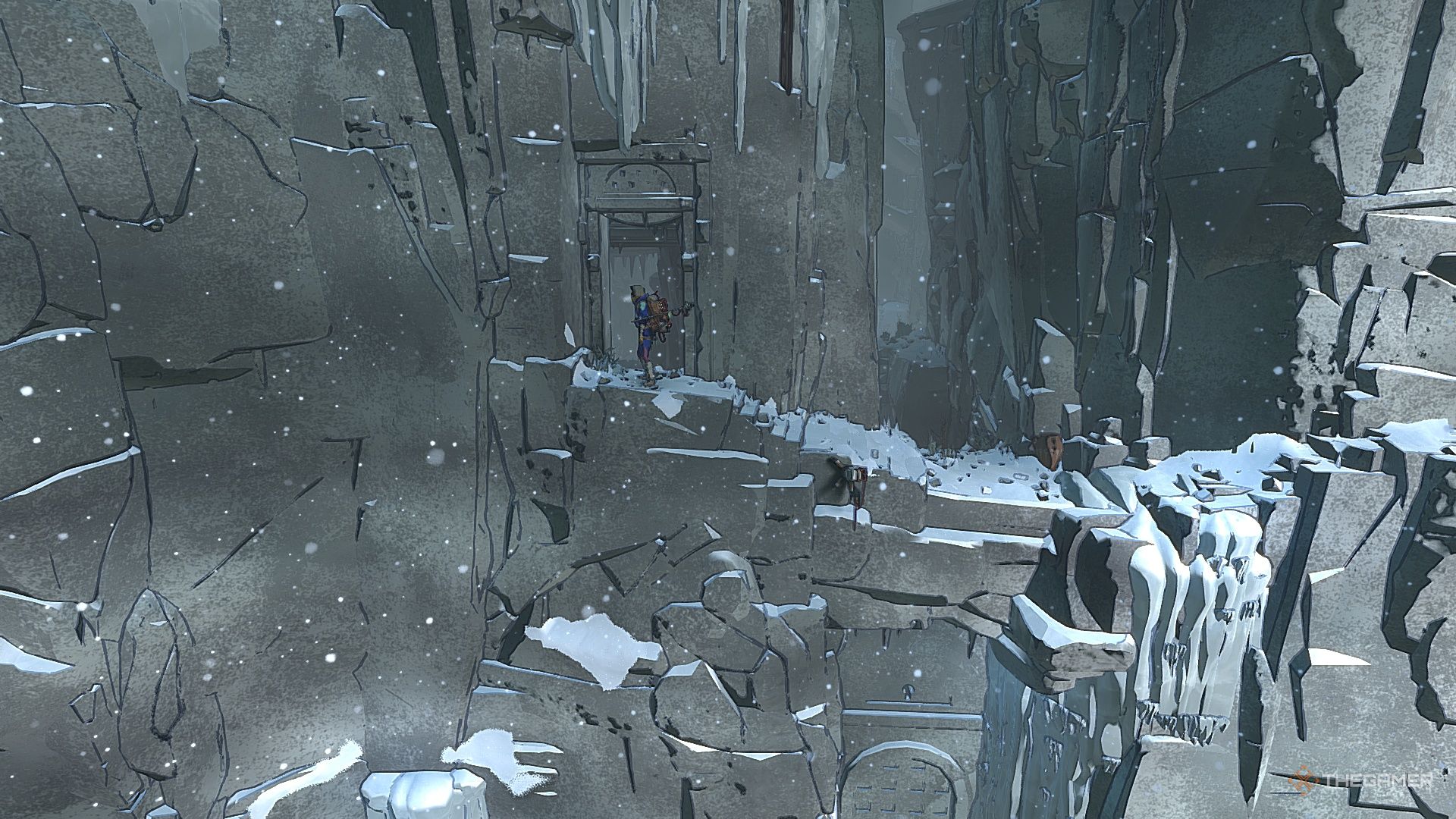 Вы окажетесь возле огромного, замерзшего водопада. Там есть ещё один вход на самом верху, поэтому взберитесь наверх и пройдите через него.