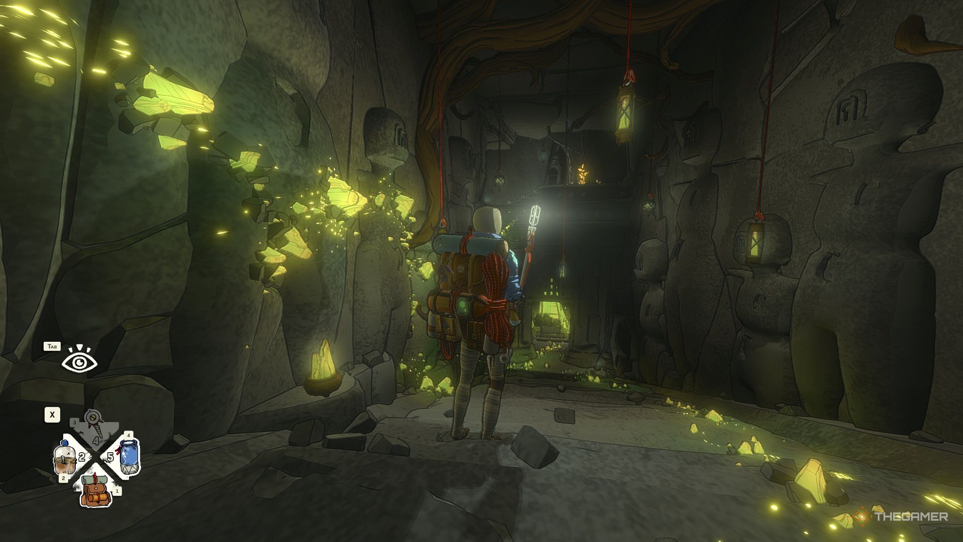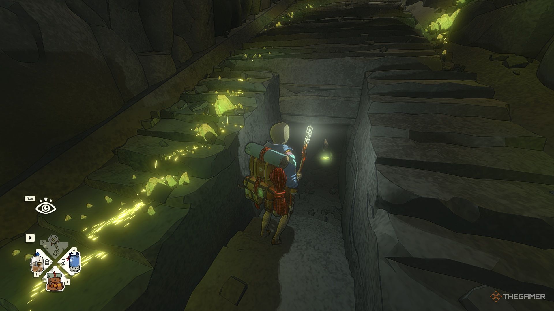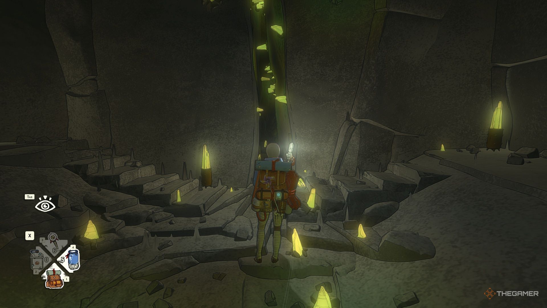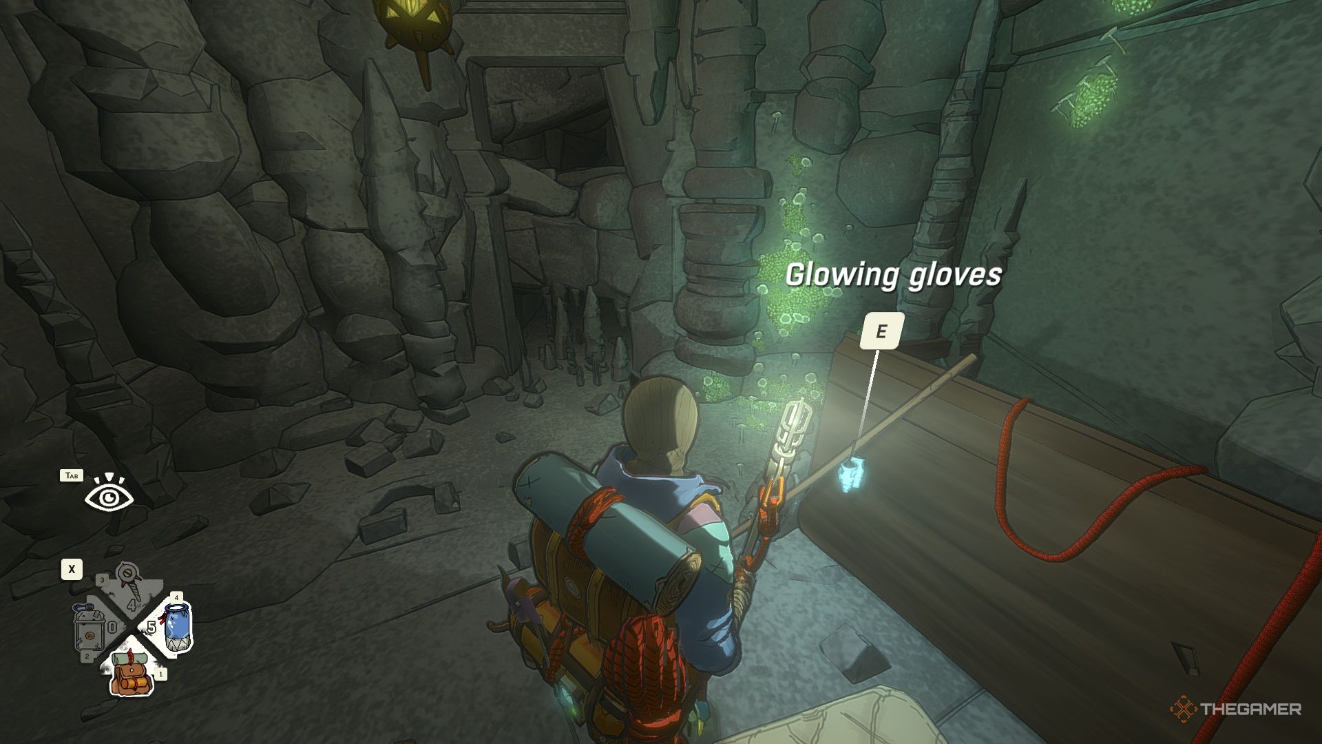Перчатки находятся наверху. Чтобы до них добраться, вам нужно будет пролезть через отверстие в потолке. Самый простой путь наверх — найти тропу с наименьшим количеством кристаллов, преграждающих вам путь.