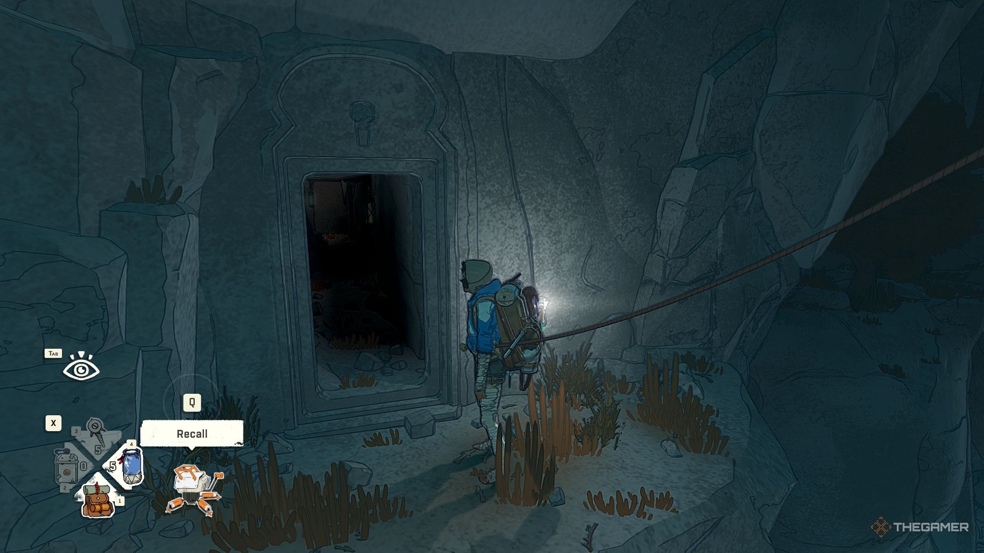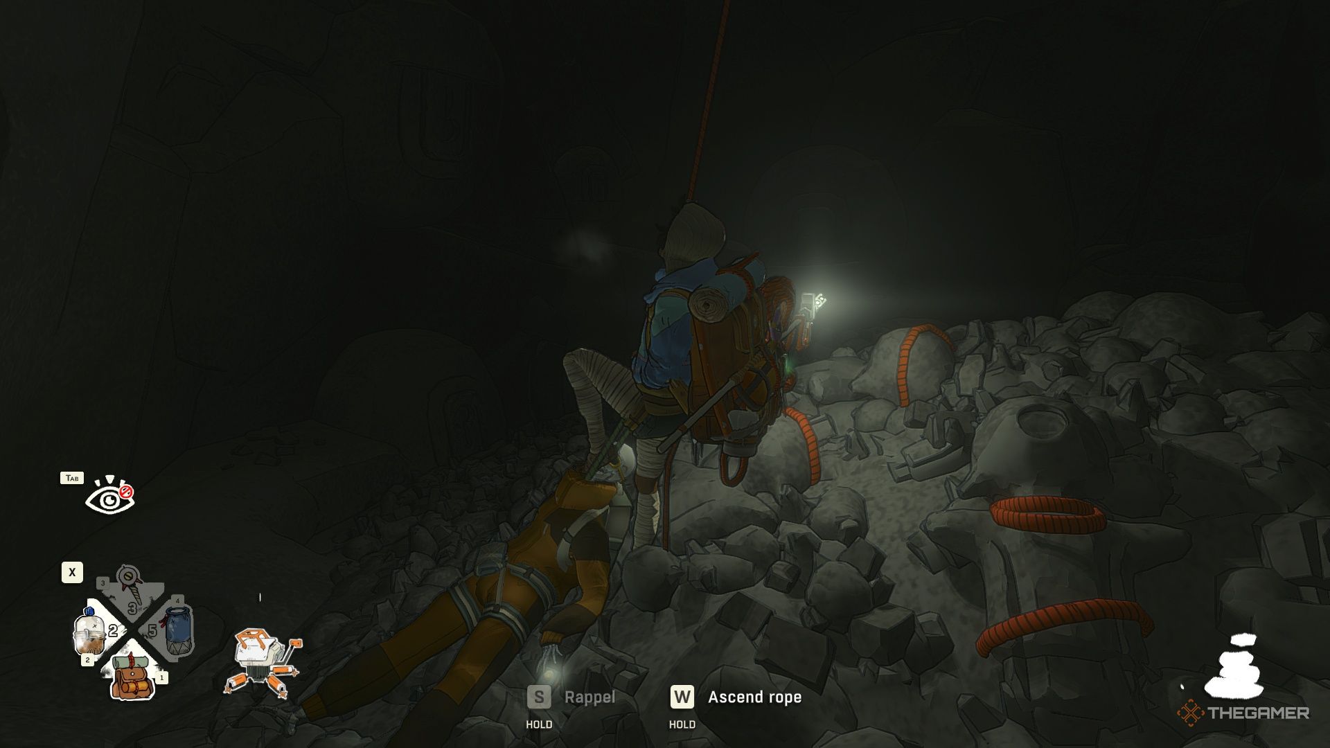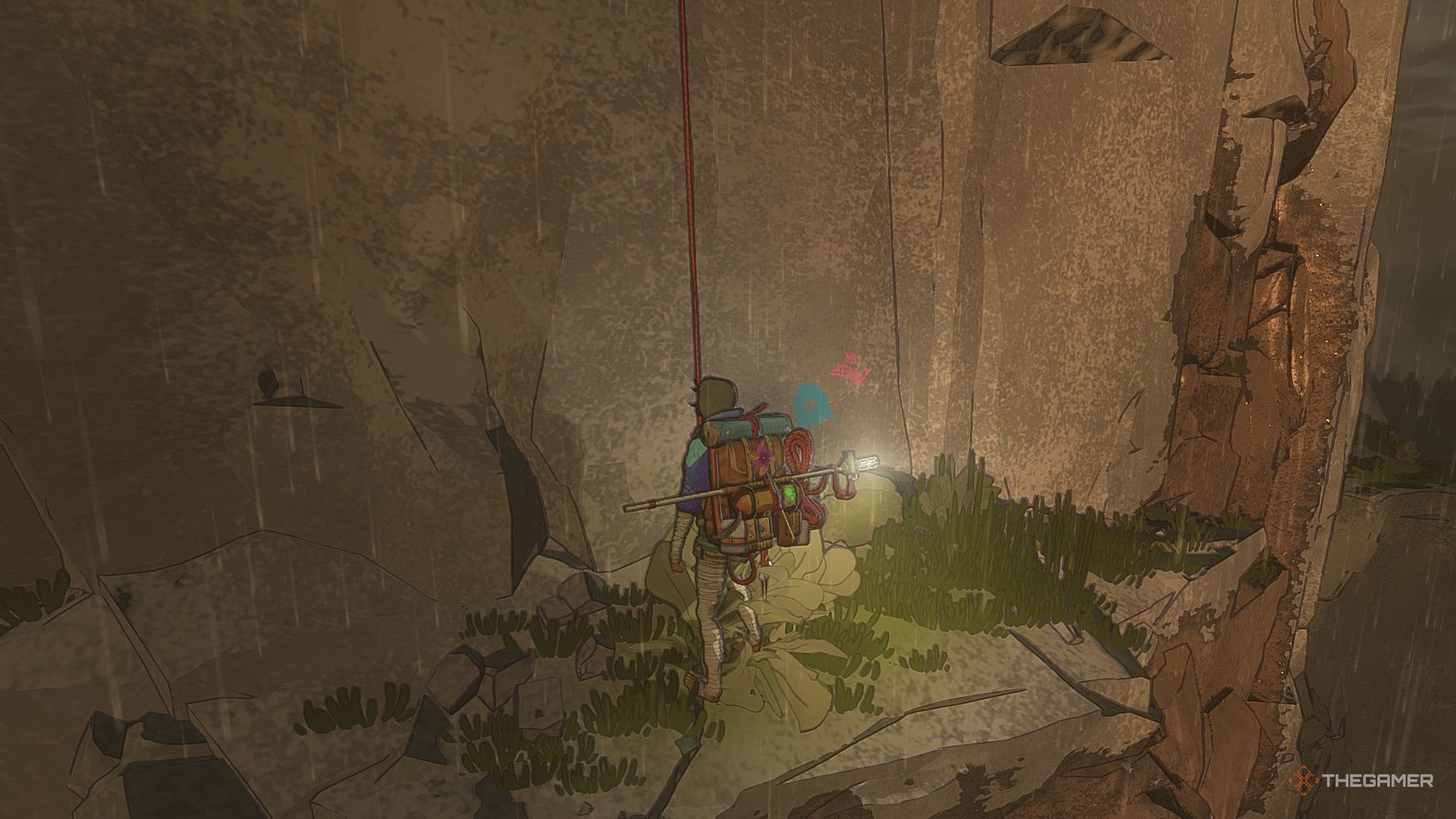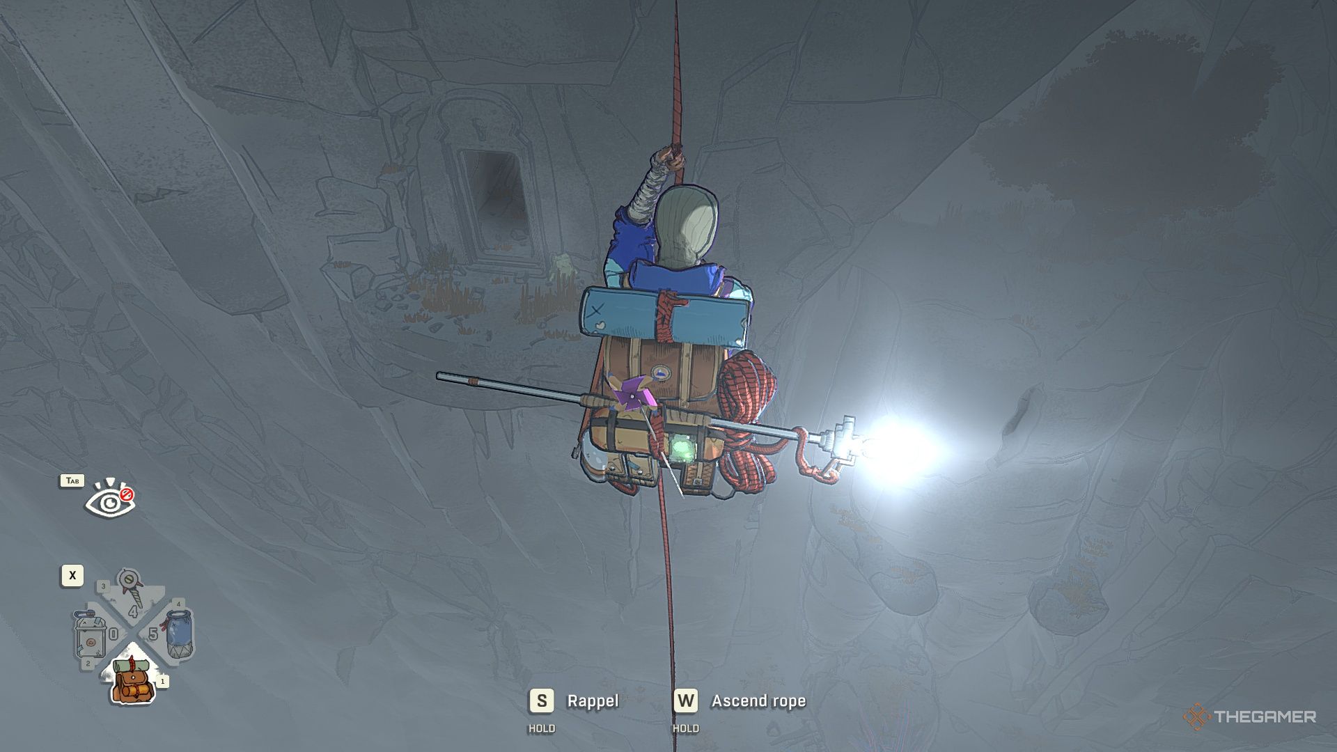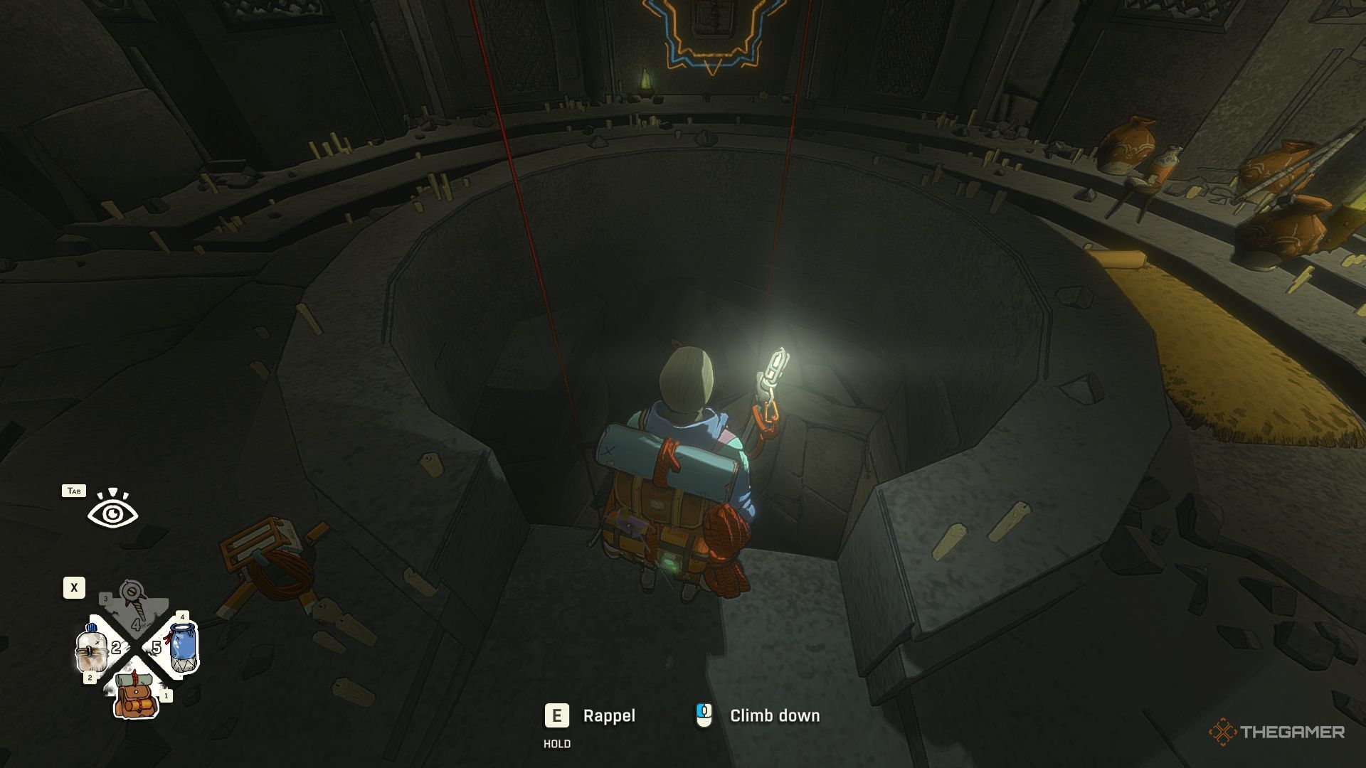 Далее, осторожно обойдите шип, затем закрепитесь на стене и спуститесь, используя веревку.