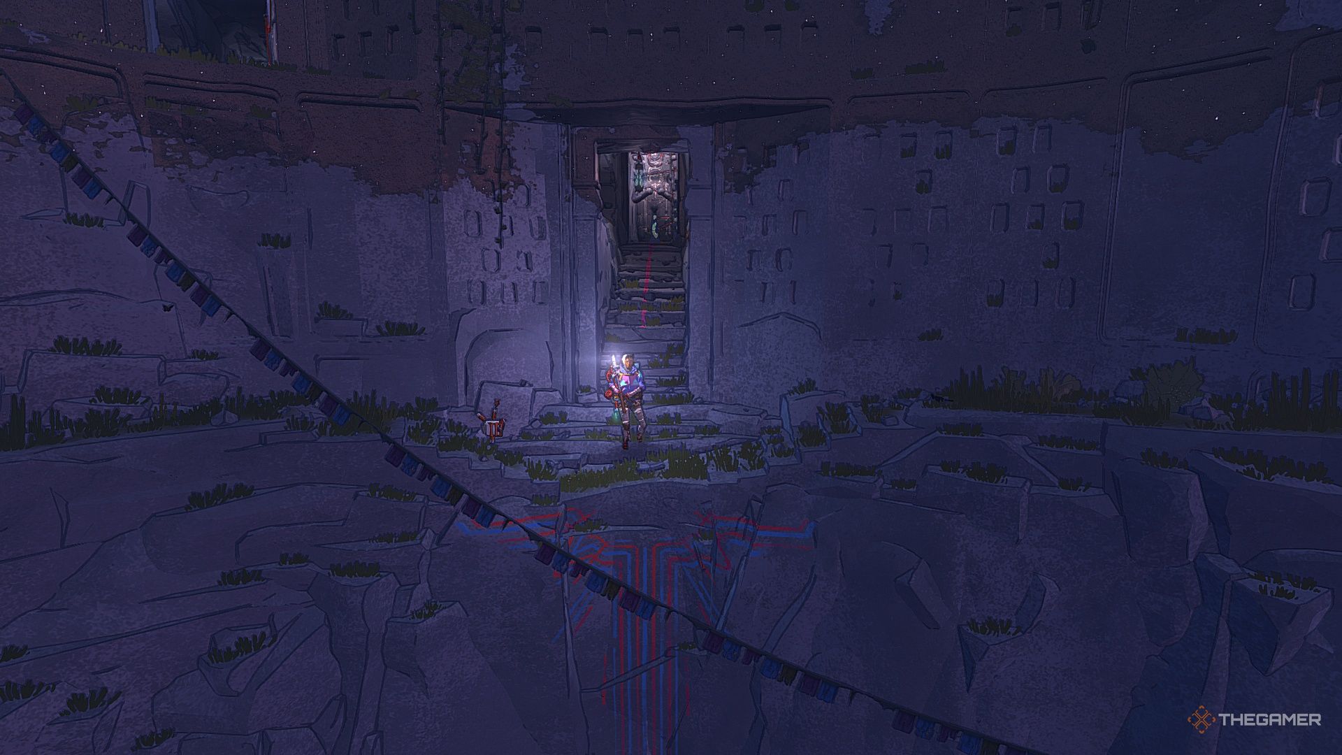 Находясь в локации The Village, пройдите через дверной проём прямо над красной и синей линиями.