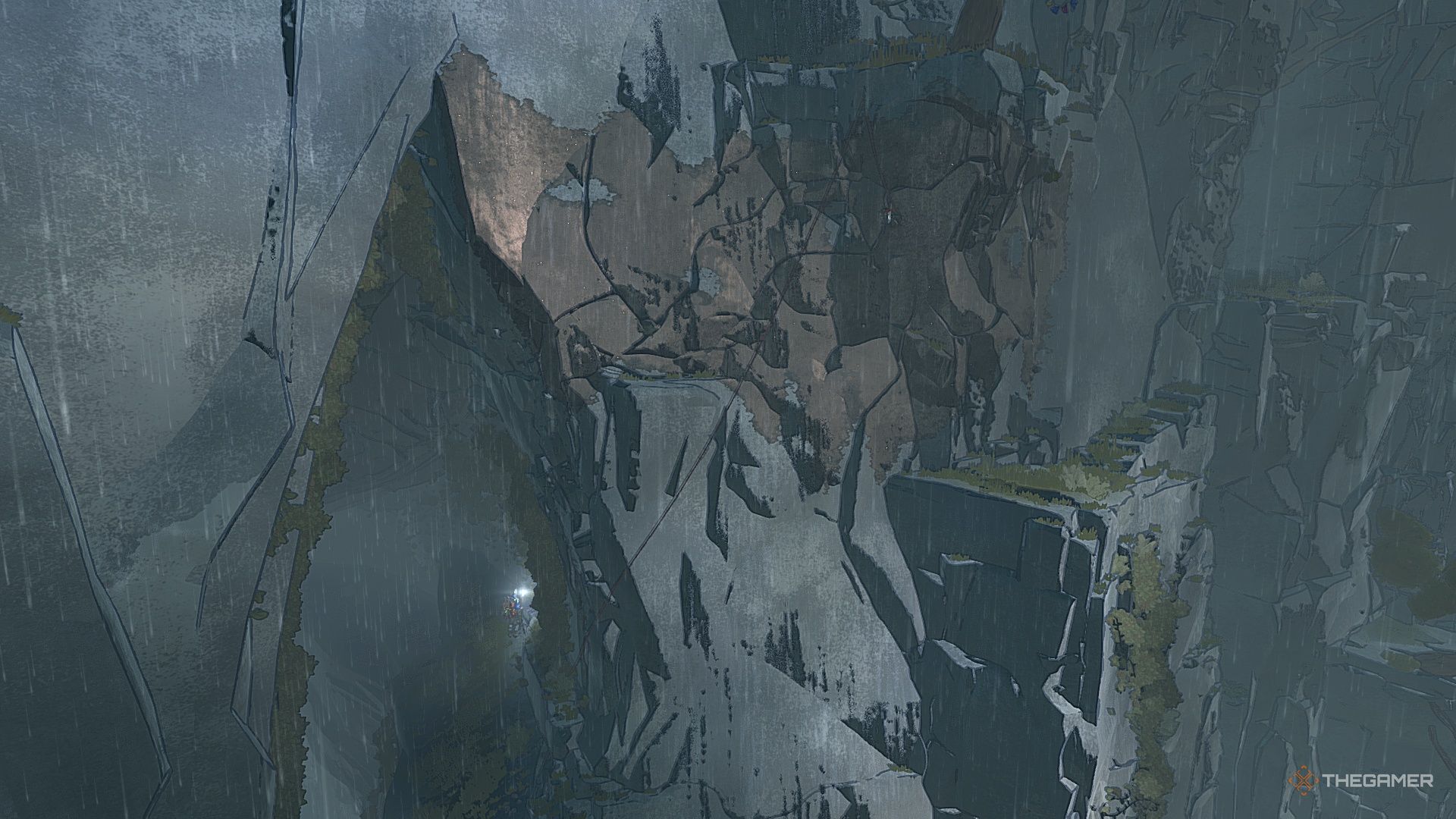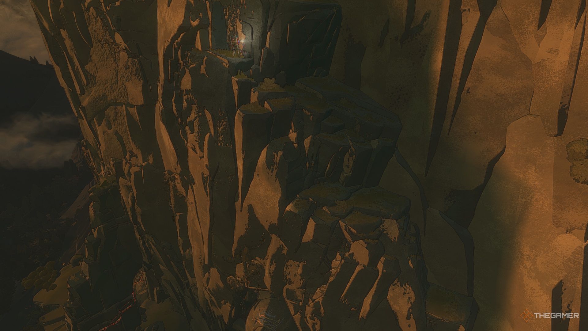 Далее поверните налево и осторожно двигайтесь боком вдоль стены на небольшое расстояние. Затем спуститесь к острому камню внизу.