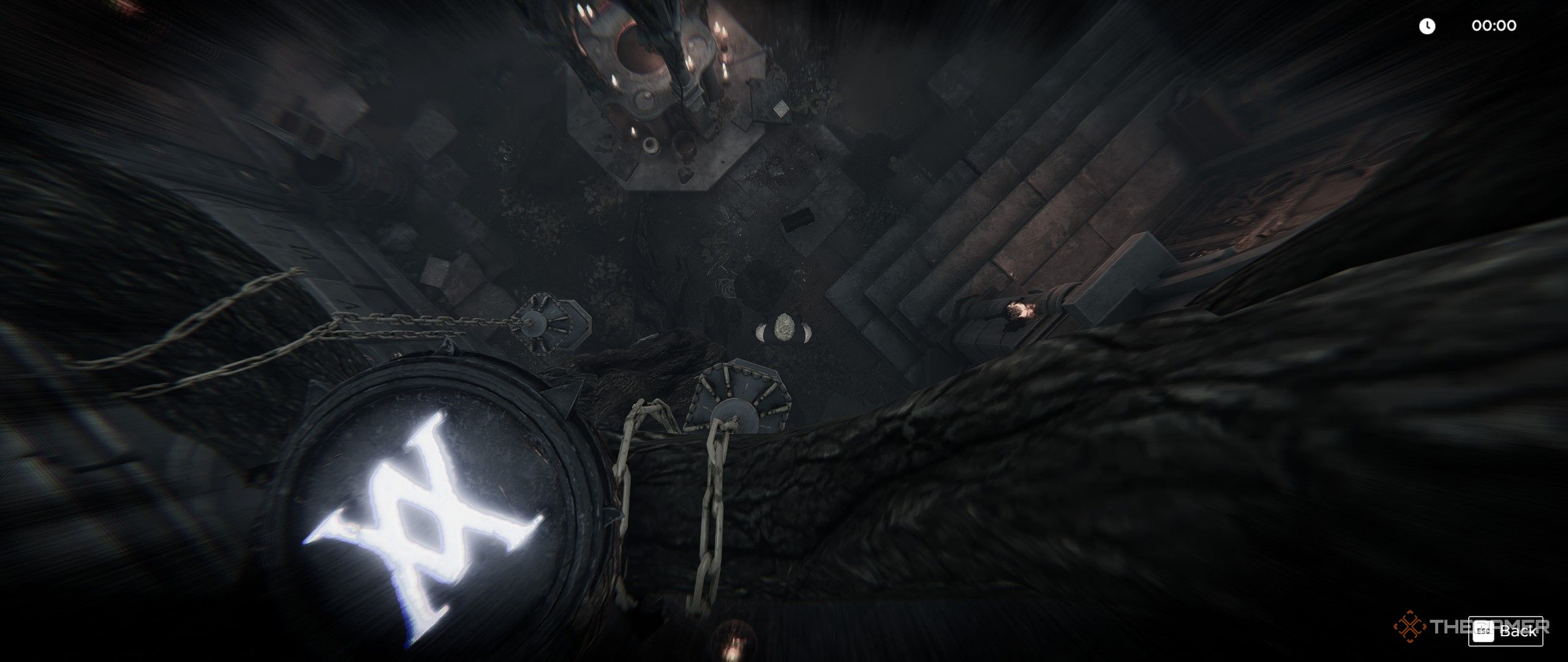 Вы можете увидеть эти символы только сверху. Чтобы получить этот вид, увеличьте масштаб зеркала, которое вы нашли ранее, и нажмите на него. Это переключит на перспективу с высоты птичьего полёта, позволяя вам исследовать и найти четыре светящихся символа. Эти символы соответствуют четырем углам фонтана.