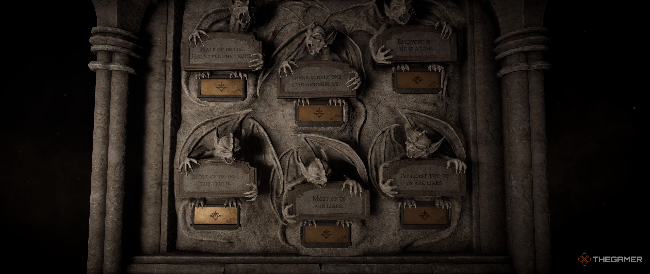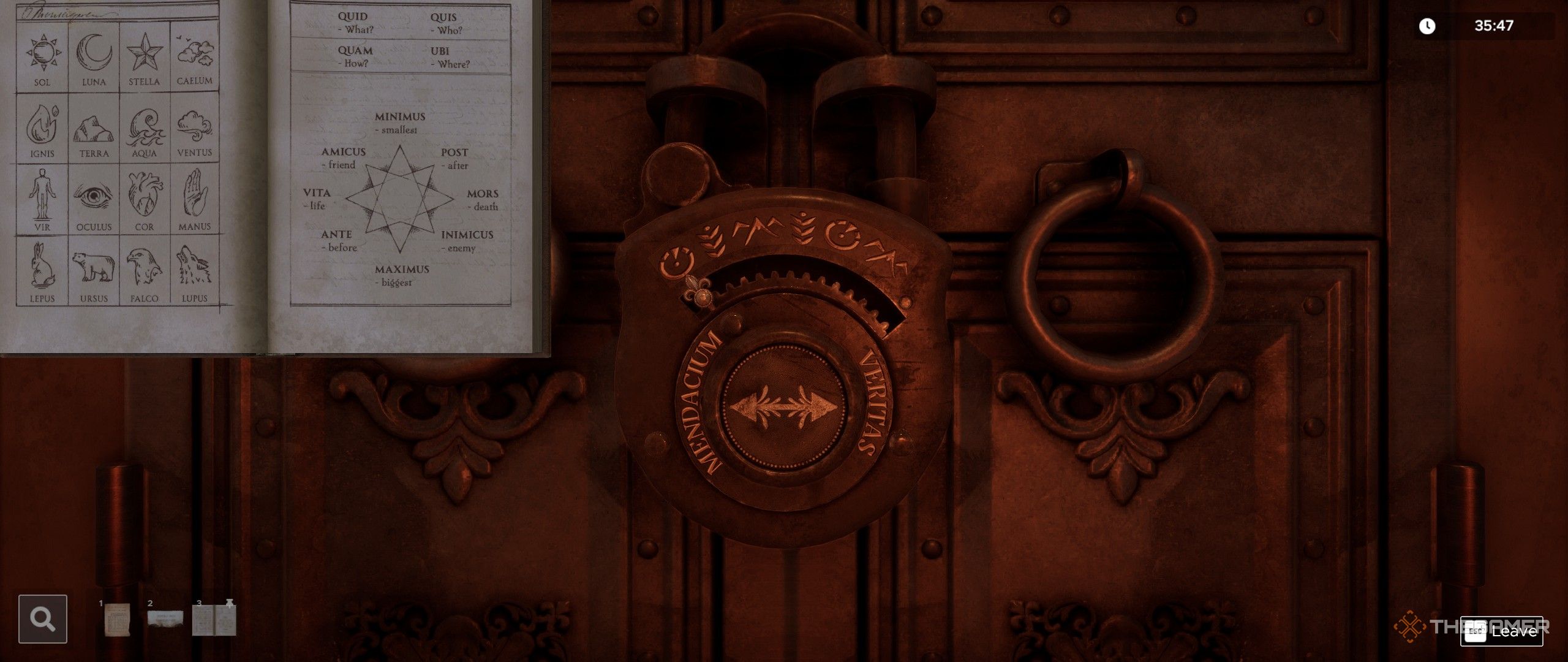 Первый Лунный Ключ получить относительно легко. Пойдите в нишу слева, и вы увидите три утверждения на стене рядом с замком возле статуй. Замок имеет символы, соответствующие утверждениям, и вам нужно определить, является ли каждое утверждение ‘False’ или ‘True’ – известные как ‘Mendacium’ или ‘Veritas’ в этой игре. Вы можете найти руководство по переводу на доске объявлений в другой части комнаты, чтобы помочь вам.