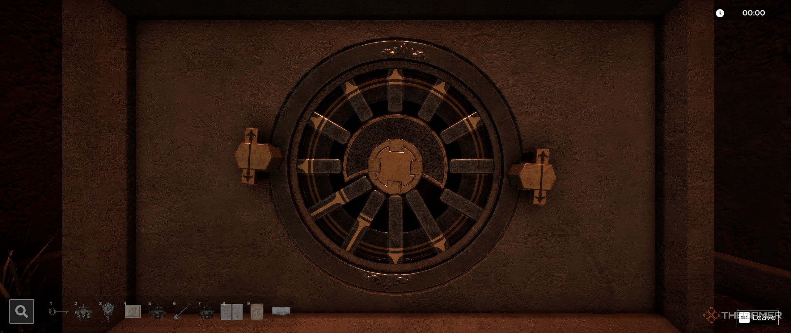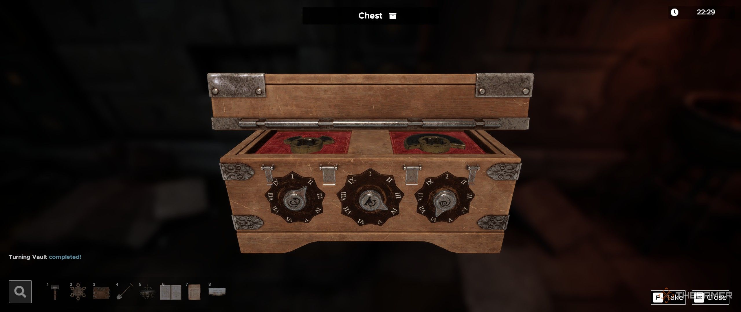 Справа от вас находится сундук с тремя символами, отображаемыми на его циферблатах. Используйте находящиеся поблизости устройства, чтобы узнать числа, соответствующие каждому символу, затем поверните циферблаты сундука на эти числа.