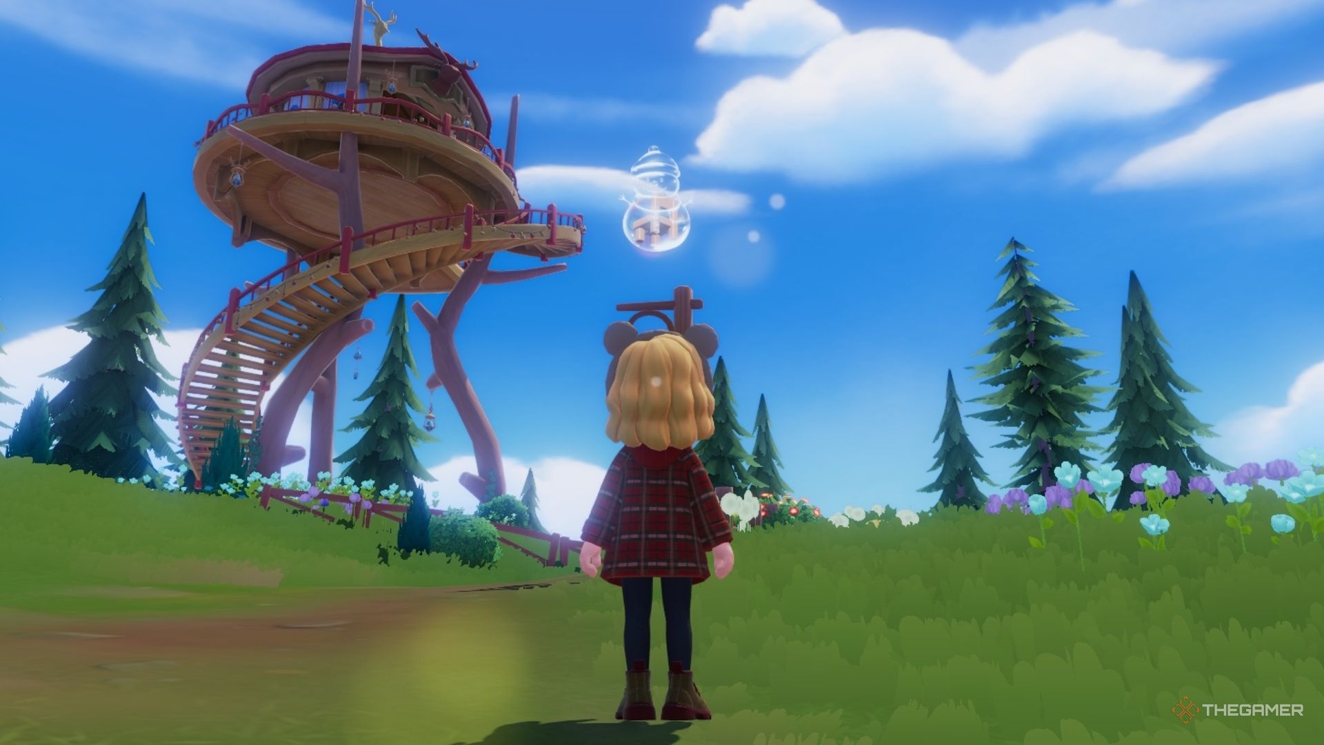 После этого отправляйтесь в Лес и найдите Башню Оленя. Парящий снеговичный пузырь будет прямо над фонарём. Используйте деревянный забор, чтобы прыгнуть вверх и лопнуть пузырь, завершив 4-й день Охоты за Яйцами Сердца.