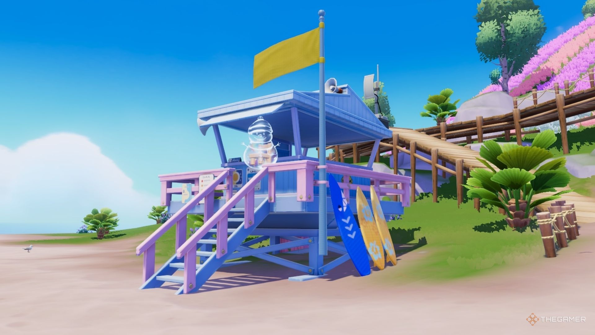 Чтобы найти пузырь со снеговиком, соответствующий синему треснувшему яйцу, отправляйтесь на пляж Аметист. Он плавает рядом с фиолетовым спасательным постом, который расположен почти в середине пляжа. Просто подойдите, чтобы лопнуть его!