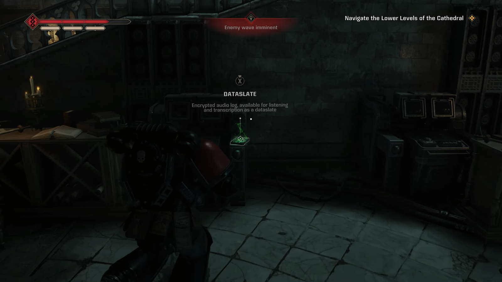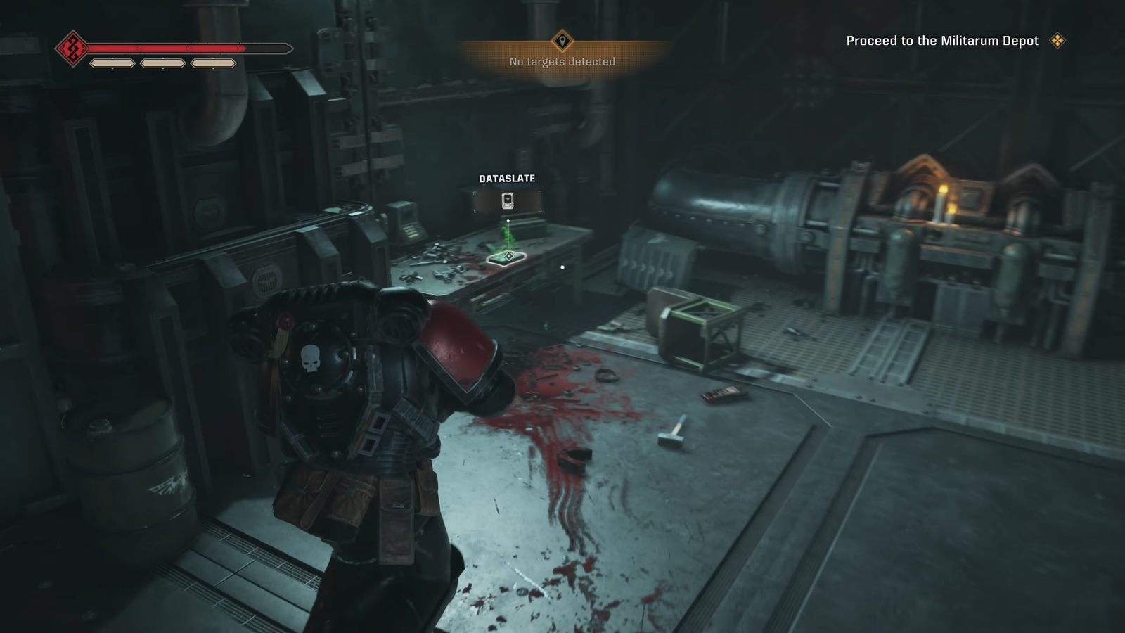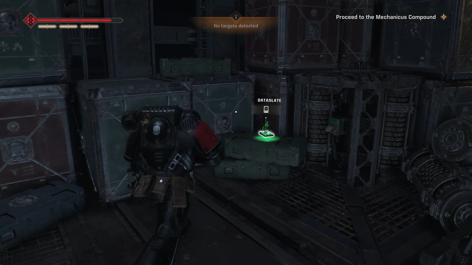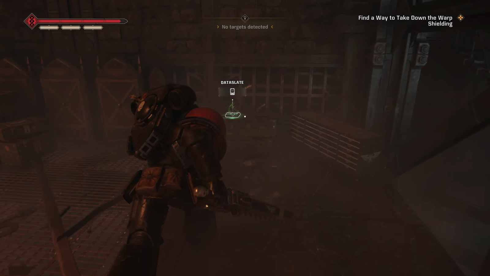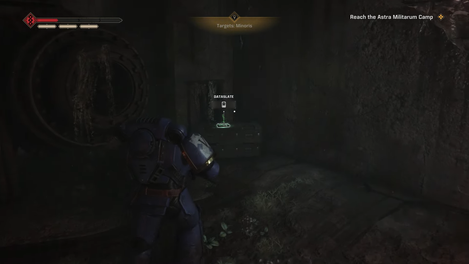 Во время выполнения задания «Перейти на склад Милитарум» вы найдете этот датаслейт возле сияющего золотого алтаря. Как только вас заметят, сначала следуйте по правильному пути, затем продолжайте прямо и, наконец, снова поверните направо. В конце этого маршрута вы обнаружите его на столе.