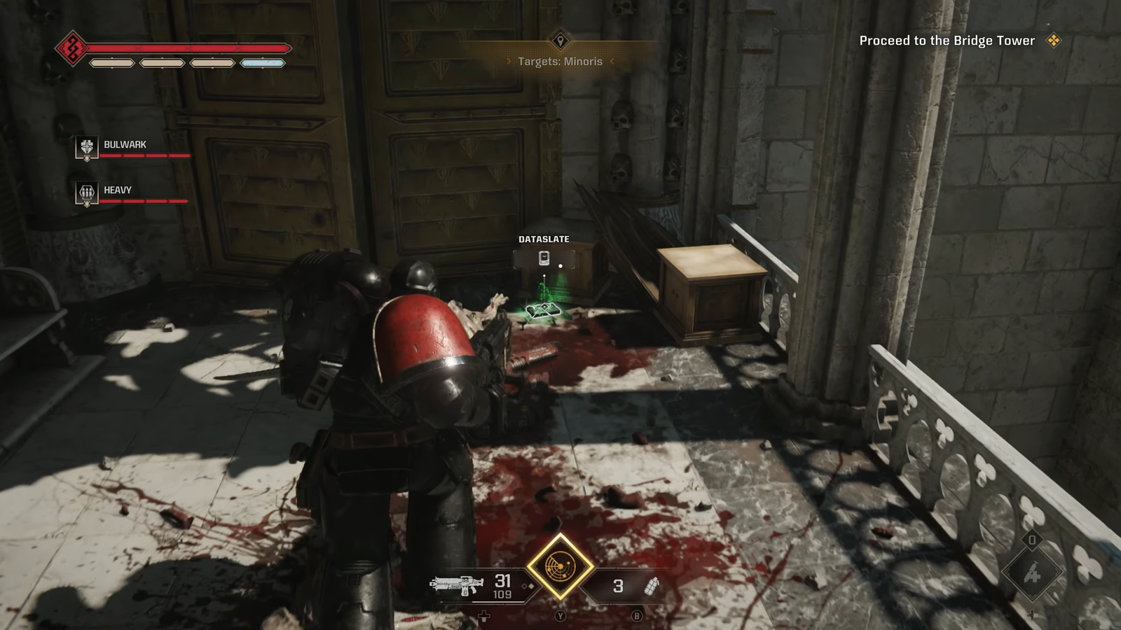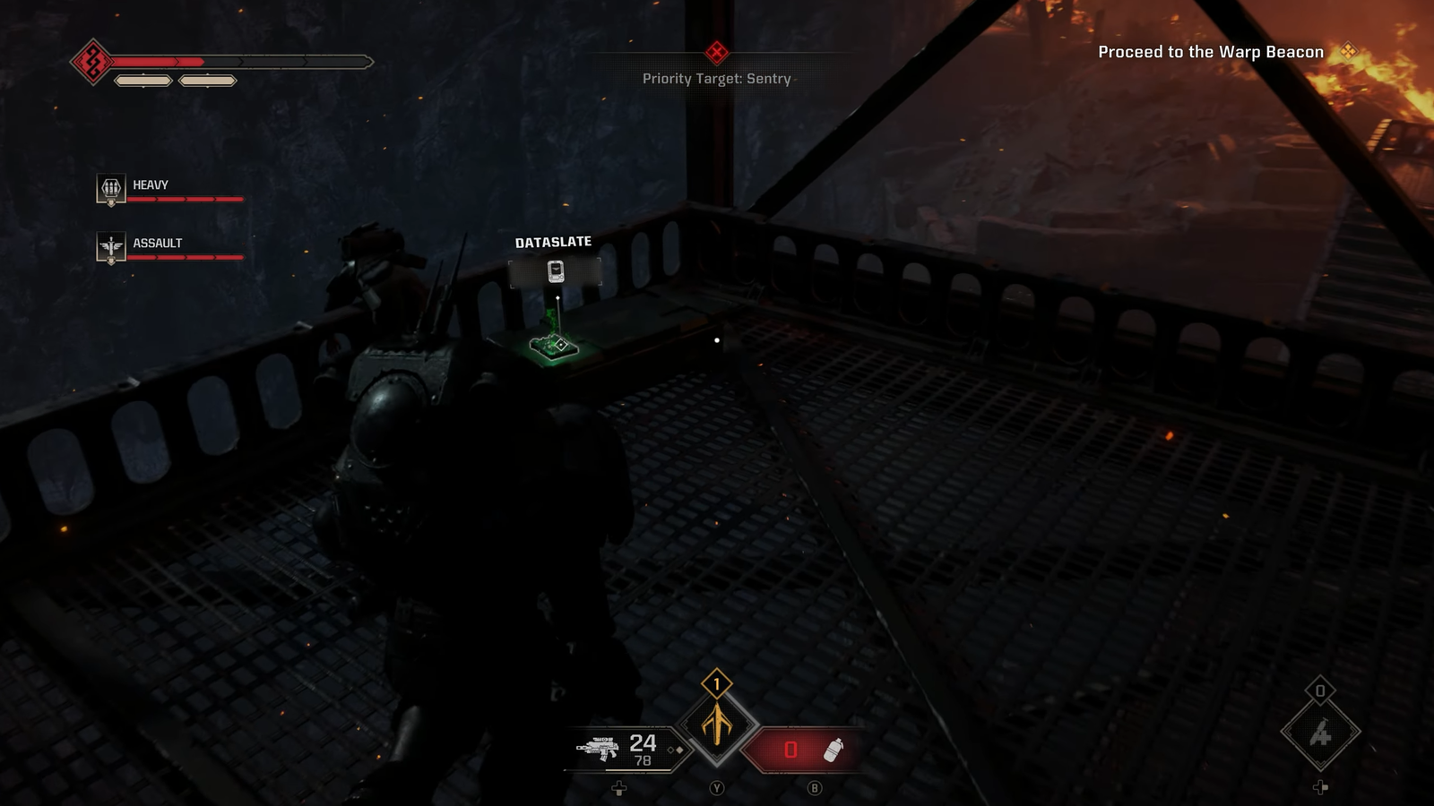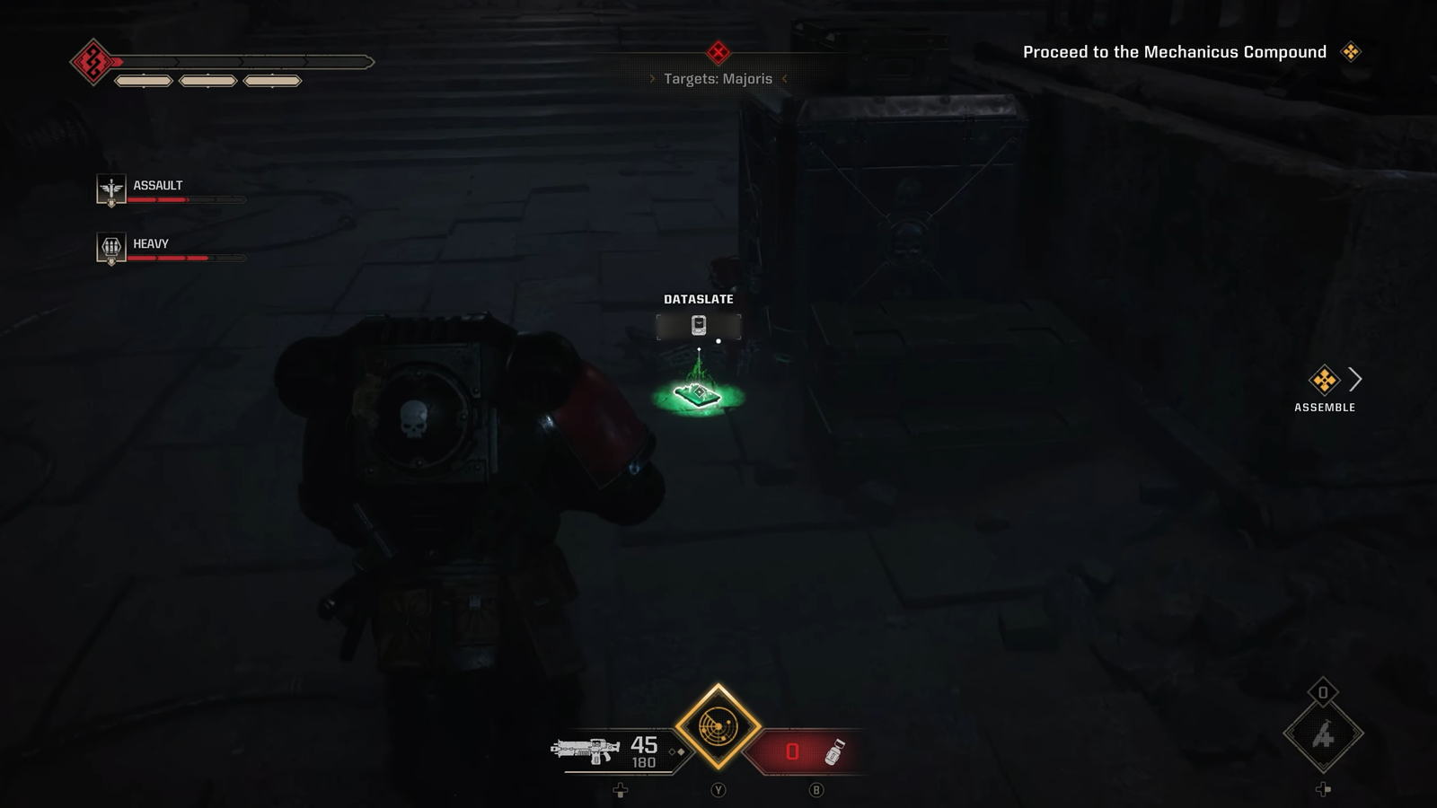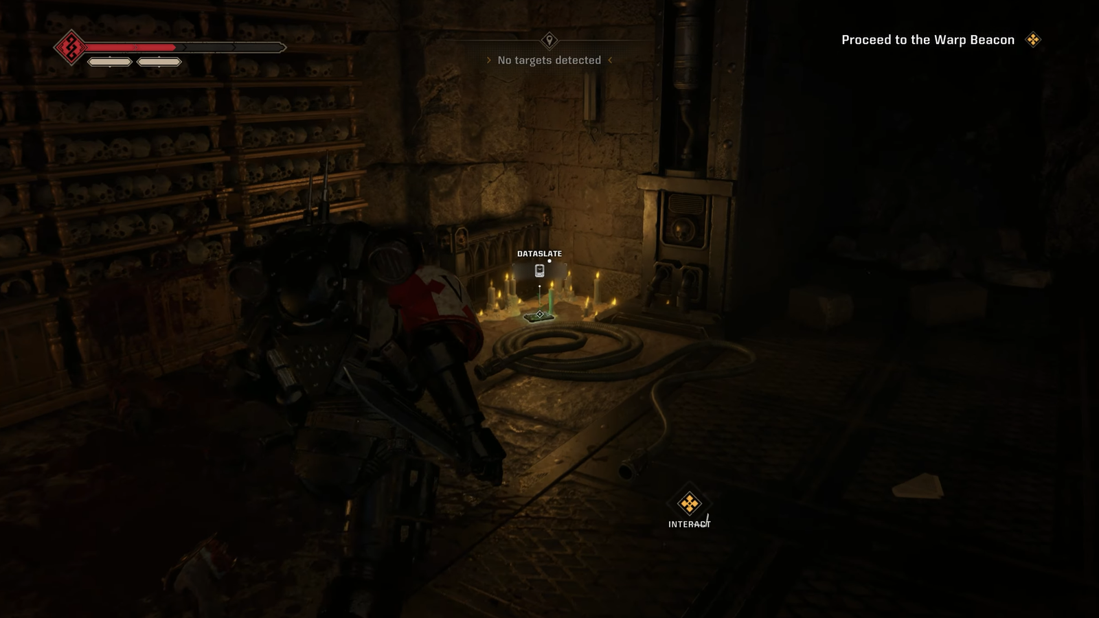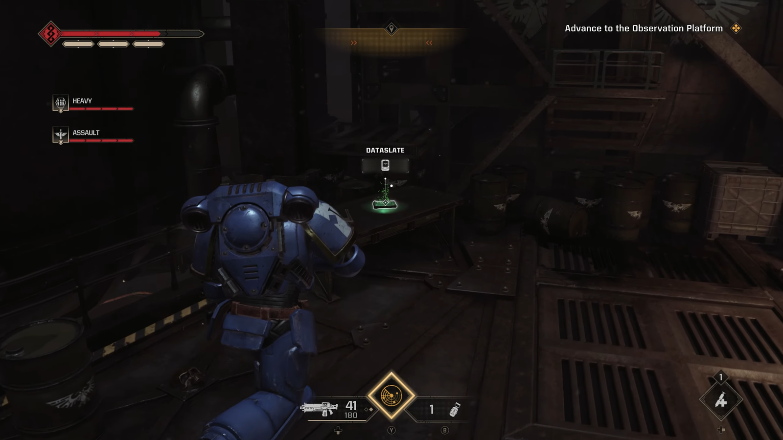 Во время выполнения задания «Перейти на склад Милитарум» вы найдете этот датаслейт возле сияющего золотого алтаря. Как только вас заметят, сначала следуйте по правильному пути, затем продолжайте прямо и, наконец, снова поверните направо. В конце этого маршрута вы обнаружите его на столе.