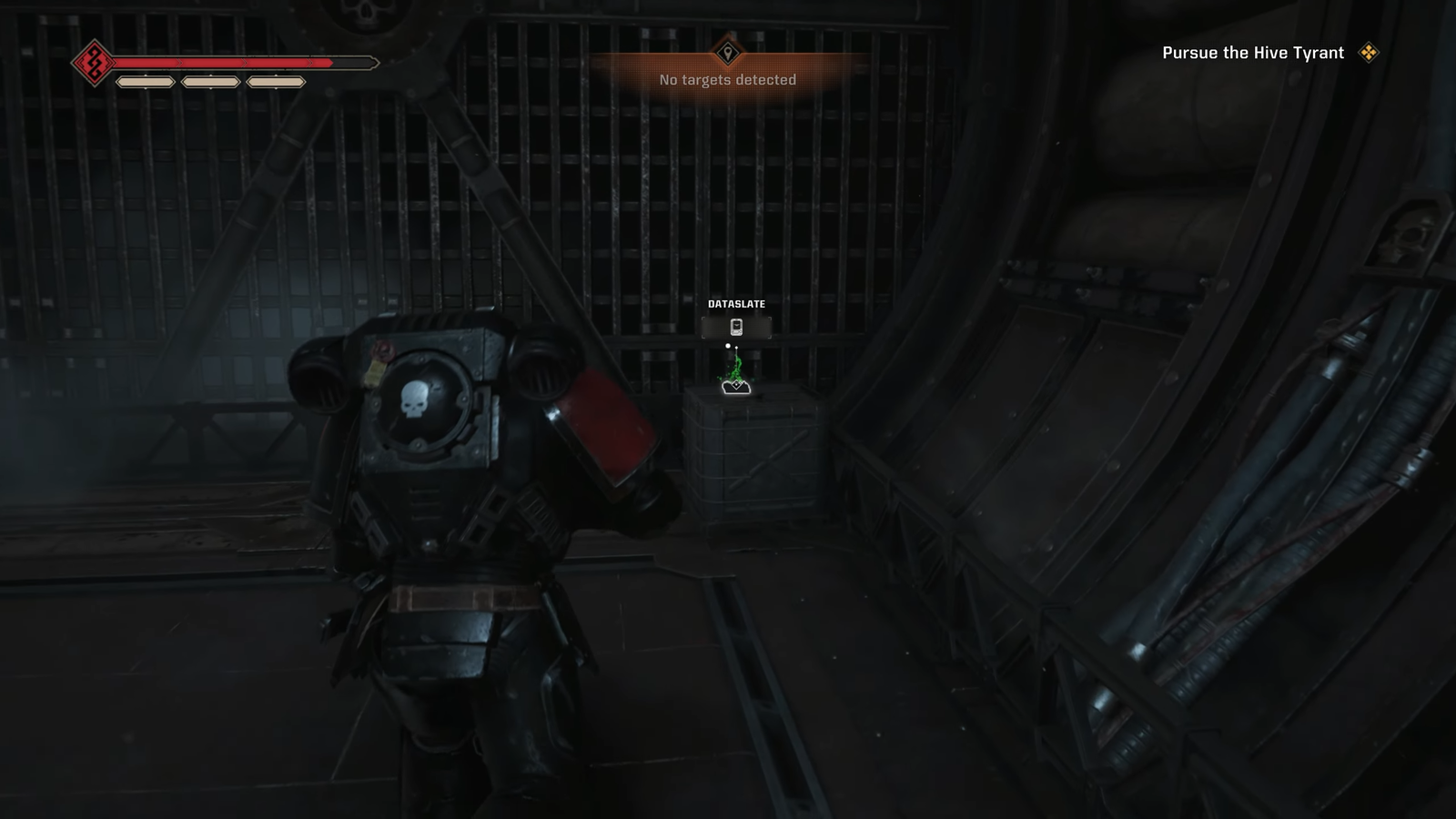 Во время задания «Преследовать тирана улья», как только вы доберетесь до комнаты с двумя большими вращающимися вентиляторами, идите направо, а затем прямо, пока не зайдете в тупик. Dataslate можно найти на ящике в этом месте.