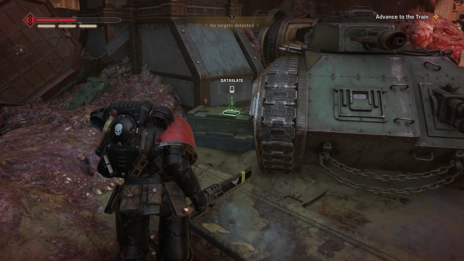 Во время выполнения задания «Перейти к поезду» вы встретите это место. Выше вы заметите надземный мост; Двигайтесь к нему, сохраняя небольшую пылающую область справа от вас. Датаслейт расположен слева от танка «Химера», рядом с опорой моста.