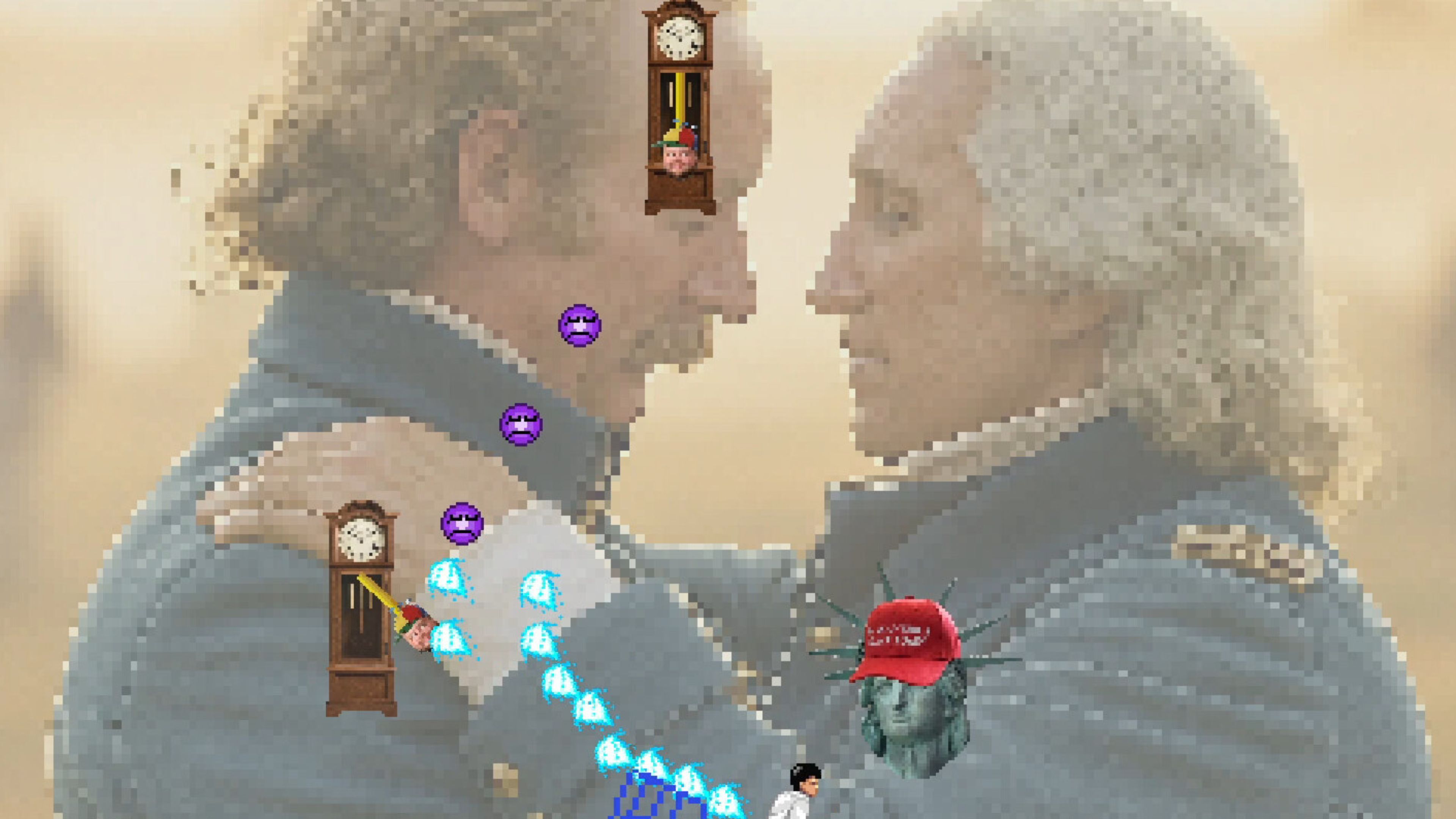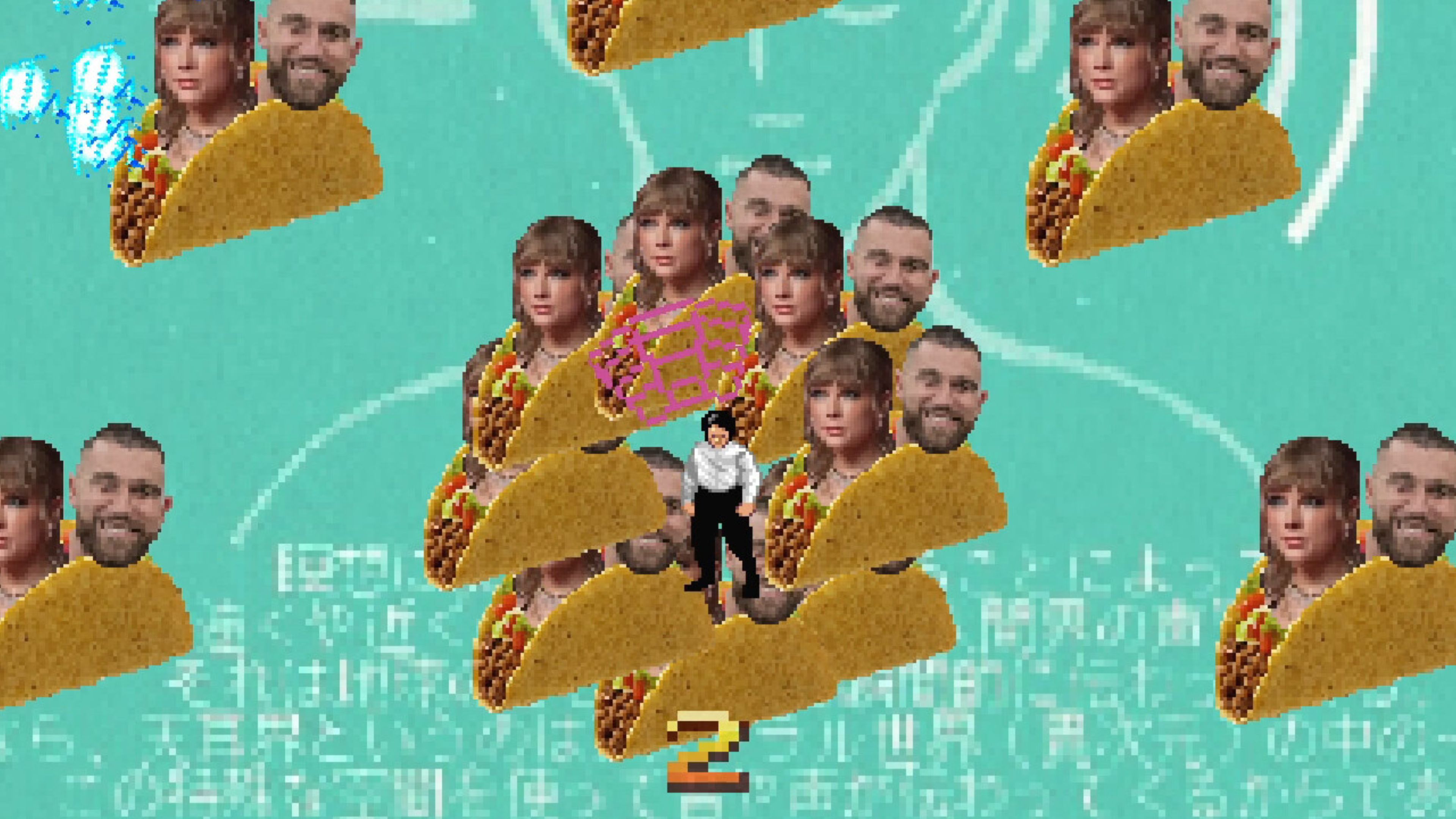 Скриншоты из игры Hong Kong 2097 демонстрируют причудливые и юмористические фоны, включая изображение Джорджа Вашингтона, собирающегося поцеловать другого мужчину, тако, которые, кажется, наполнены лицами Тейлор Свифт и Трэвиса Келси, и популярный мем с Винсом МакМахоном.