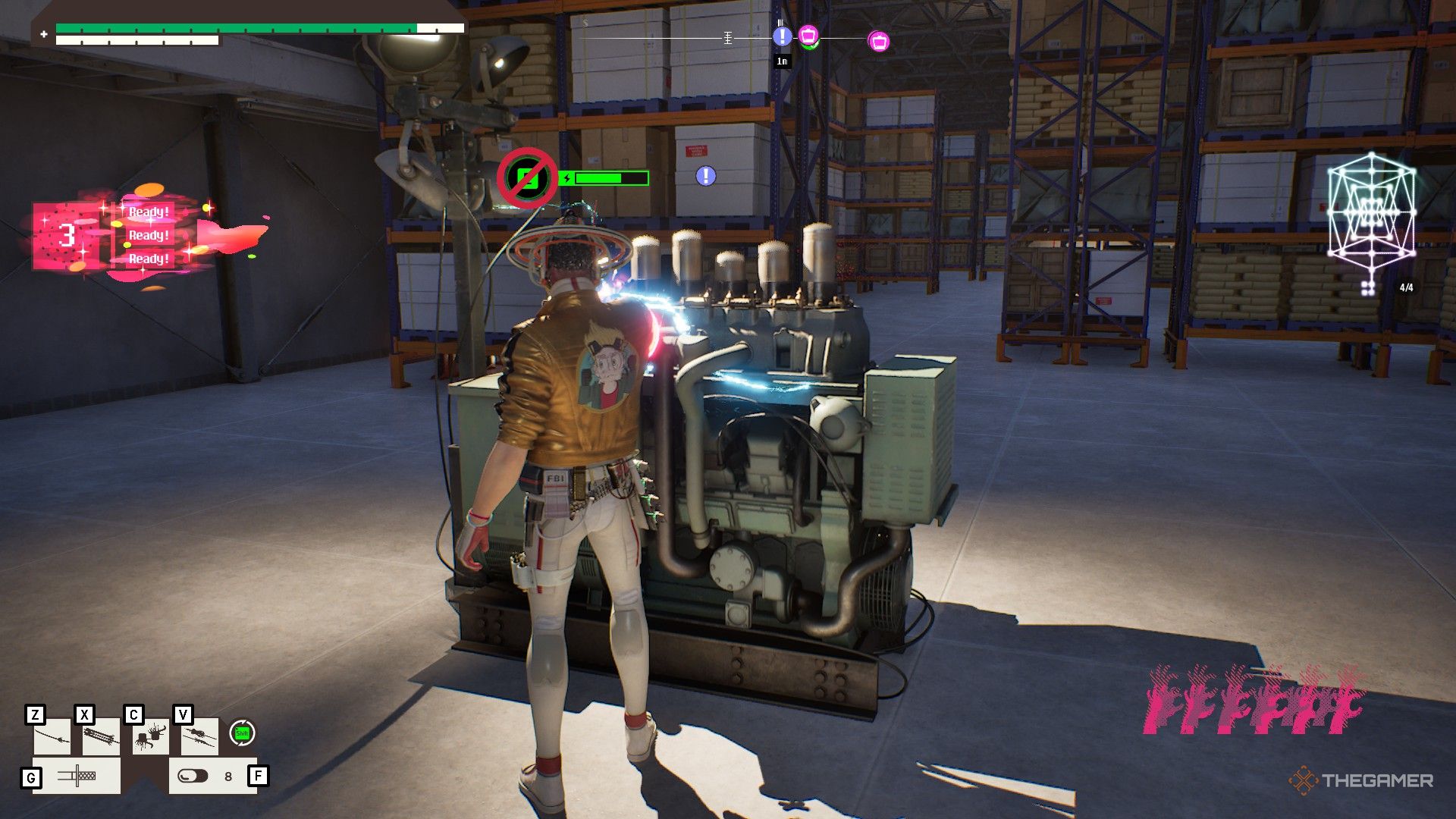 Телевизор перенесет вас на склад на первом этаже. В конце склада вы найдете финальный генератор. Путь к нему охраняют враги, но по пути вы можете собрать значок, прыгая по верхам полок.