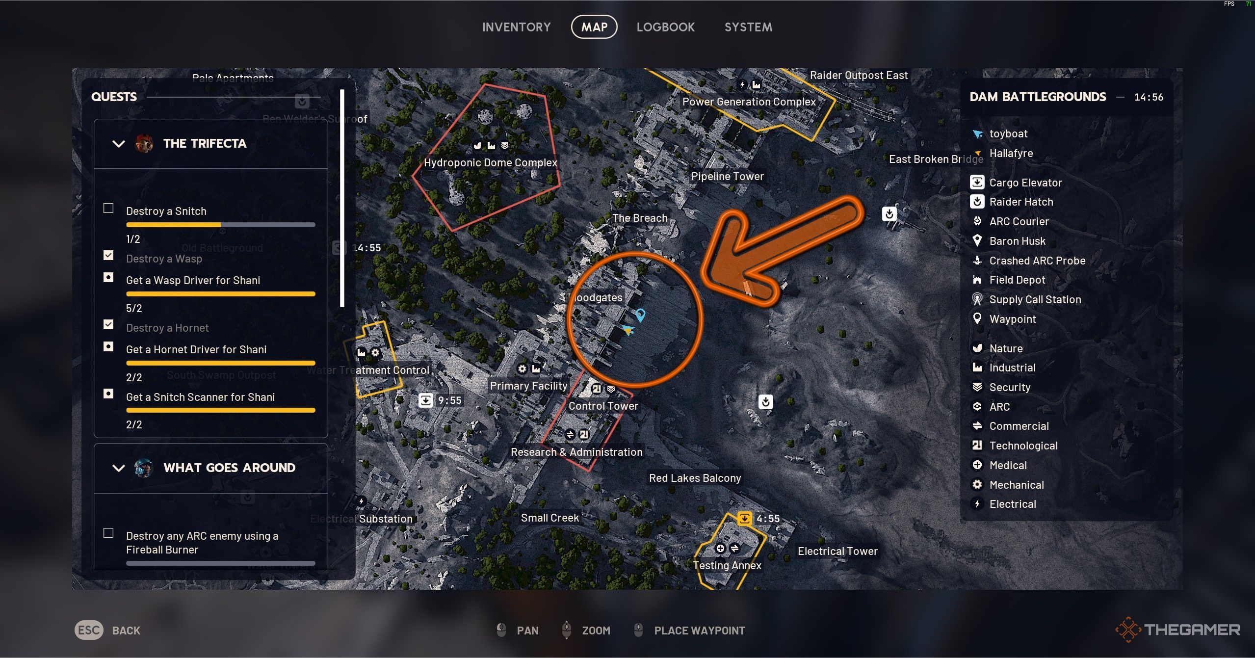 Хорошее место для поиска ресурсов находится вдоль нижней части плотины. Начните с правой стороны и осторожно следуйте по узким дорожкам вдоль шлюзов, опуская каждый секцию моста по мере продвижения. Обратите внимание на две заблокированные двери на этом пути — взламывая их, вы можете получить ценные трофеи и даже чертежи.
