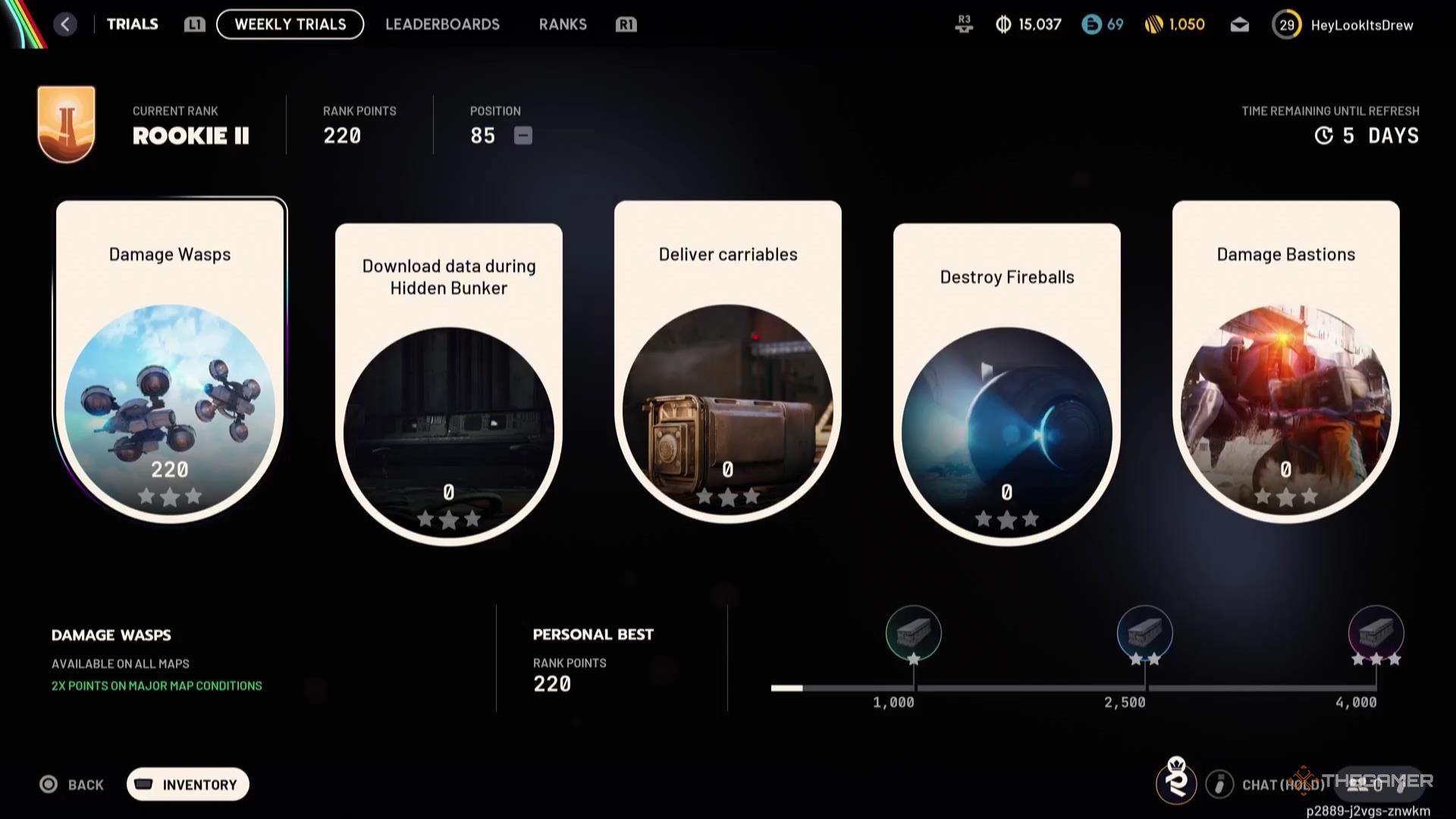 Каждую неделю появляется пять уникальных Испытаний, и каждое из них представляет собой различный вызов. Эти вызовы могут включать в себя такие вещи, как уничтожение ос, разрушение огненных шаров или загрузка данных. Ваш счёт основывается не на общем прогрессе, а на вашей лучшей результативности в одном рейде.
