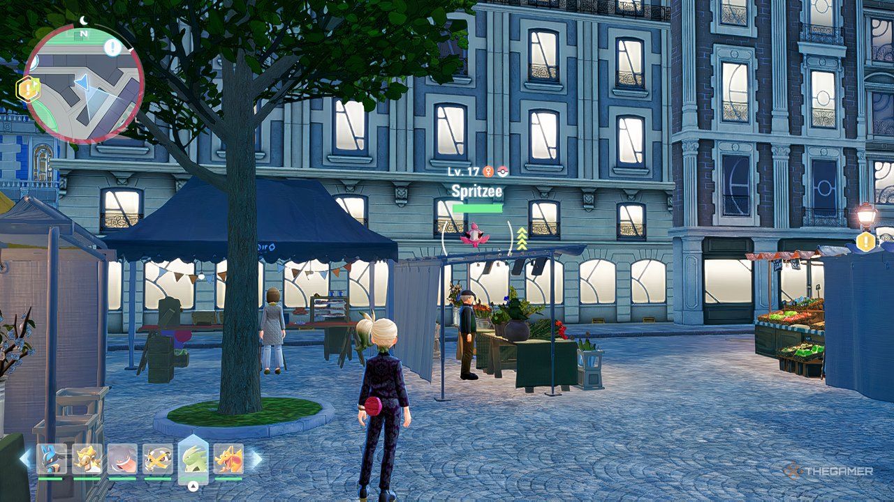 Ищите Спритзи, сидящего на рыночных прилавках. Если он находится у края крыши, подойдите как можно ближе, прежде чем бросать свой Покебол. Однако, если он находится ближе к центру тента, отступите немного, чтобы Покебол не отскочил.