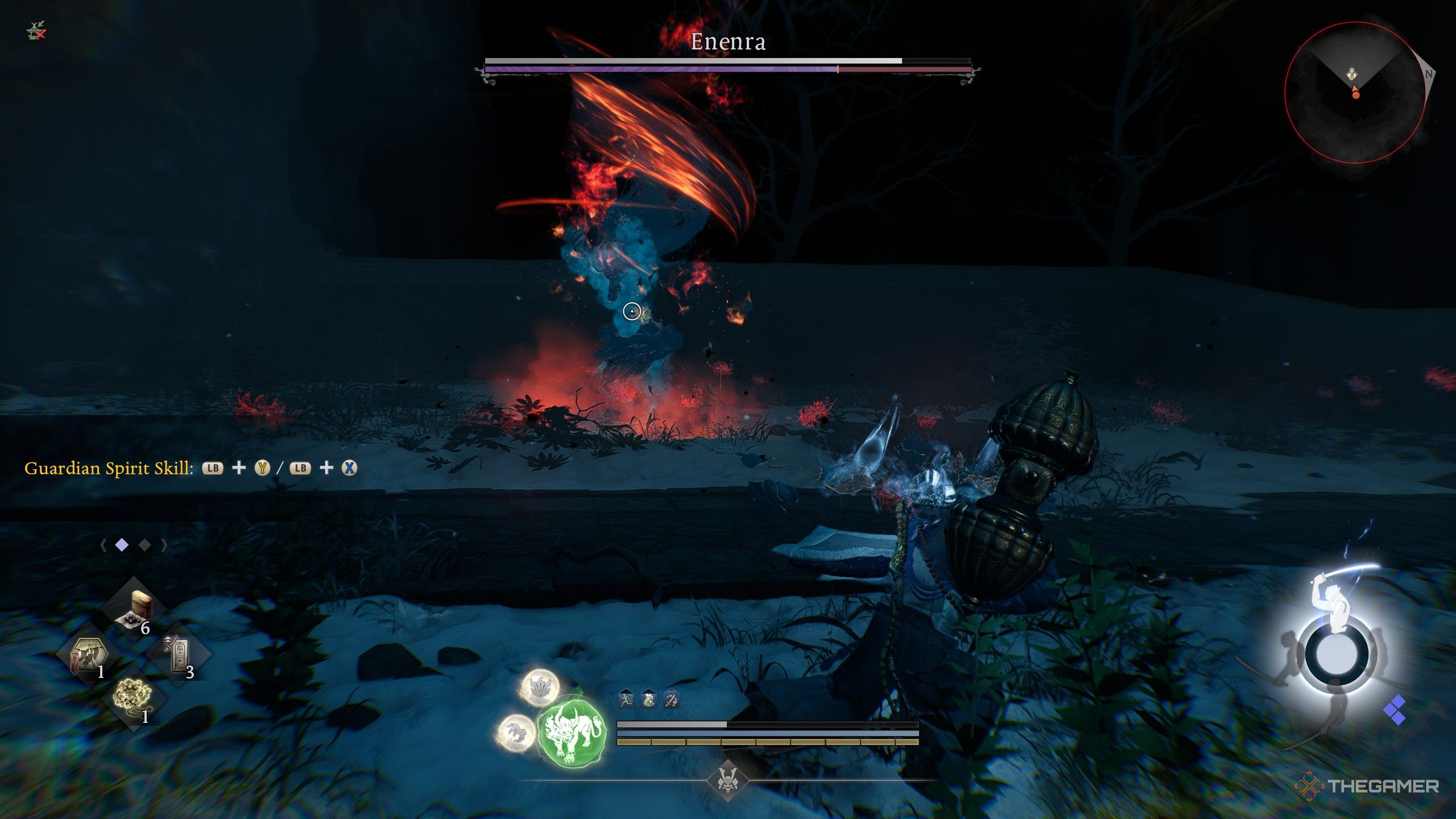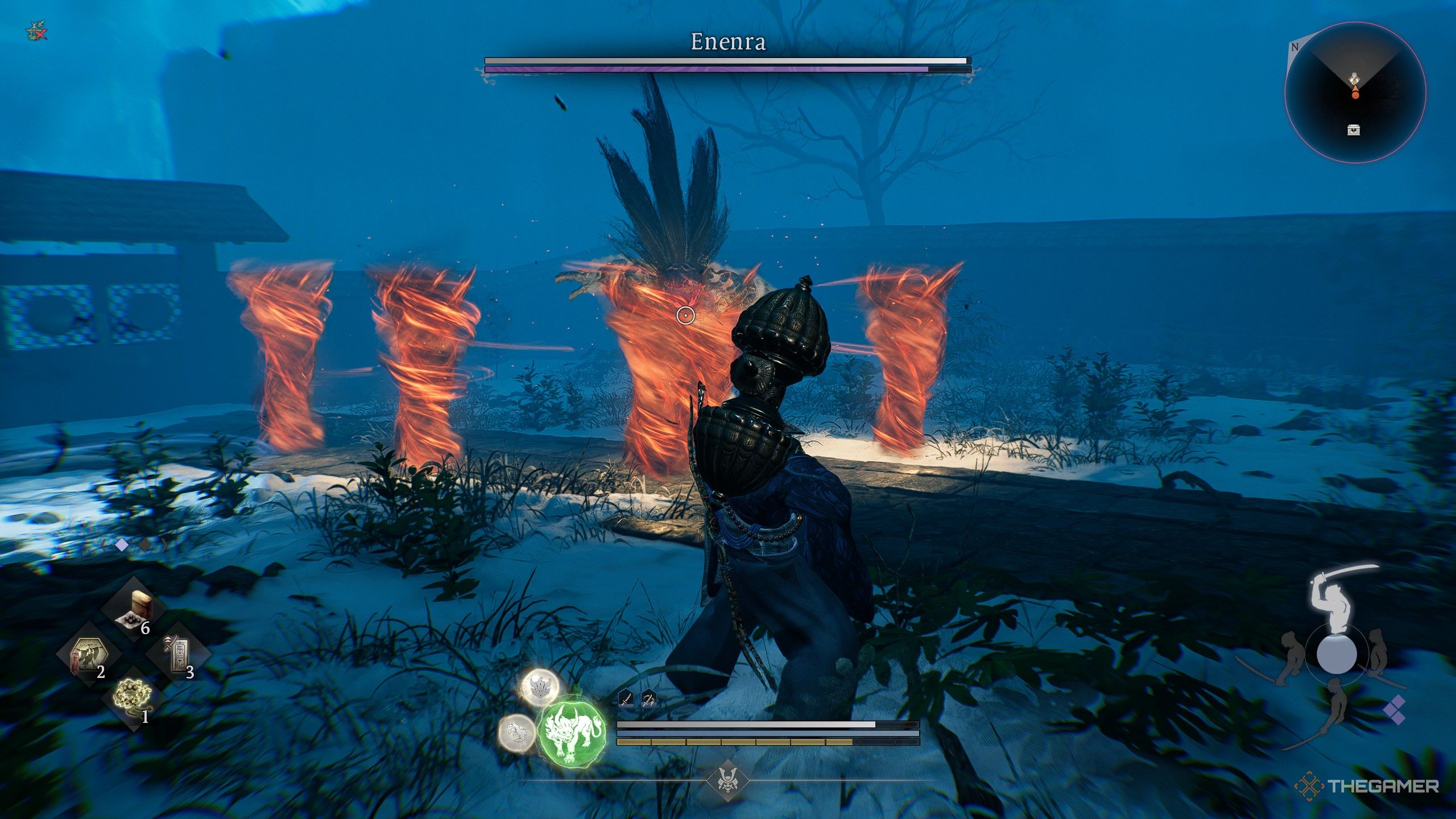 Когда вы сражаетесь с Enenra, лучший способ уклониться от его широкого удара — переместиться за него или быстро убежать, поскольку он создает большие отверстия, когда раскрывается. У него также есть двойной удар ногой — он балансирует на одной ноге и бьёт ногой дважды. Опять же, оказавшись за ним, вы сможете избежать атаки и получить шанс контратаковать.
