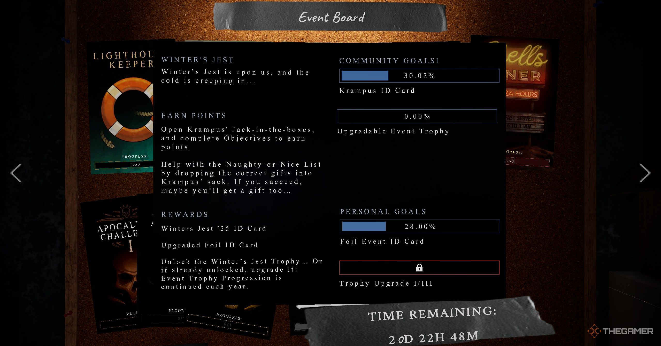 Очки события позволяют вам продвигаться в Winter’s Jest. Вы получаете их за правильное угадывание, кто призрак, выполнение дополнительных заданий, использование Jack-in-the-Boxes, доставку подарков для Krampus и игру на более высоких уровнях сложности.