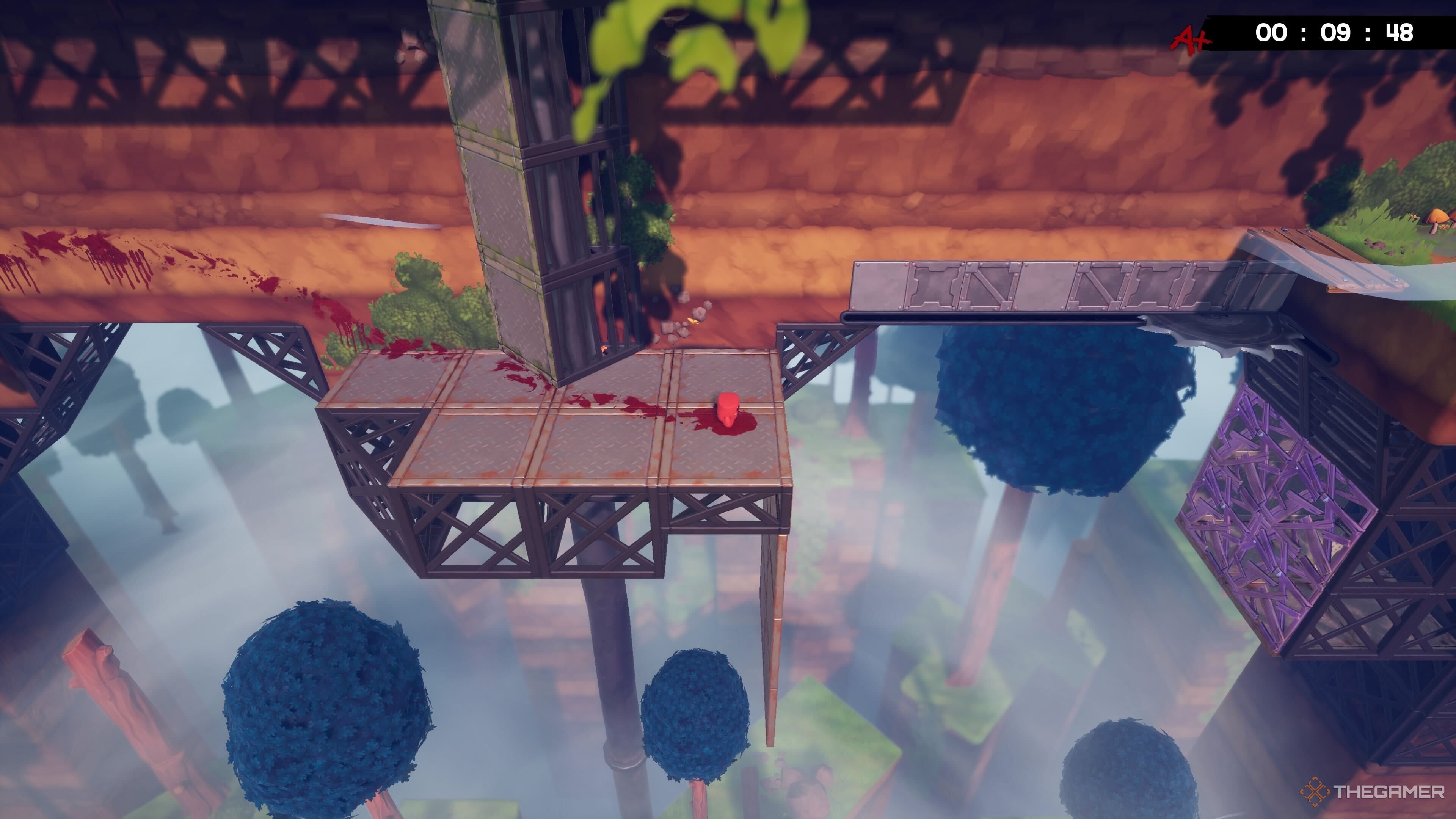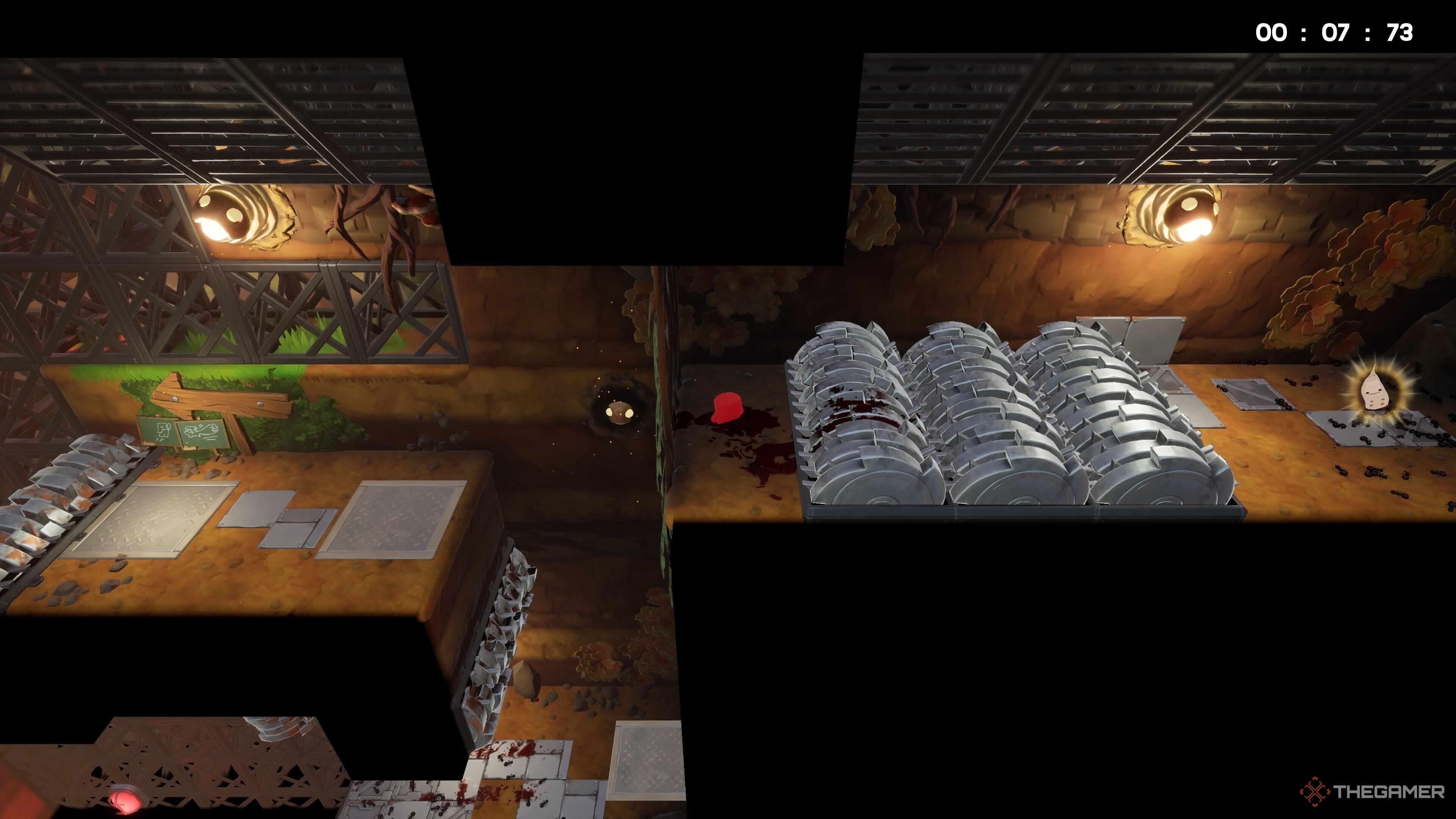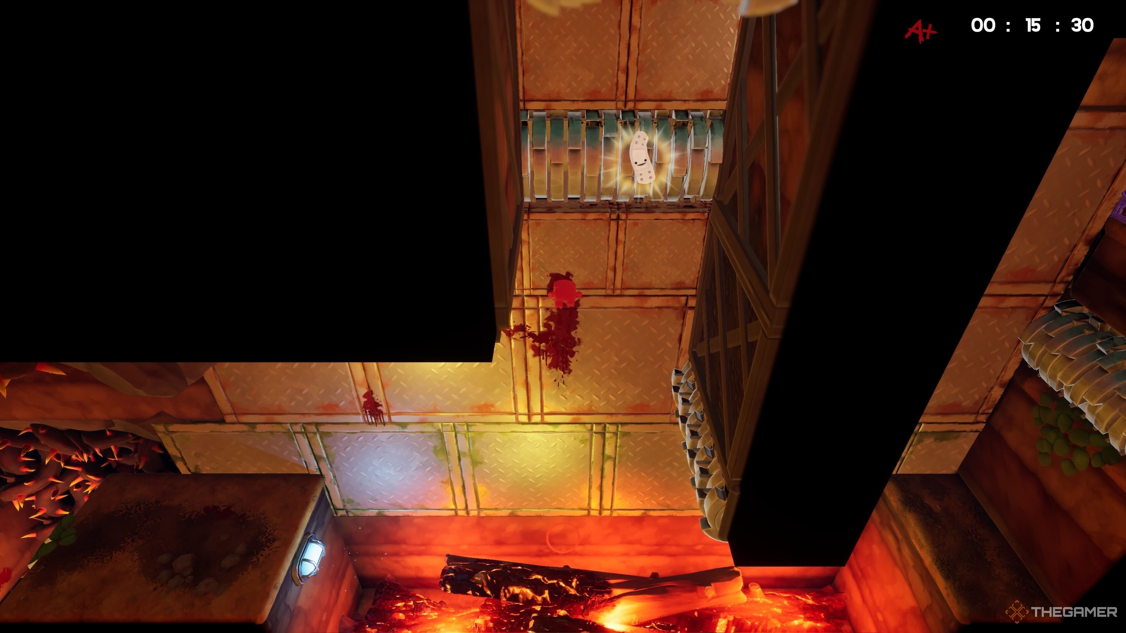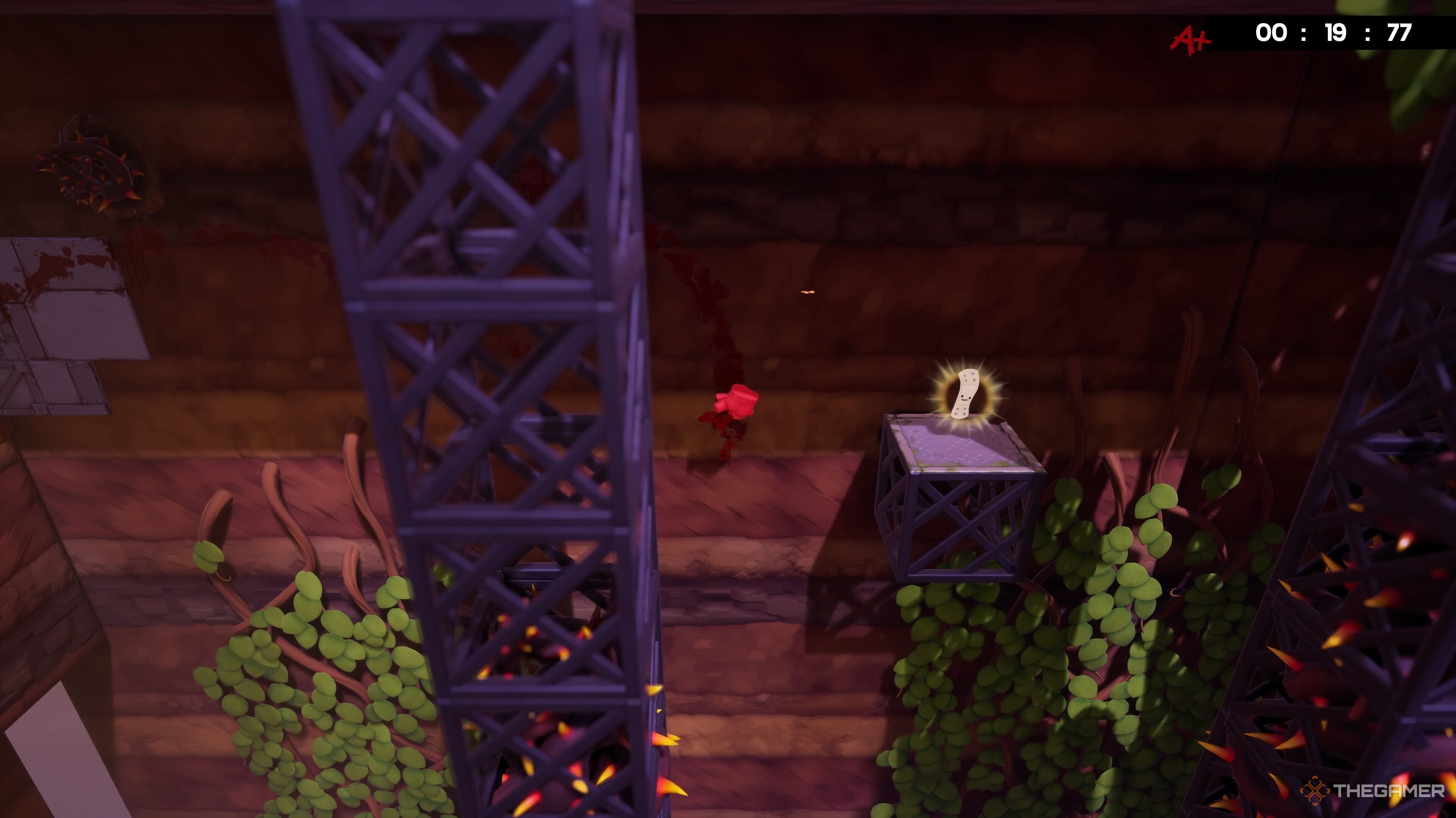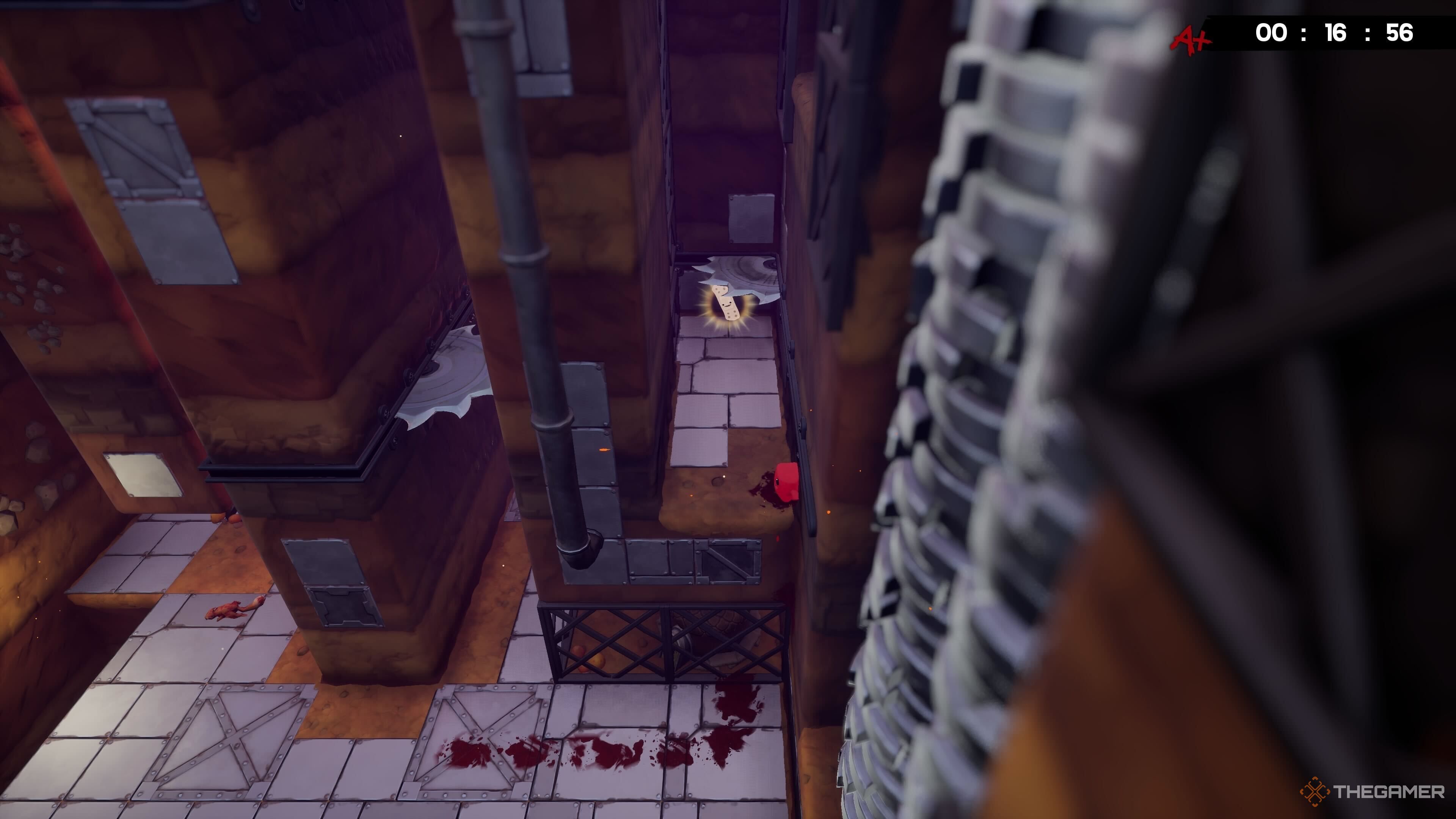 Эта тайна непросто найти! В начале уровня, рядом с первой ловушкой-пилой, встаньте на центральную платформу и прыгните влево – вы обнаружите там спрятанную Бинтовку.