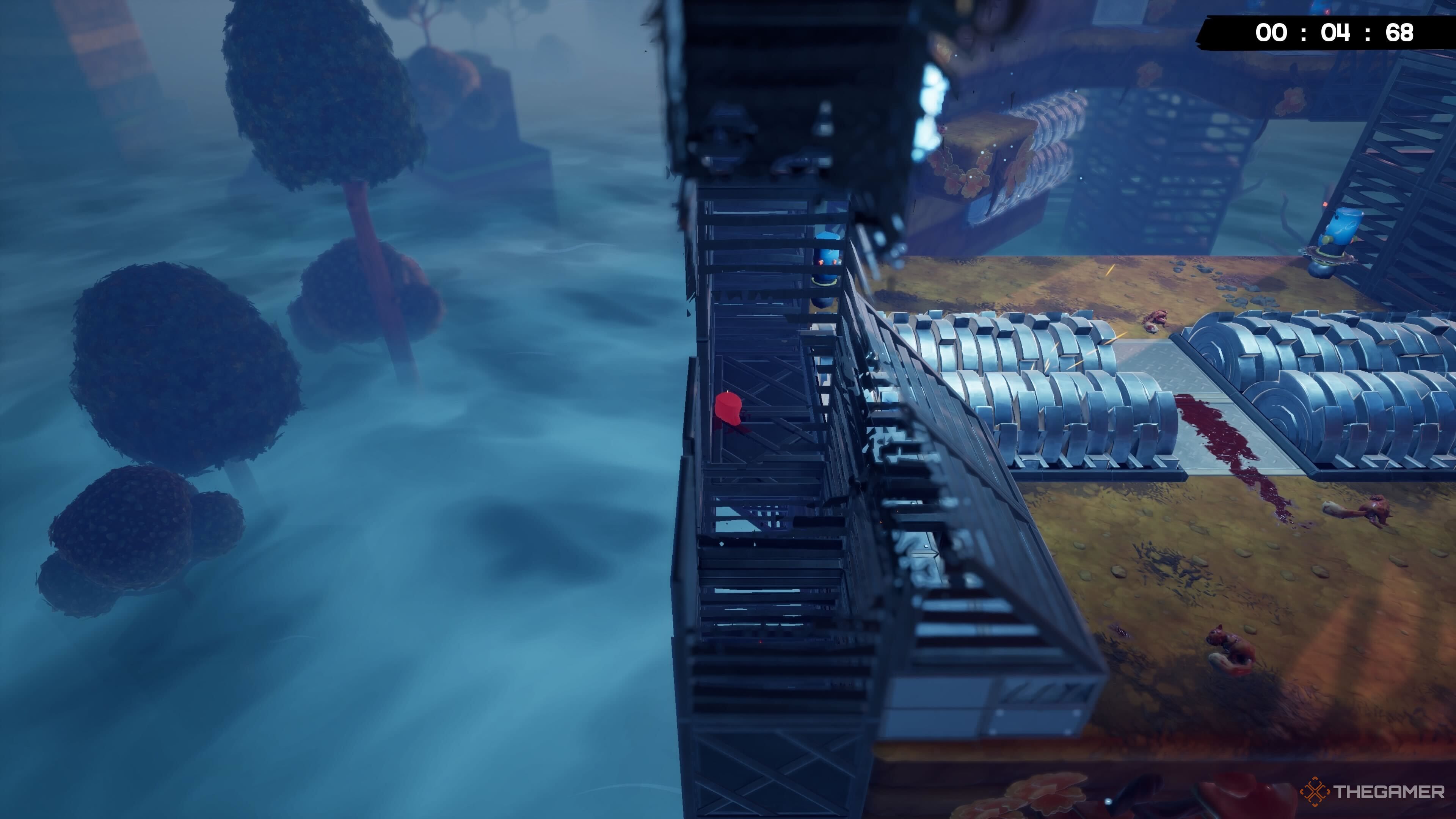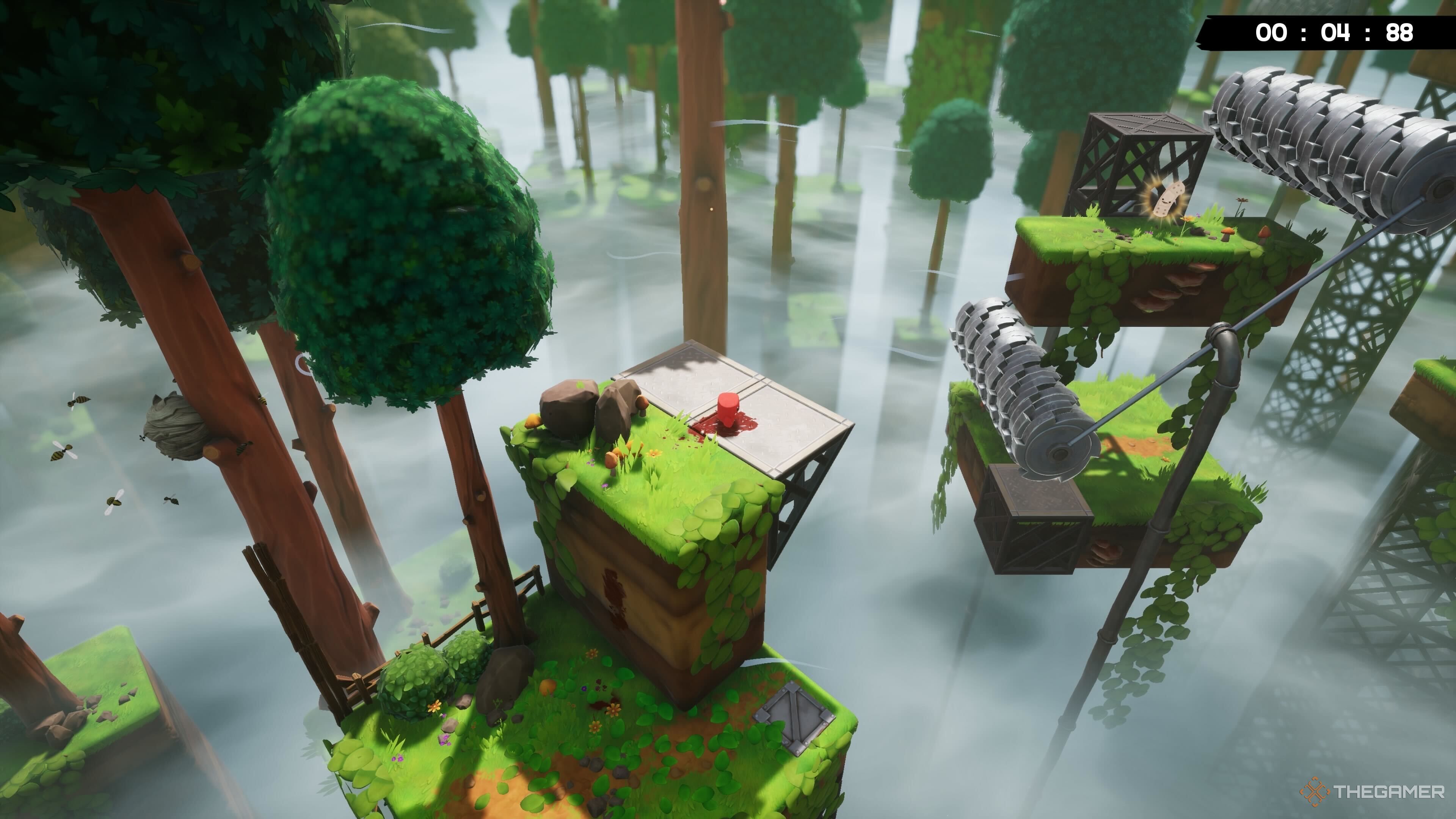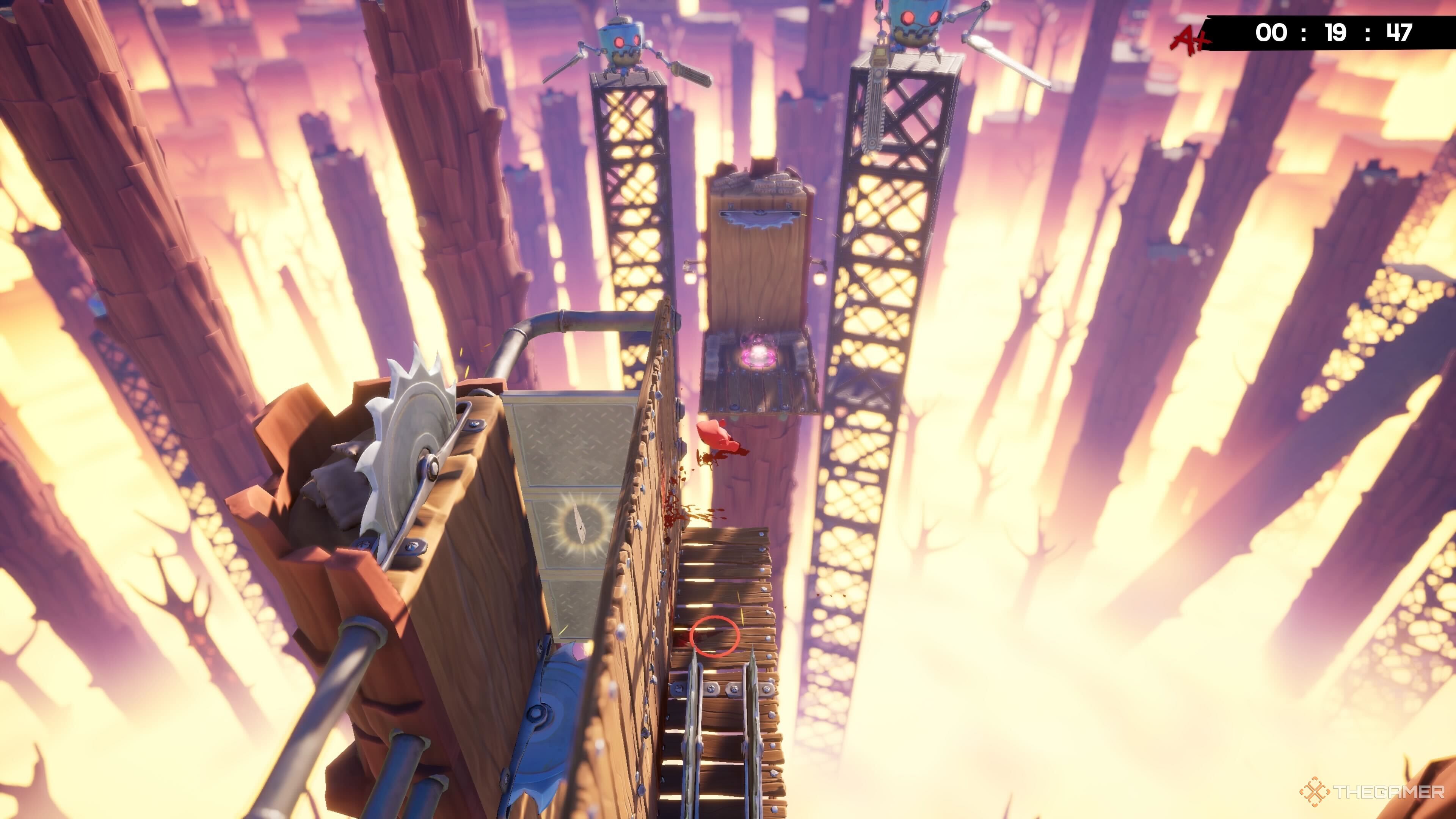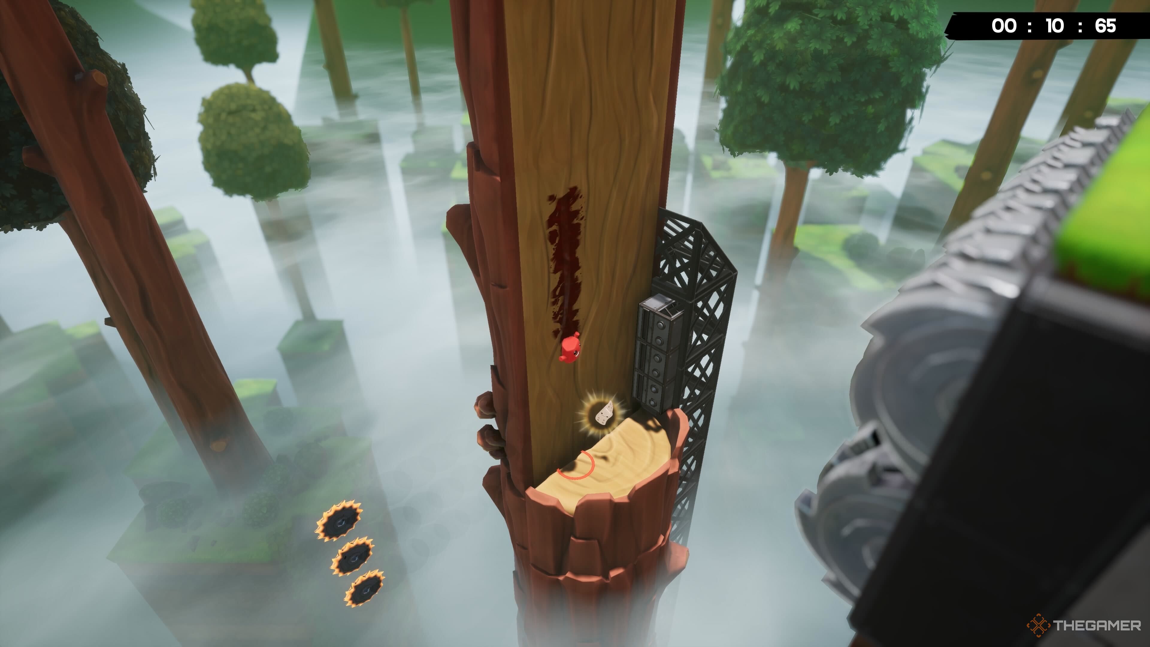 В начале уровня прыгайте на платформу впереди. Вы заметите Бинт на более высокой платформе. Обязательно рассчитайте время прыжка, чтобы уклониться от движущихся пил.
