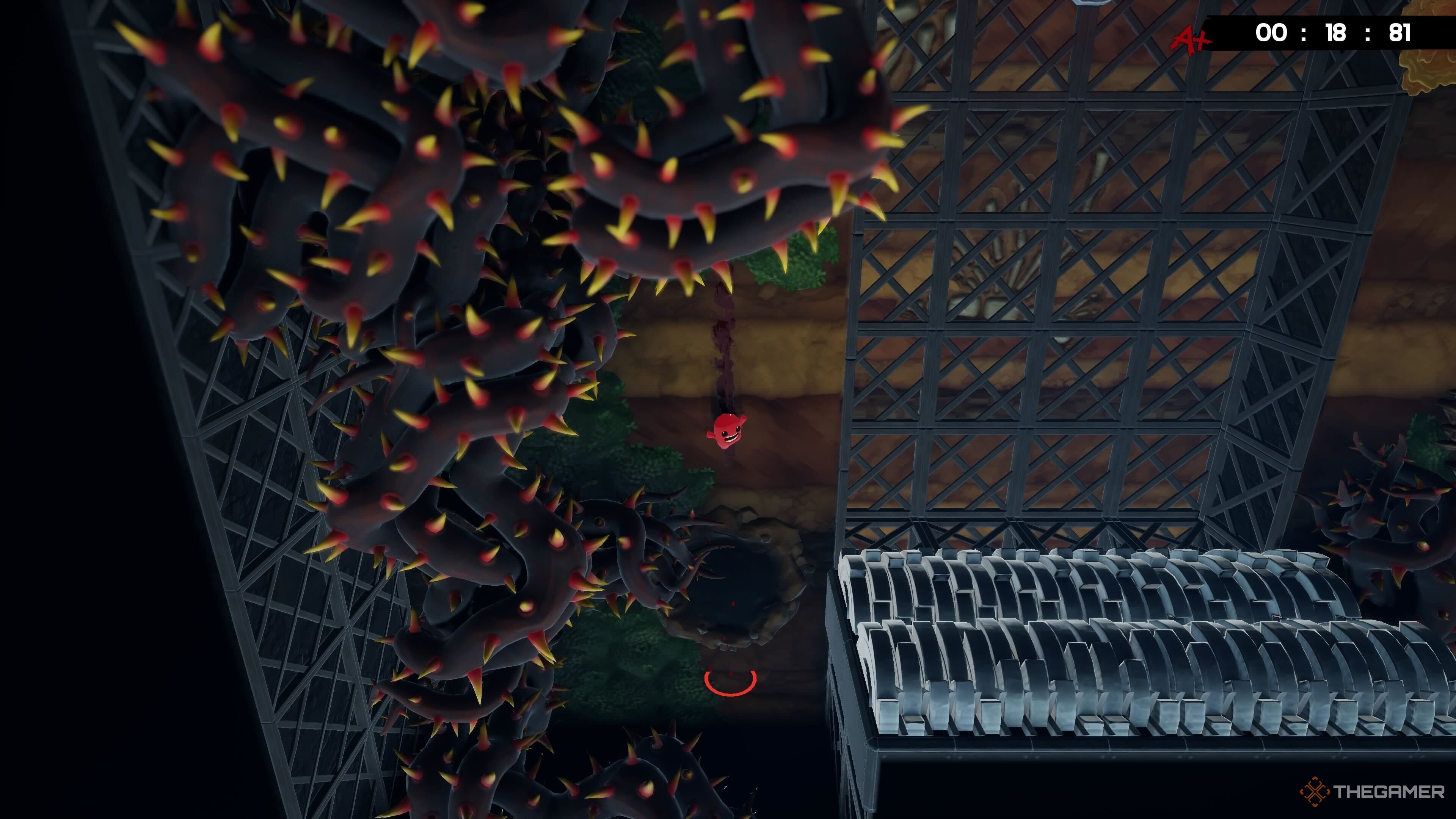 Окей, так, когда вы заканчиваете уровень, прямо перед тем, как сделать финальный прыжок к Bandage Girl, вам нужно прыгнуть на платформу слева. Там спрятан бинт, рядом с этими вращающимися пилами! Его легко пропустить, но оно того стоит.