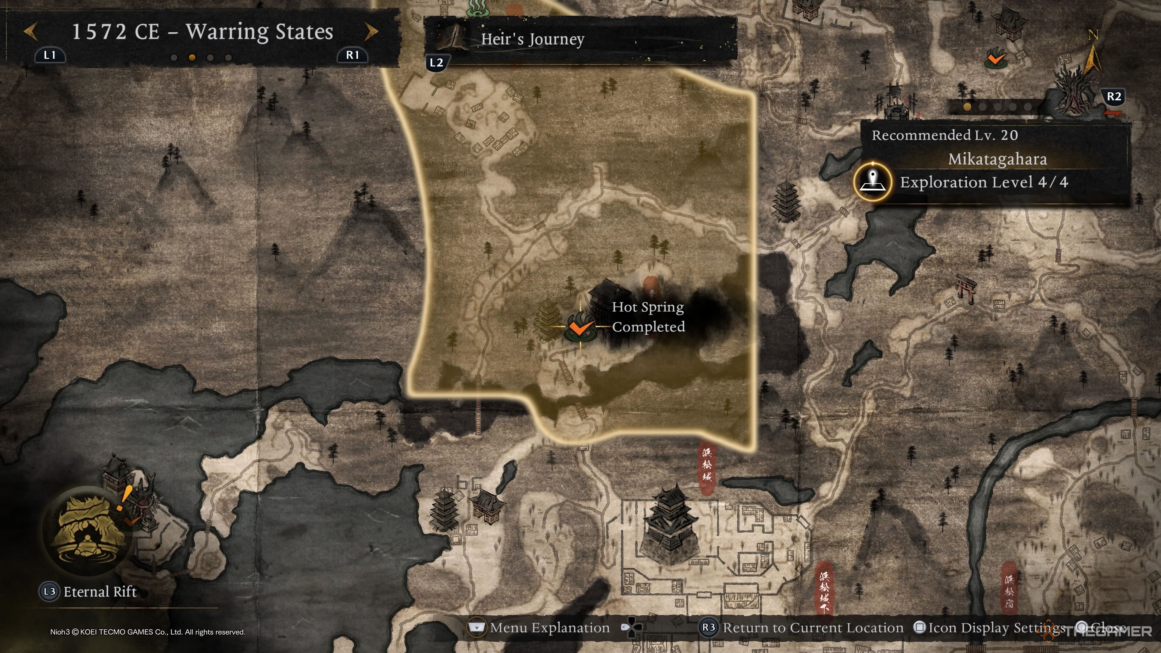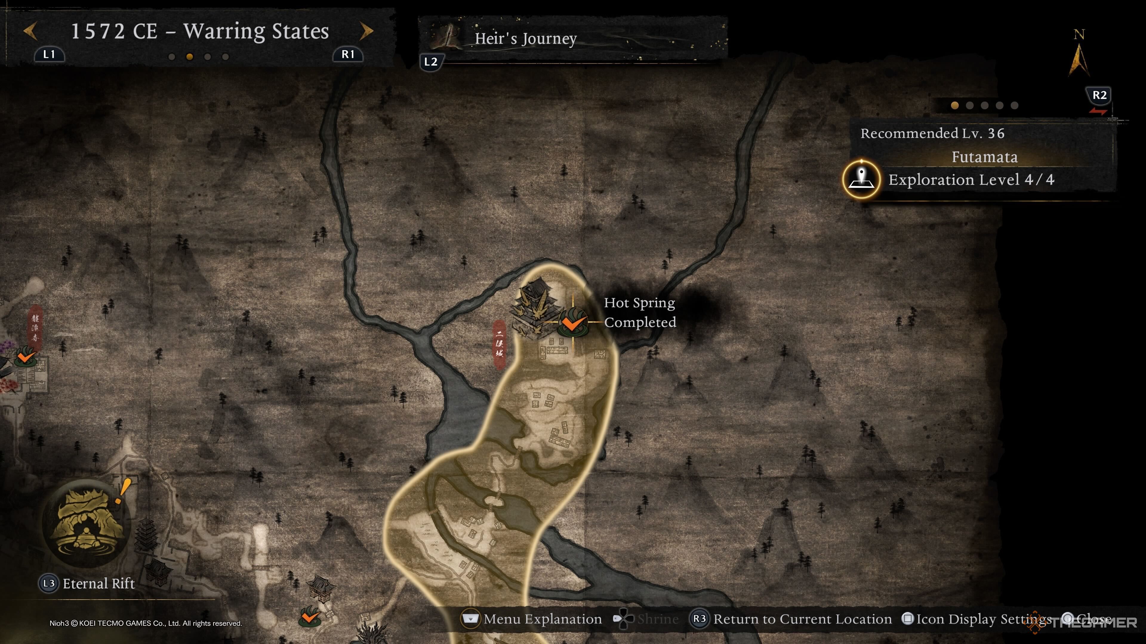 Последний горячий источник в области Воюющих Государств расположен недалеко от замка Футамата, в конце региона. Добравшись до святилища Оборонительных Ворот, посмотрите направо – вы увидите отверстие в стене, с которого открывается вид на горячий источник внизу. Чтобы добраться до него, спуститесь по лестнице и держитесь левой стены; это откроет скрытый путь, ведущий к горячему источнику.