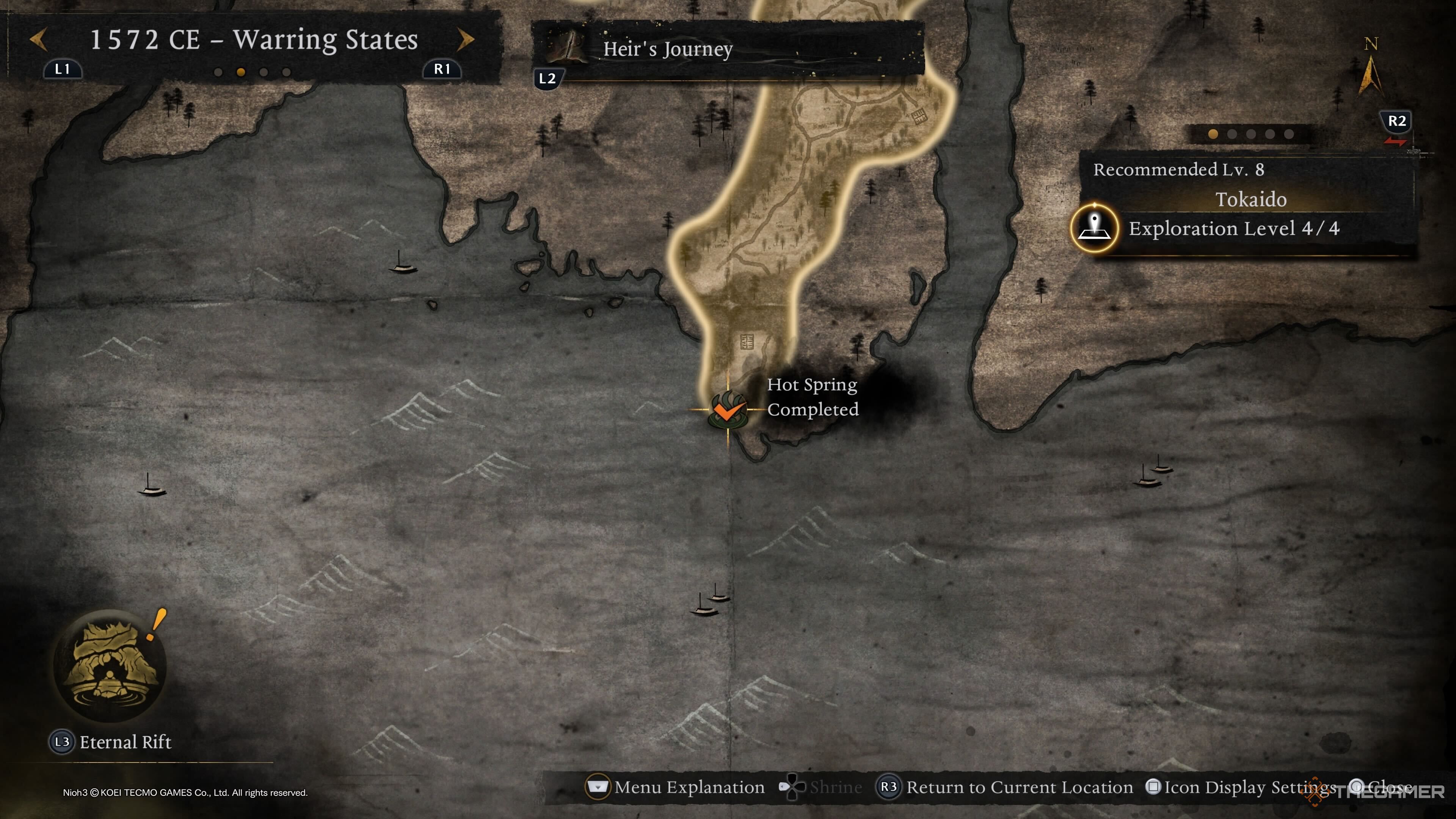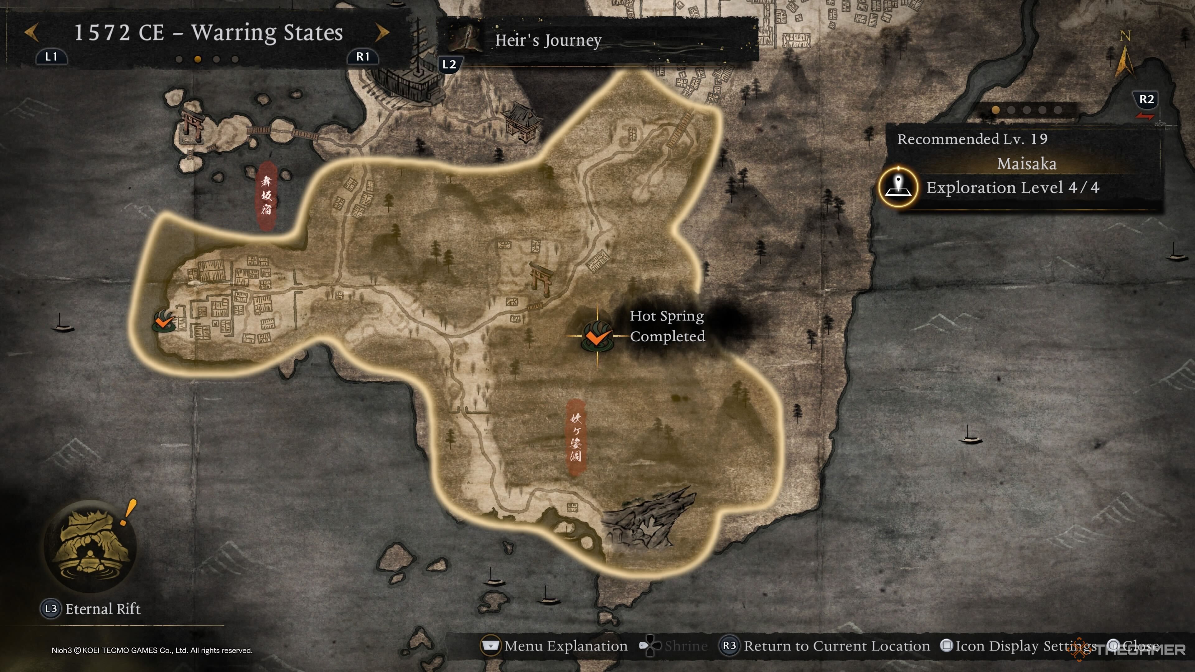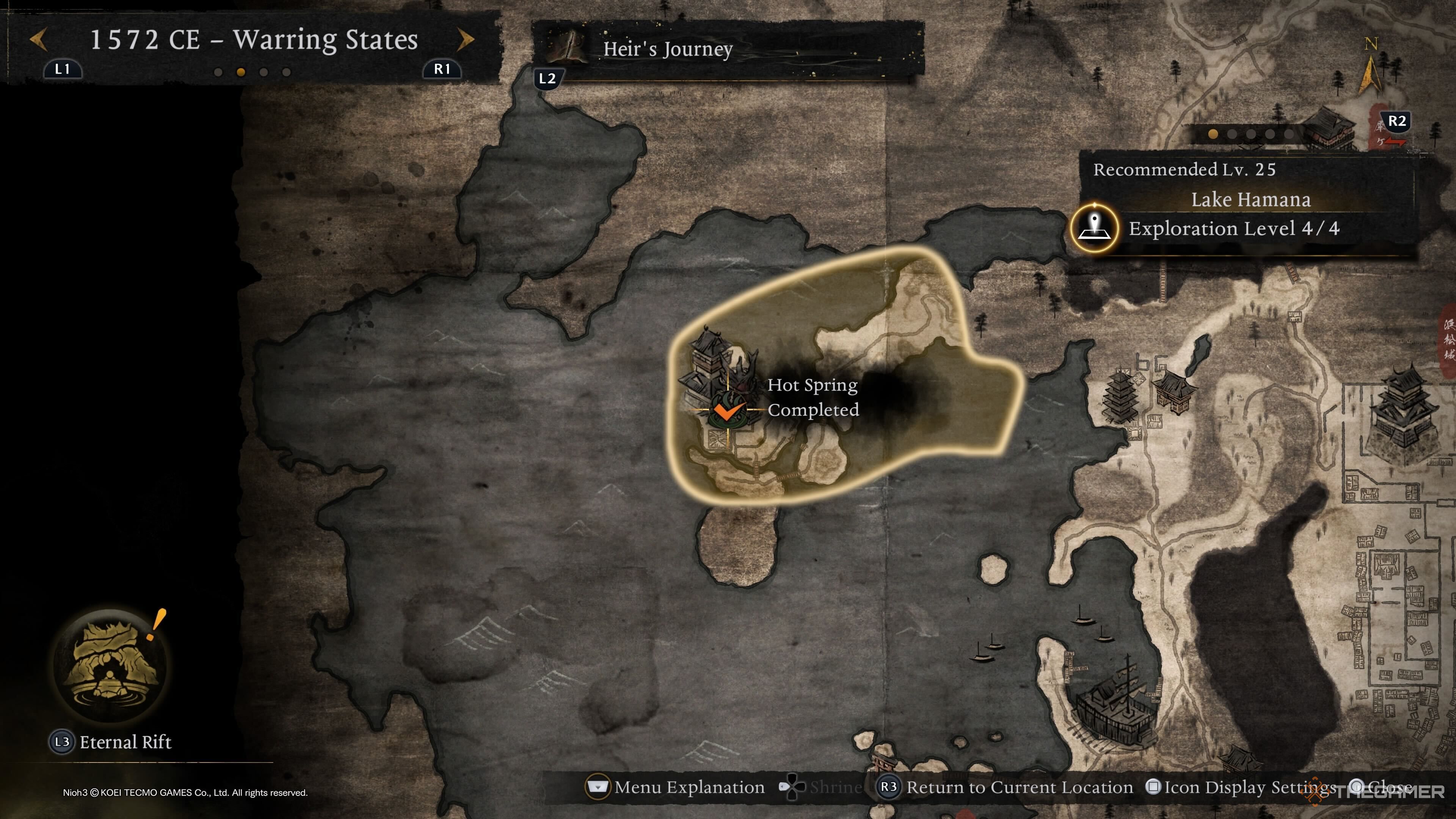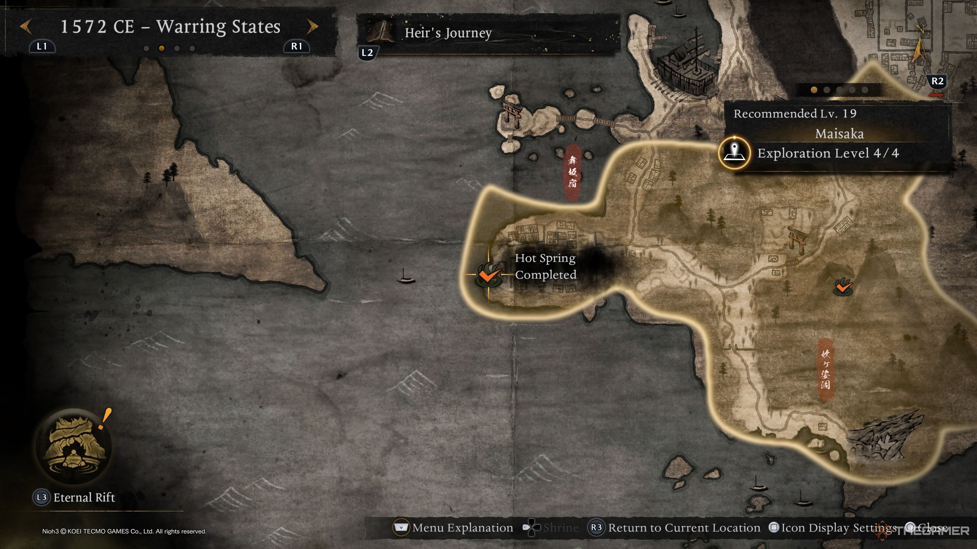 Горячие источники легко заметить благодаря красным духам Кодама, которые в них купаются, и их характерному зеленому свечению. Однако до них может быть сложно добраться! Многие скрыты за живыми стенами, называемыми Нурикабе, с которыми нужно взаимодействовать, используя кнопку R1 и тачпад, чтобы открыть их. Другие требуют выполнения определенных задач. Давайте изучим, как найти все горячие источники в регионе Воюющих Государств.