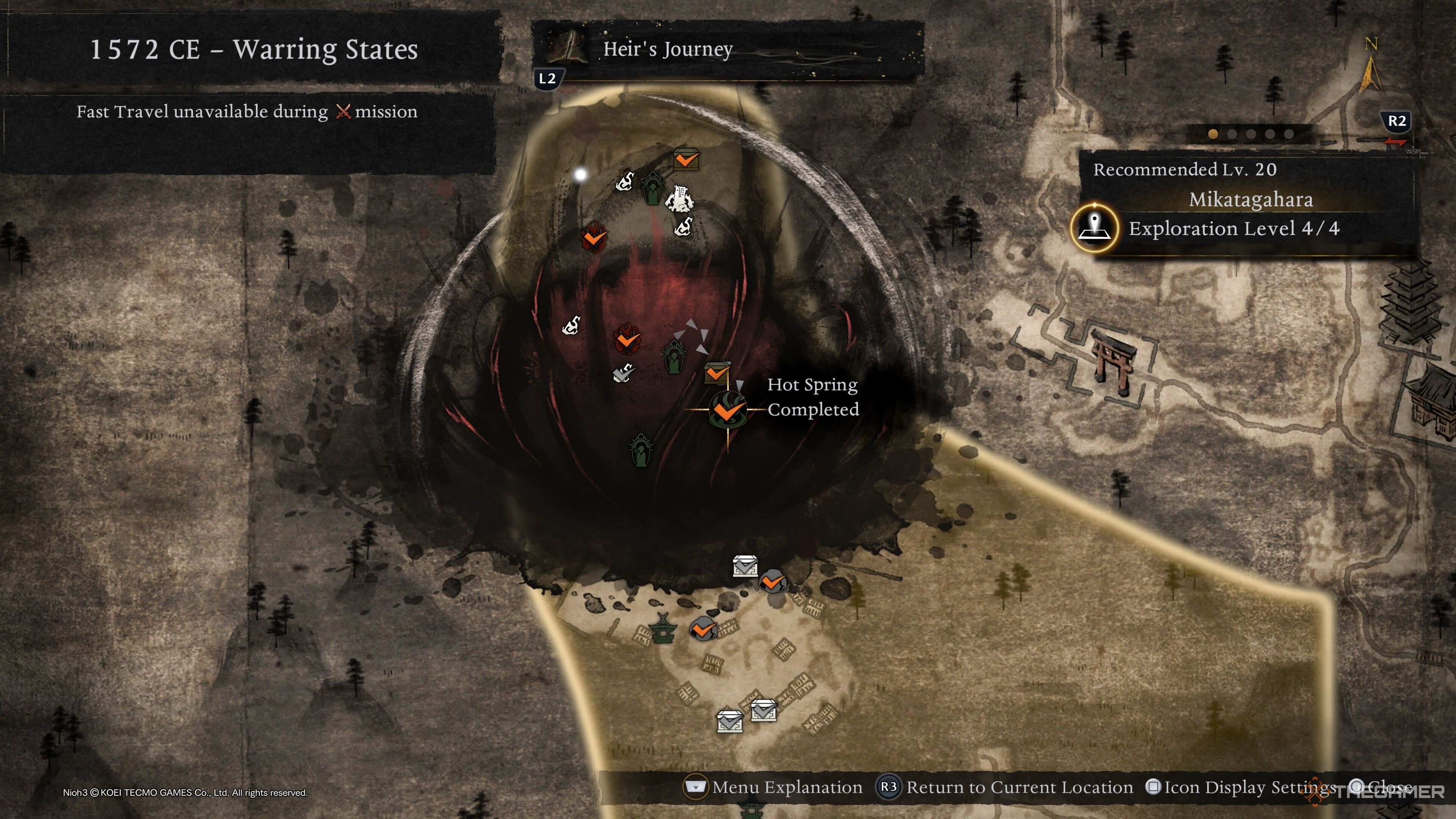 Определенные горячие источники становятся доступными после выполнения определенных заданий. Если вы уже завершили задание, вам, возможно, потребуется вернуться к нему, используя Свитки битв, чтобы открыть эти горячие источники. Мы будем четко указывать, какие из них требуют предварительного выполнения задания.