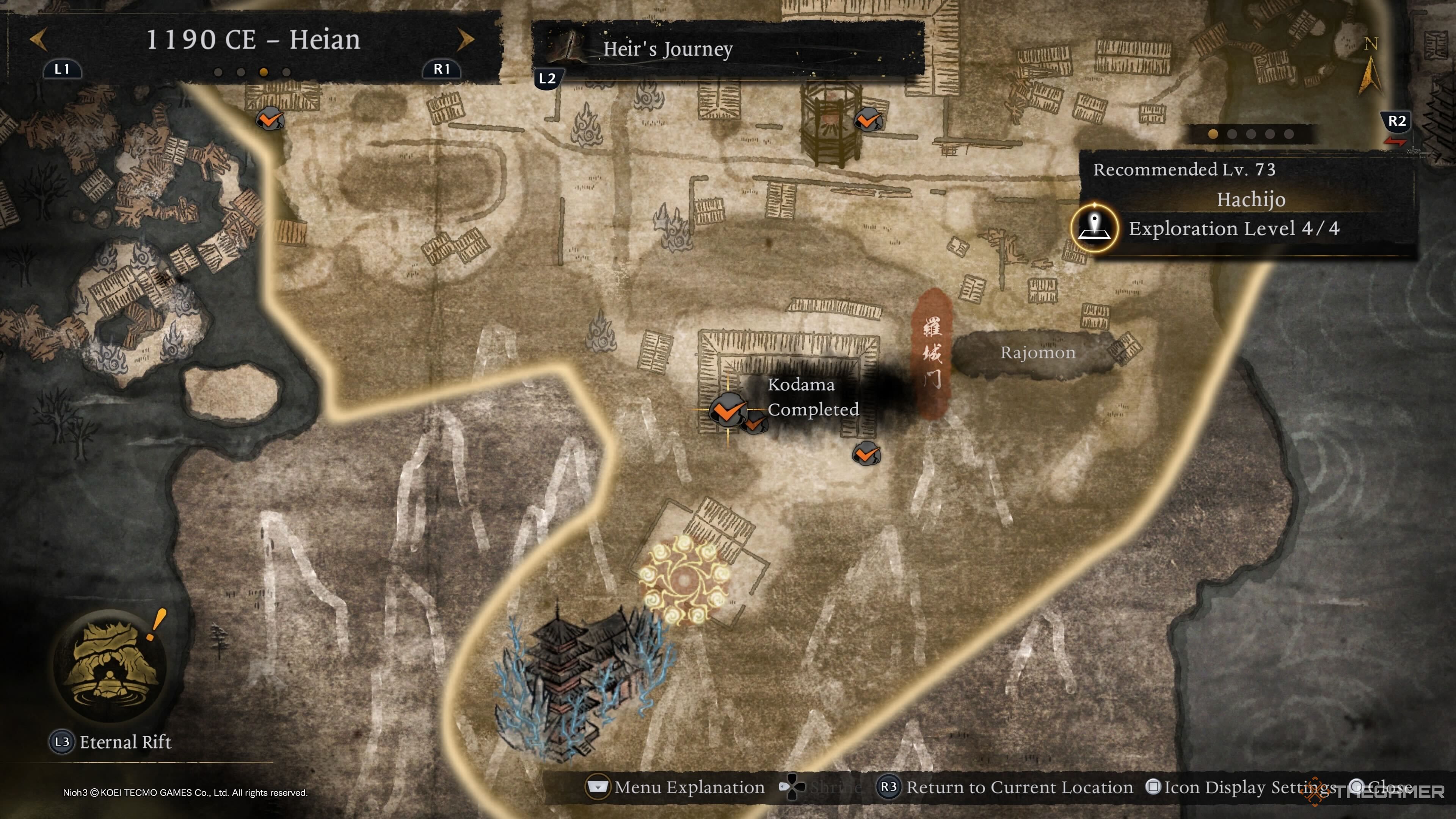 Следующие несколько Кодама можно найти в Раджомоне, до которого можно легко добраться от святилища Мибу-авеню. Чтобы найти первый, направляйтесь в область, отмеченную на карте выше, чтобы найти небольшую хижину. Кодама находится в комнате, скрытой за свитком на стене, сквозь который вы можете просто пробежать. |
