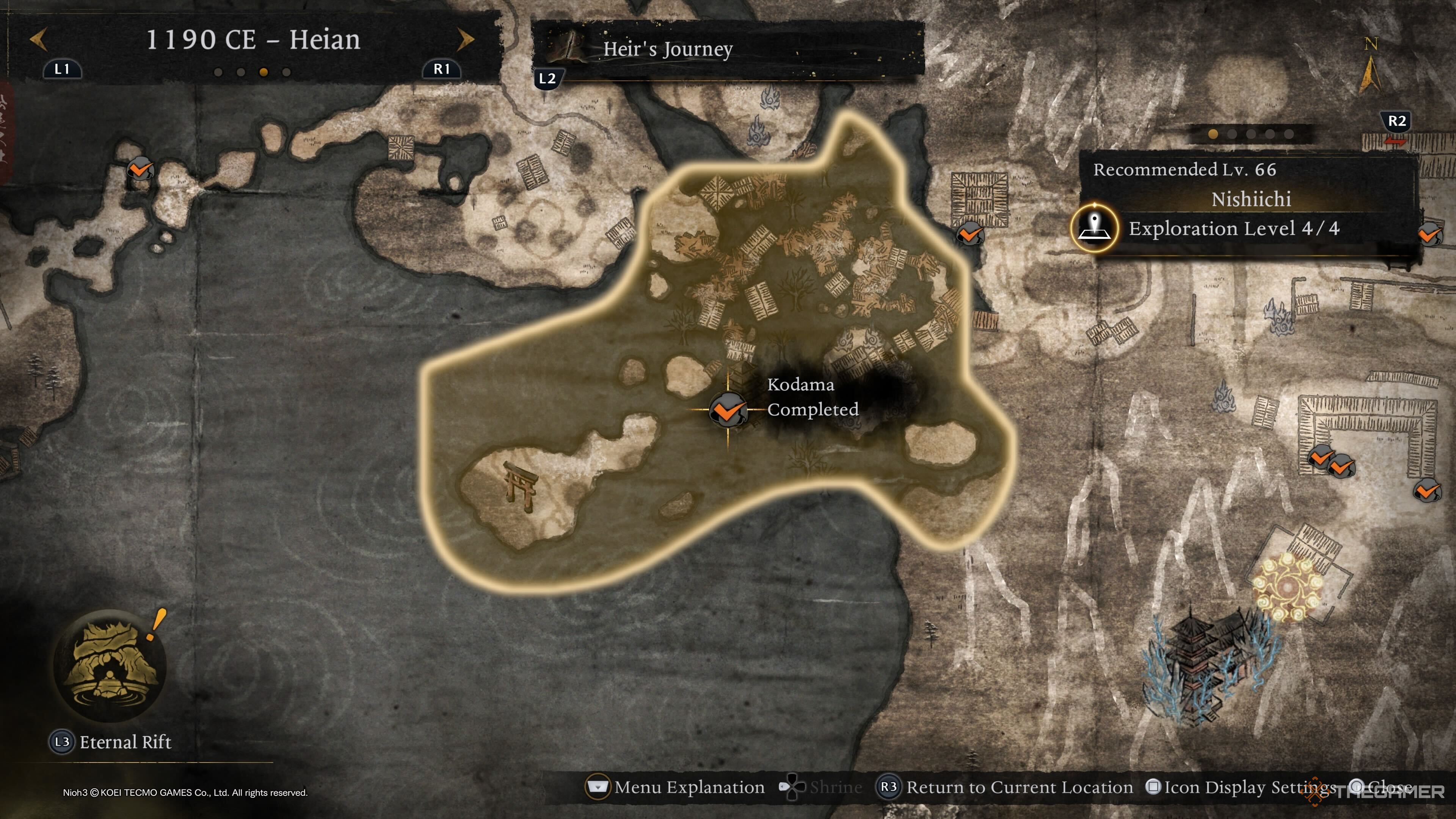 У Нишиичи всего один Кодама, и он находится в немного сложном месте. Единственный Святилище в этой области – Святилище Дрейфующего Форта, поэтому отправляйтесь туда после того, как отвоюете его у врагов. Оттуда используйте платформы, чтобы добраться до наклонного храма, и вы найдете Кодаму на втором этаже.