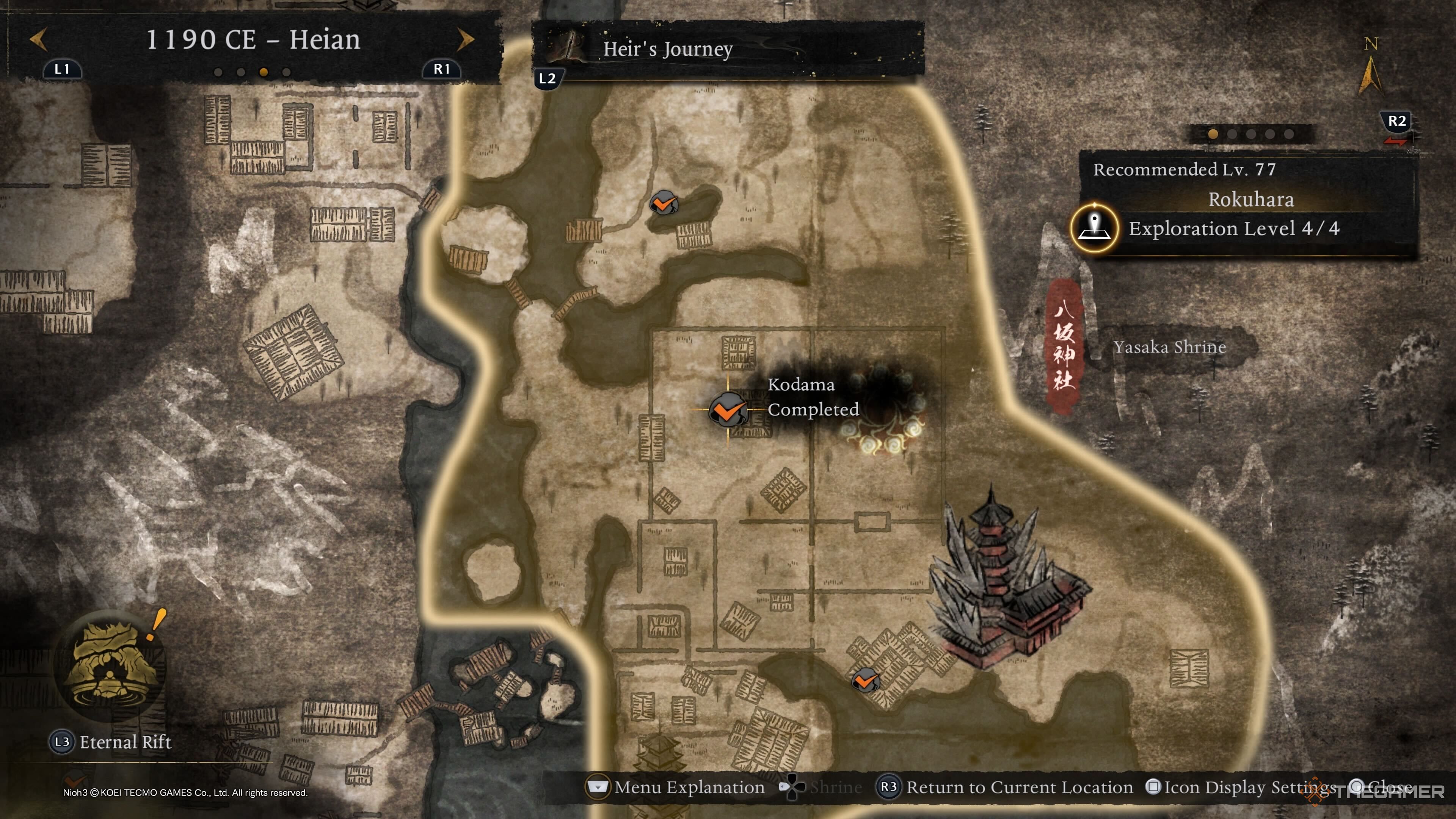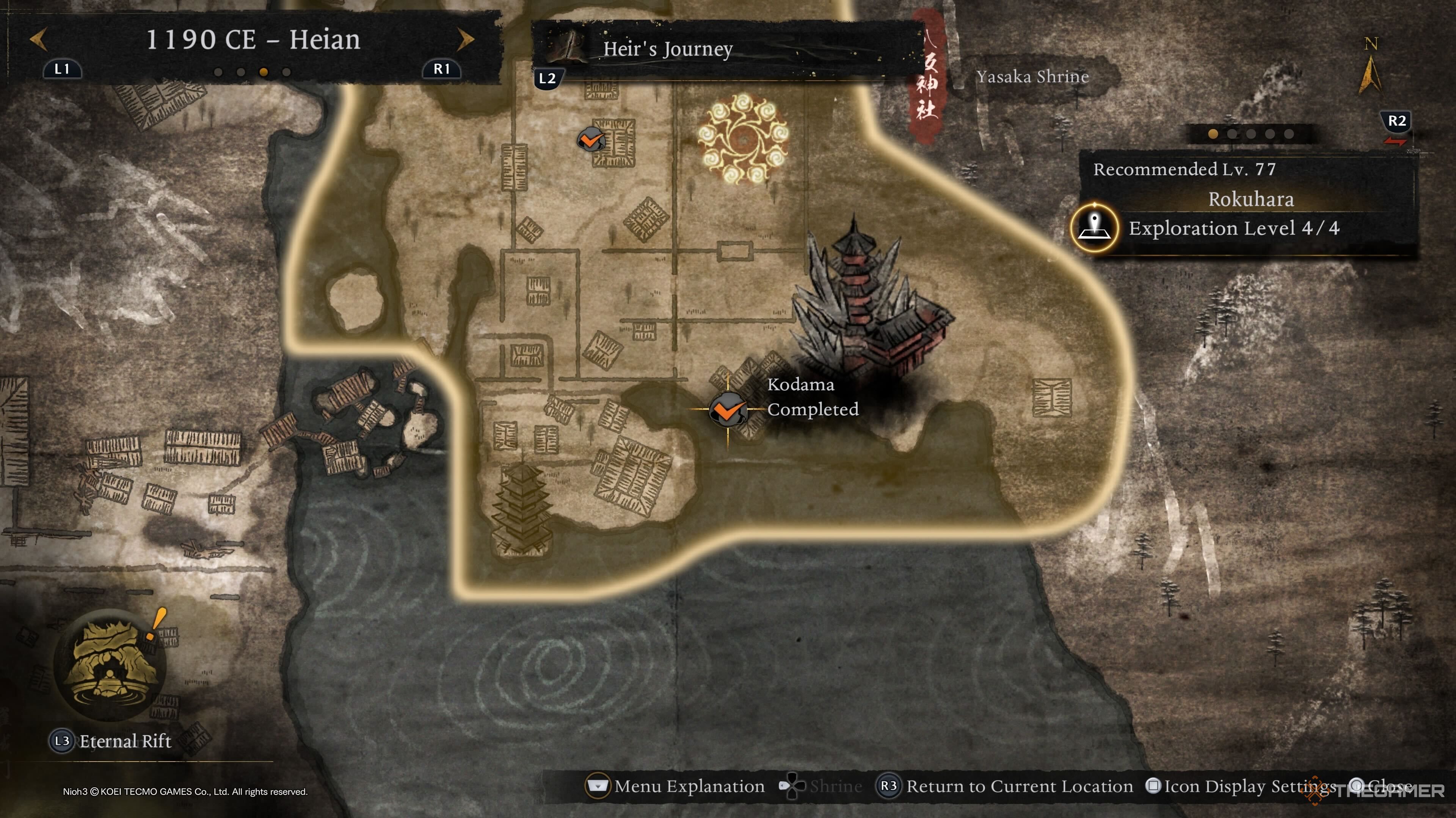 Третий Рокухара Кодама (и последний в период Хэйан в целом) находится на южном конце святилища Ясака: ворота Ниширо. Доберитесь до области, отмеченной на карте выше, а затем поднимитесь на вершину храма с лестницами. Как только вы сможете подняться на крышу, спрыгните и затем идите налево, чтобы использовать здание с зеленой крышей, чтобы добраться до Кодамы, который спрятан на другой стороне крыши храма. |