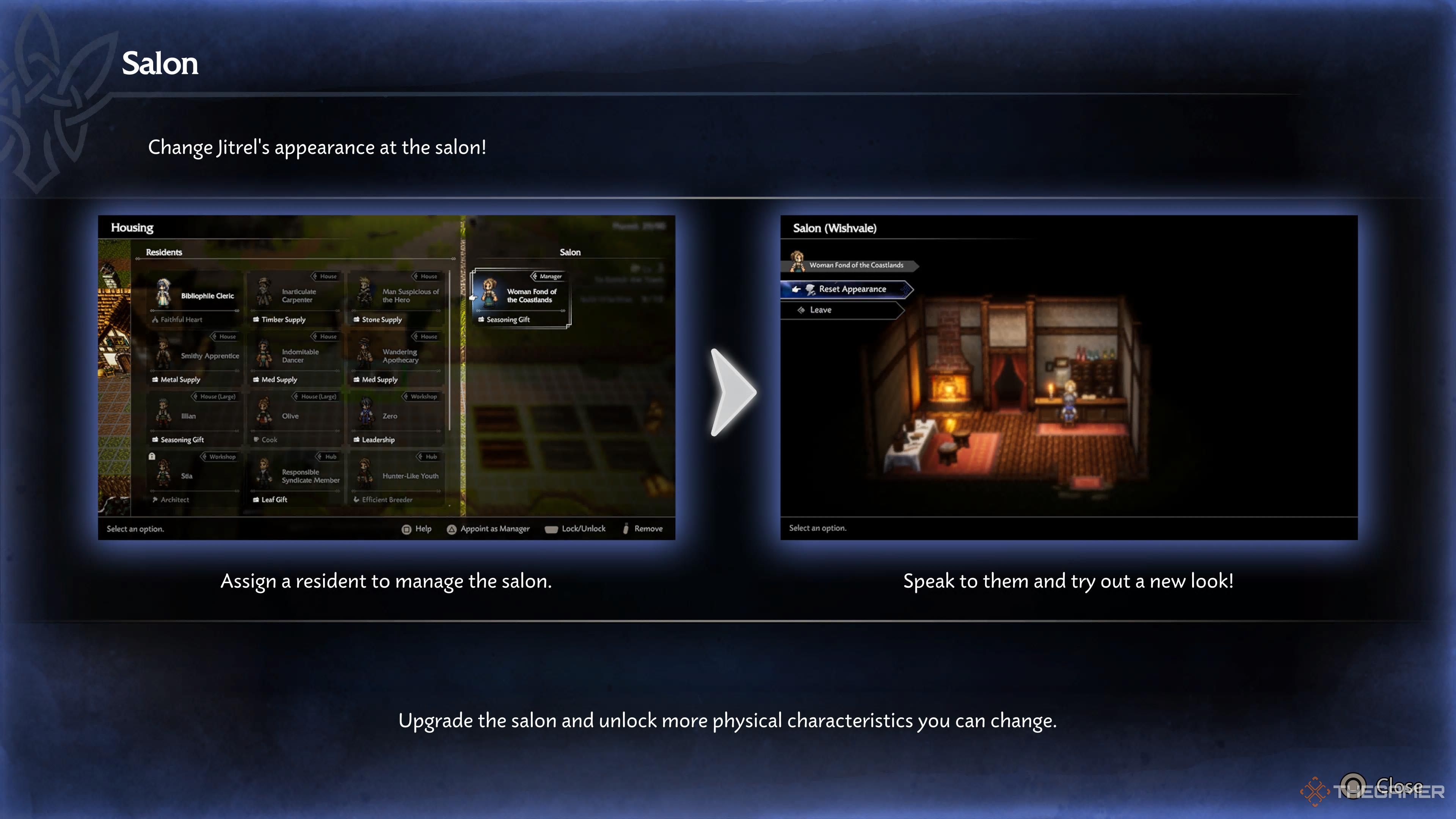 Салон позволяет вам полностью изменить внешний вид вашего персонажа, а также добавлять ещё больше возможностей настройки по мере его улучшения. Когда вы впервые получите Салон, вы сможете изменить причёску своего персонажа – как стиль, так и цвет – и сразу же разблокируете два дополнительных стиля и цвета на выбор.