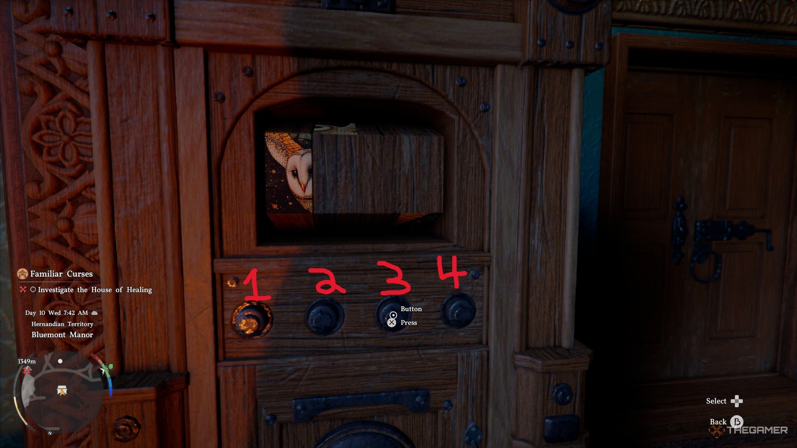 Поднимитесь по лестнице на второй этаж и войдите в первую дверь слева. Вы найдёте головоломку у стены возле окна. Чтобы решить головоломку, вам нужно повернуть четыре части, чтобы завершить изображение совы на передней панели. Нажмите на четыре кнопки в правильном порядке, чтобы выровнять части и завершить изображение.