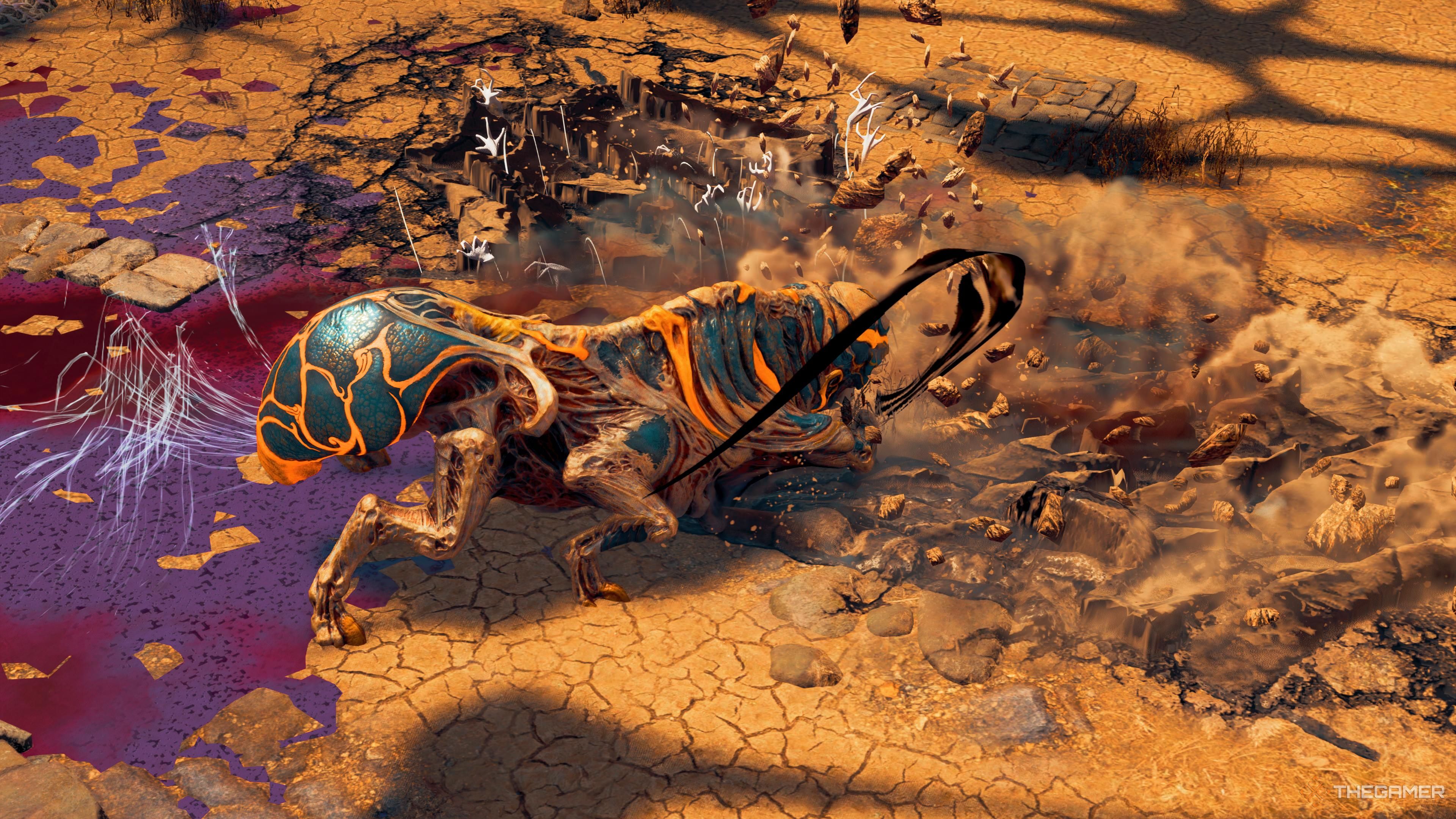 Время от времени Батсу выпускает медленные огненные шары, которые преследуют вас. К счастью, вы можете рассеять их, ударив их прежде, чем они коснутся вас. Главный прием Батсу — это мощный топот, который поднимает землю под вашими ногами, заставляя вас медленно двигаться в зоне воздействия. Но если вы выполните финальную версию своей танцевальной атаки Ока, это поможет вам уйти из зоны поражения. Наконец, Батсу выдыхает пламя, постепенно поворачиваясь, в результате чего зверь движется медленно, что дает вам широкие возможности атаковать его в спину.